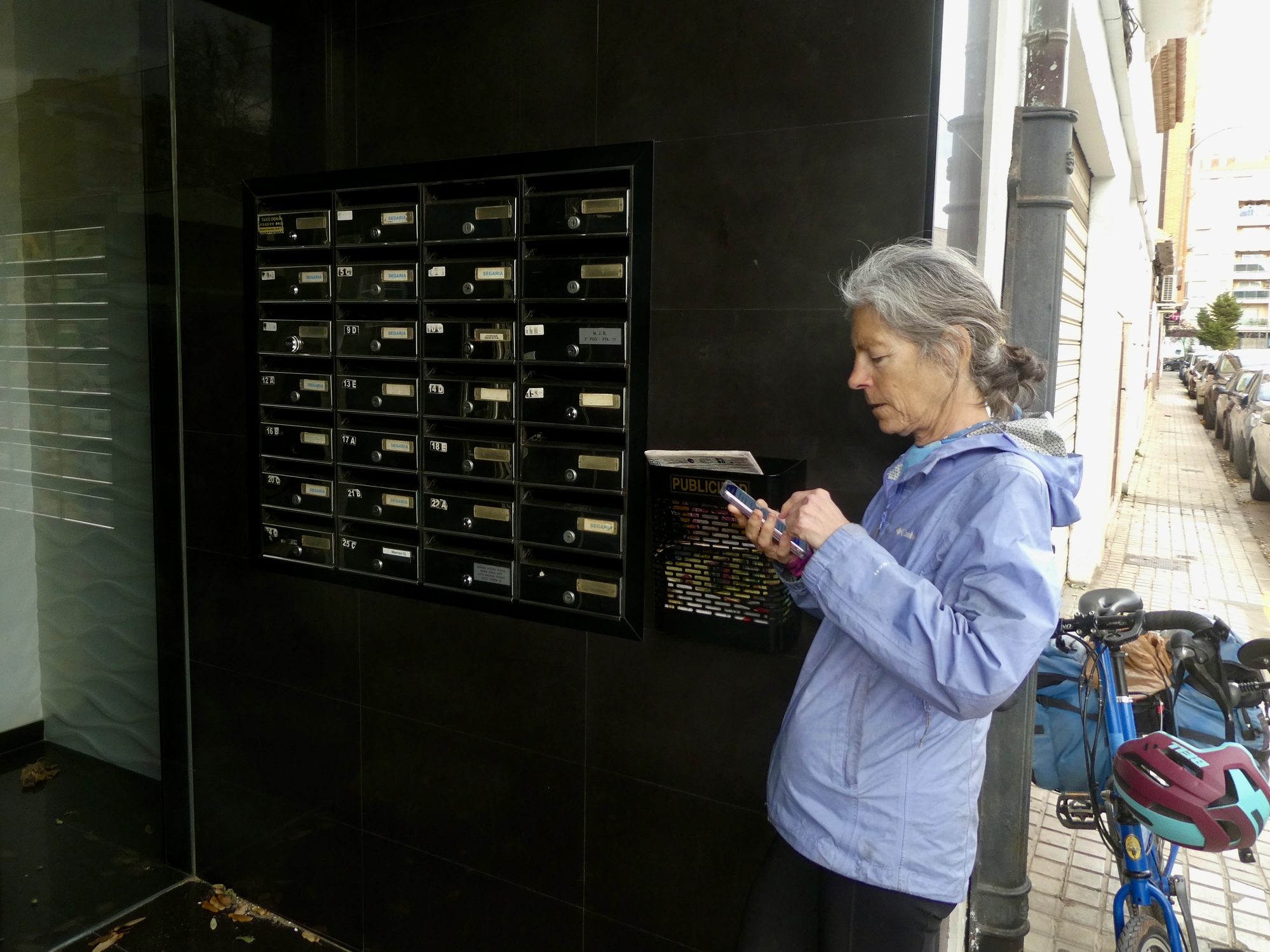 Arrival at our apartment is an unexpected fiasco. We registered online and received check in instructions several days ago, but the instructions don’t match the reality that greets us when we come to our six floor apartment building. They instruct us to open the black key box with the provided code, but there’s no black key box. There’s just an array of 25 mail boxes, and we haven’t even been given a name or number so we don’t know what room is ours anyway. The building door is ajar, so I check out every door on every floor of the six story building, finally returning to tell Rachael that none of them has a black key box.