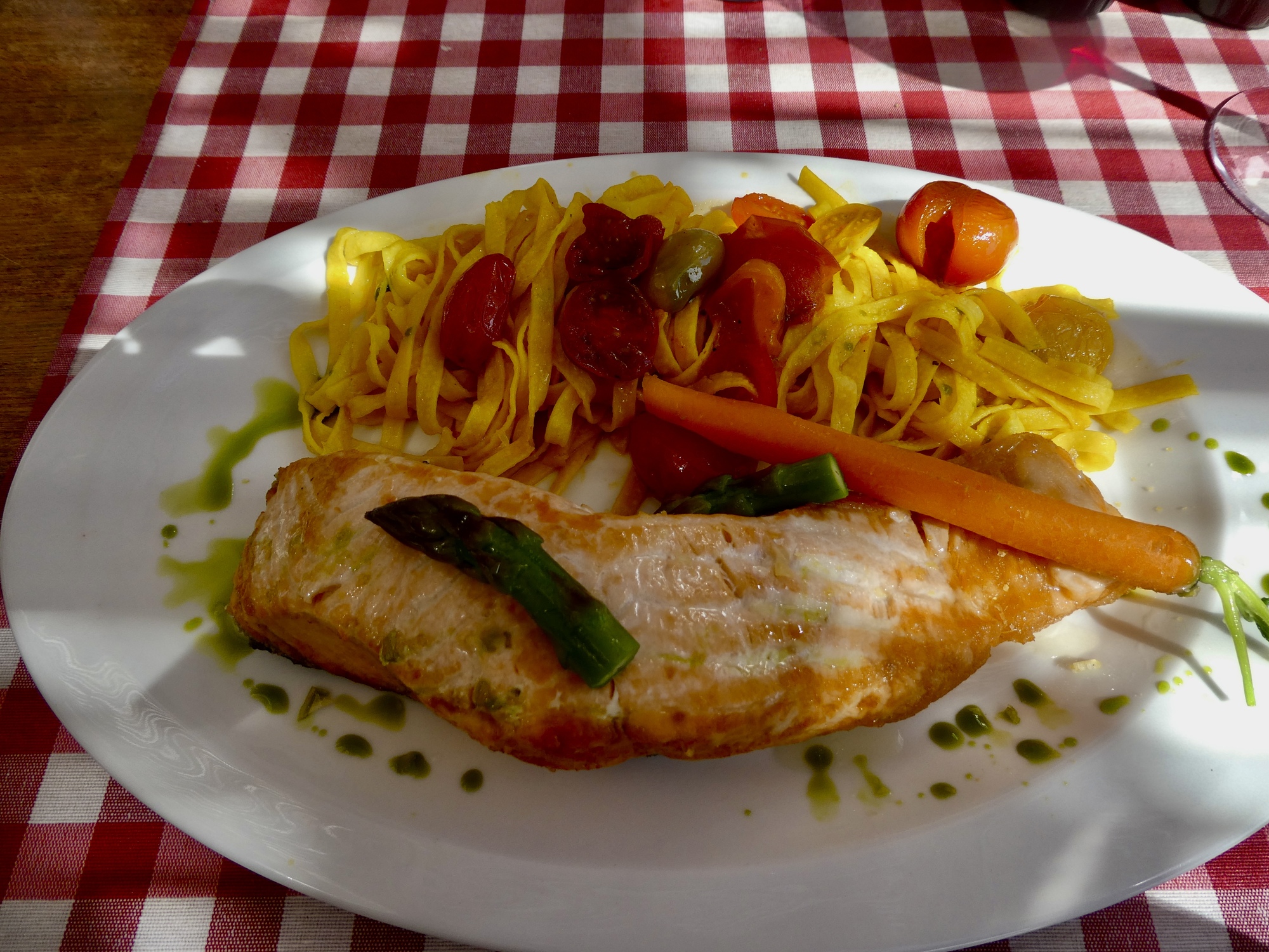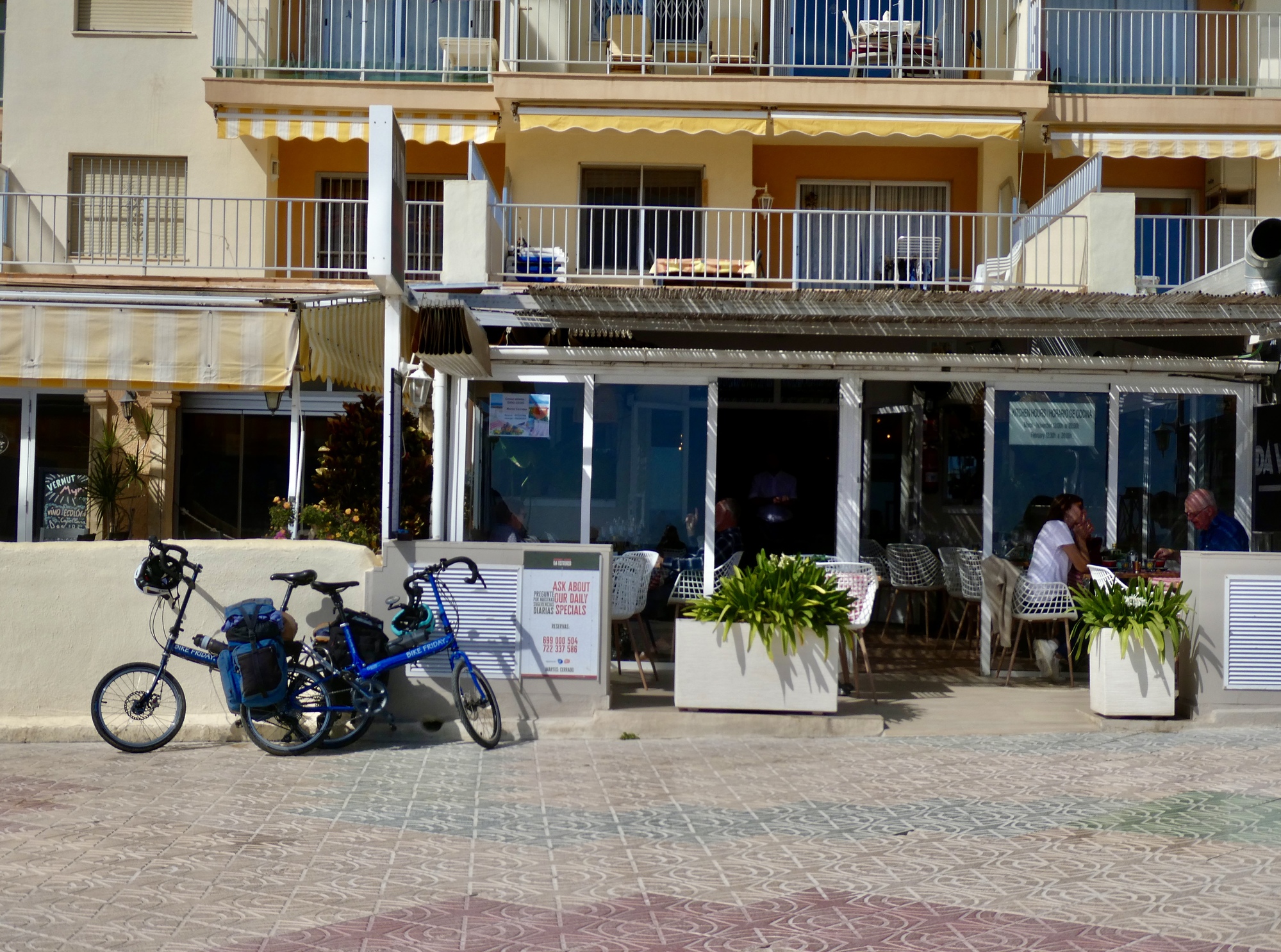 And then in another mile we arrive at the eastern half of Calpe, the half on this side of the Big Rock. We slowly bike down its colorfully tiled waterfront promenade, weaving around walkers and other bikers while taking in the views on one side and the restaurants on the other. It’s just turning one when we double back to the first open restaurant we passed, park our bikes, and step inside for lunch. They’re just opening up for lunch and we’re their first customers of the day, so we’re given the best seat in the house.