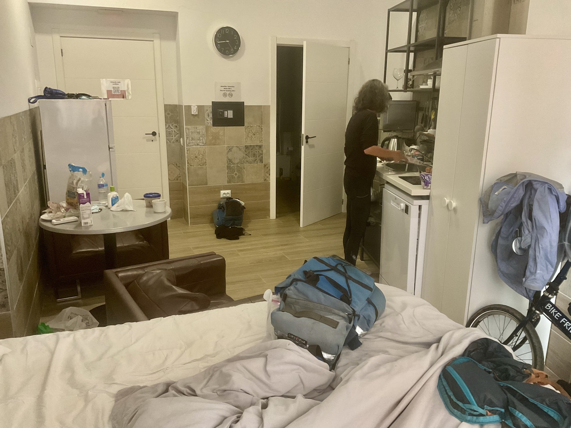 It’s a small, wedge-shaped apartment; a little cramped, but gives us all we need for our two night stay. One bike fits in along the back wall of the bathroom, and the other gets wedged by the wall along the foot of the bed.