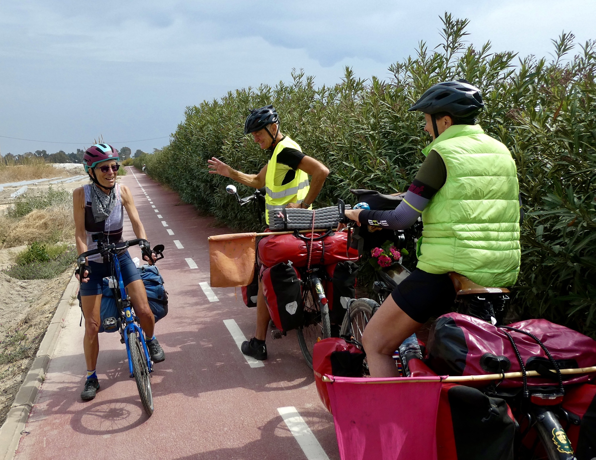 We’re on the EV8 and pass plenty of cyclists today, including pannier-bearing travelers from Germany and Poland. This couple stopped to chat long enough for us to learn a bit more. They’re Germans also, on their long way home from a tour that began in Marrakech.