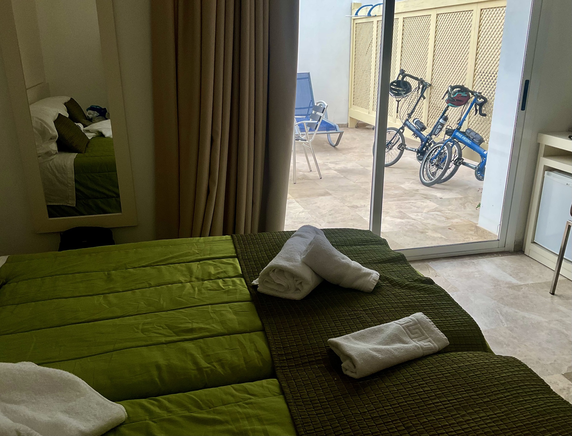 We arrived at the apartment address having heard nothing more. The door doesn’t have anything identifying it as a lodging facility - no name, no number to call, nothing. It’s just a locked door. So we look up our booking reservation for a number to call, and see that we actually did receive a message not long earlier. There’s a request for passport information, and a lockbox code is provided as well as a telephone number. But there’s no lockbox; and when we call, there’s no answer. We give it some time - ten or fifteen minutes - ten or fifteen bone-chilling minutes, because we’re standing on the street in a 25 mph wind - when I finally assert my occasional right to claim ‘the hell with this crap’ and give up on the place. We’ll work it out with Booking later, but for now we bike two blocks to the nearest hotel, the Senderos, and buy ourselves a room for the next two nights.