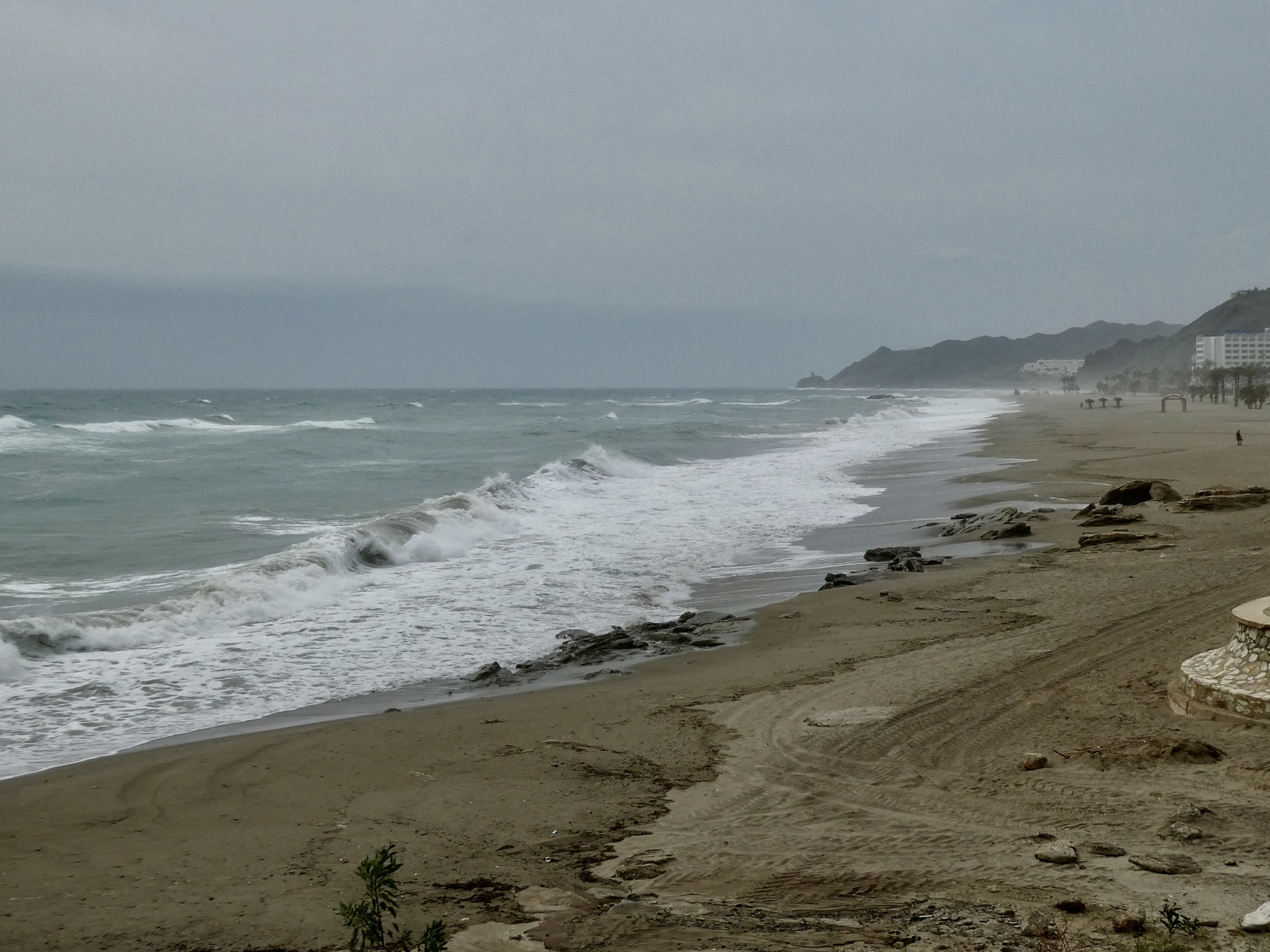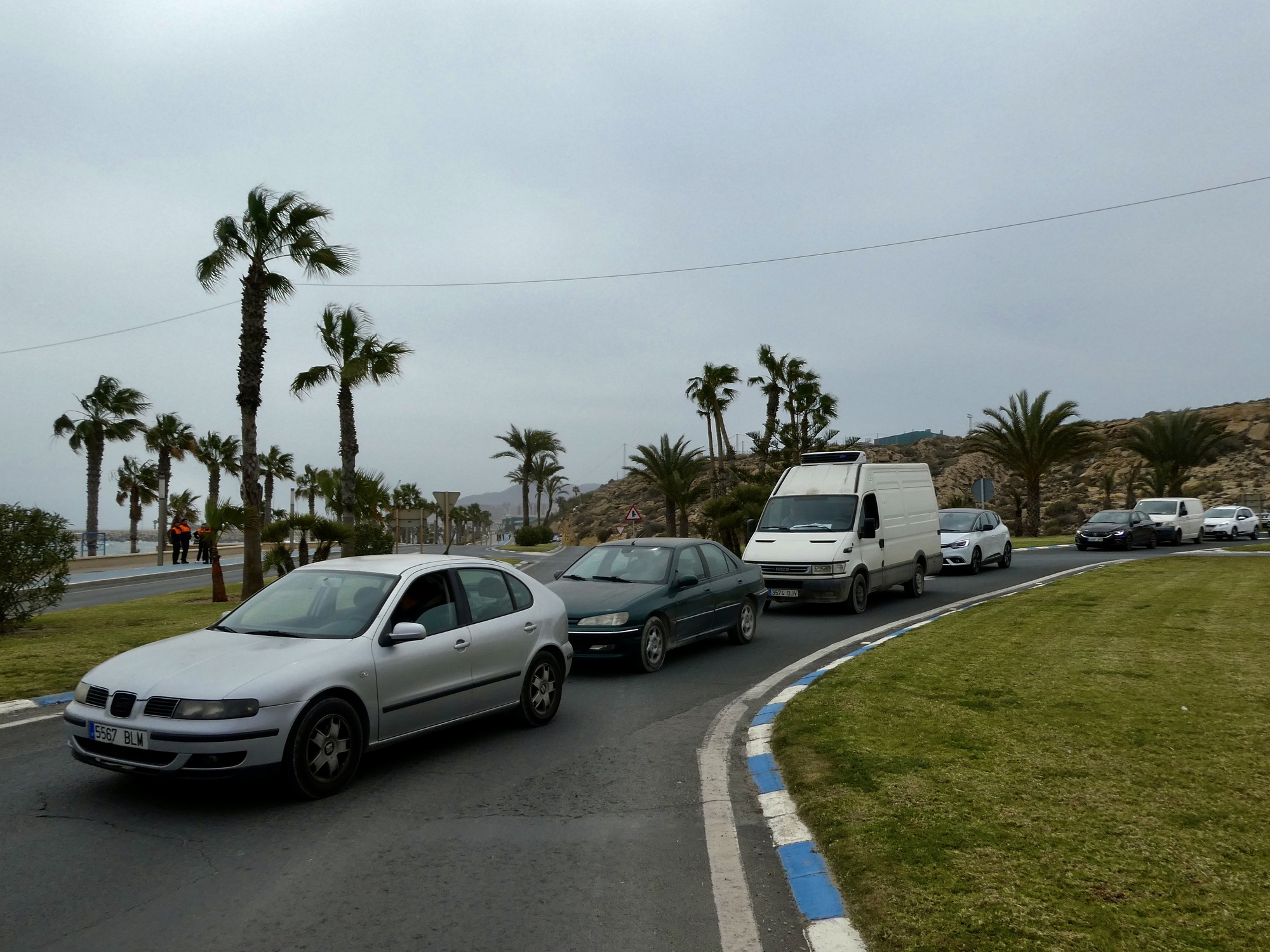 Down from the top, the next four miles are a flat downwind blast to and through Carboneras. At least we would be blasting through the town if it weren’t inexplicably a complete zoo with the seaside road and promenade jammed with slow-moving folks. It really isn’t an inviting day to be out on the beach, so something big must be going on.