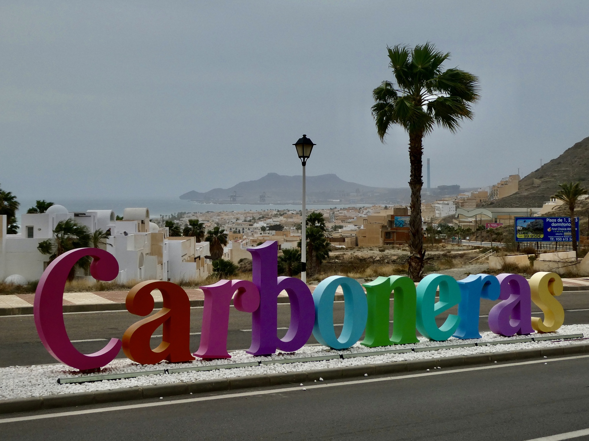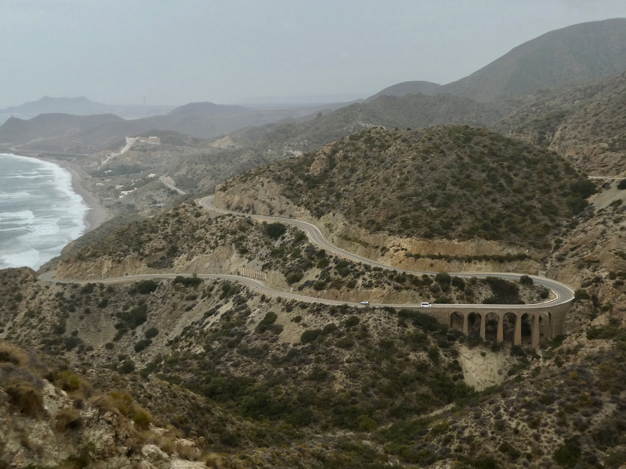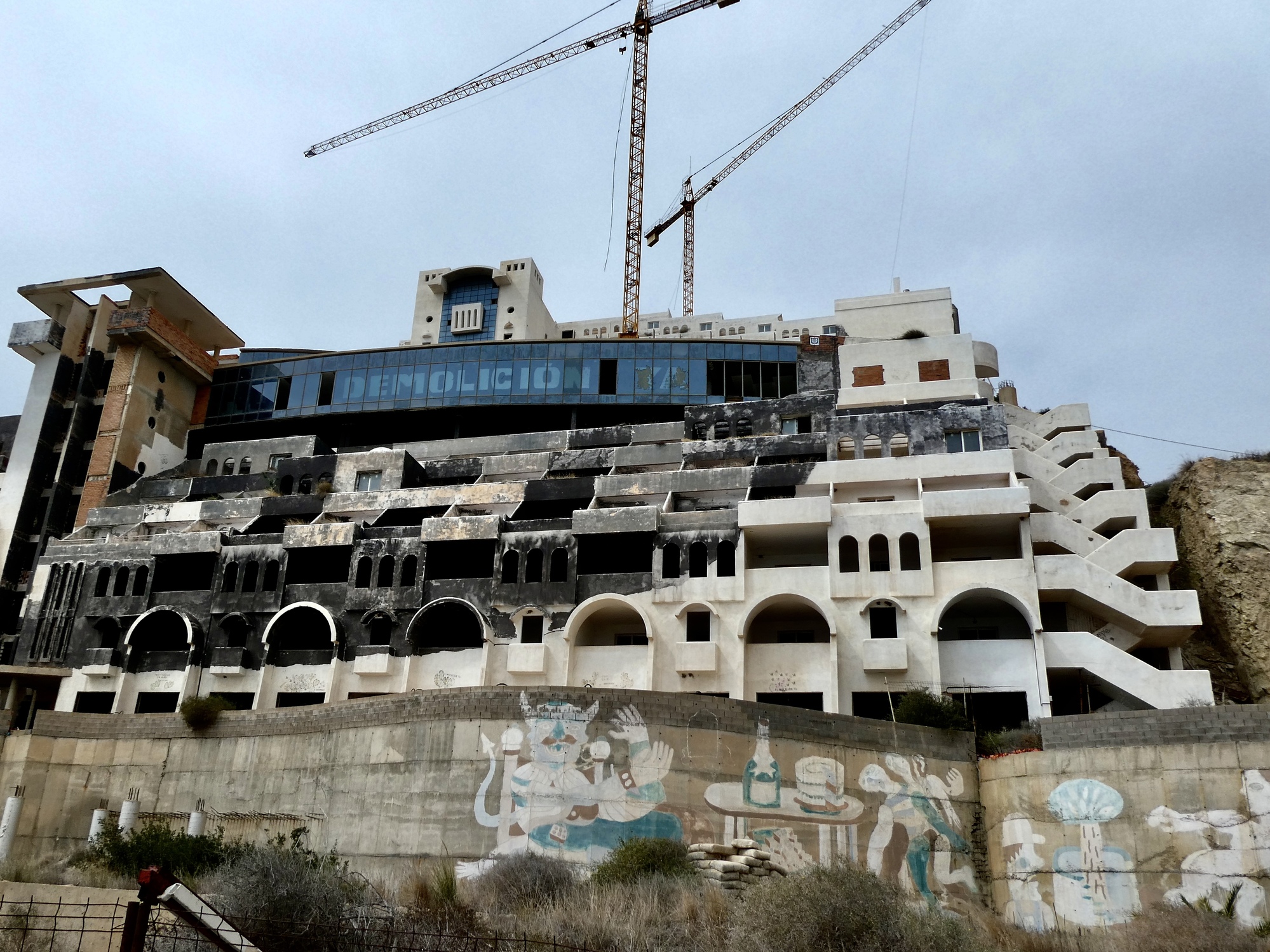 Down at last, our next point of interest is a monstrous white ruin, the shell of some large complex missing all its windows, liberally tagged with graffiti, and with DEMOLICIO spelled out boldly across its top. A perplexing scene, and I’m grateful to the Grampies for finding this article explains its story. This is the remains of El Abarrobico, a mega-resort complex that was built in a prime location within Cabo de Gata-Níjar Natural Park, one of the largest protected nature reserves in Western Europe. Thanks largely to a relentless multi-year campaign by Greenpeace and others, the preservationists finally won out over the developers and their political friends and the property is destined for demolition.