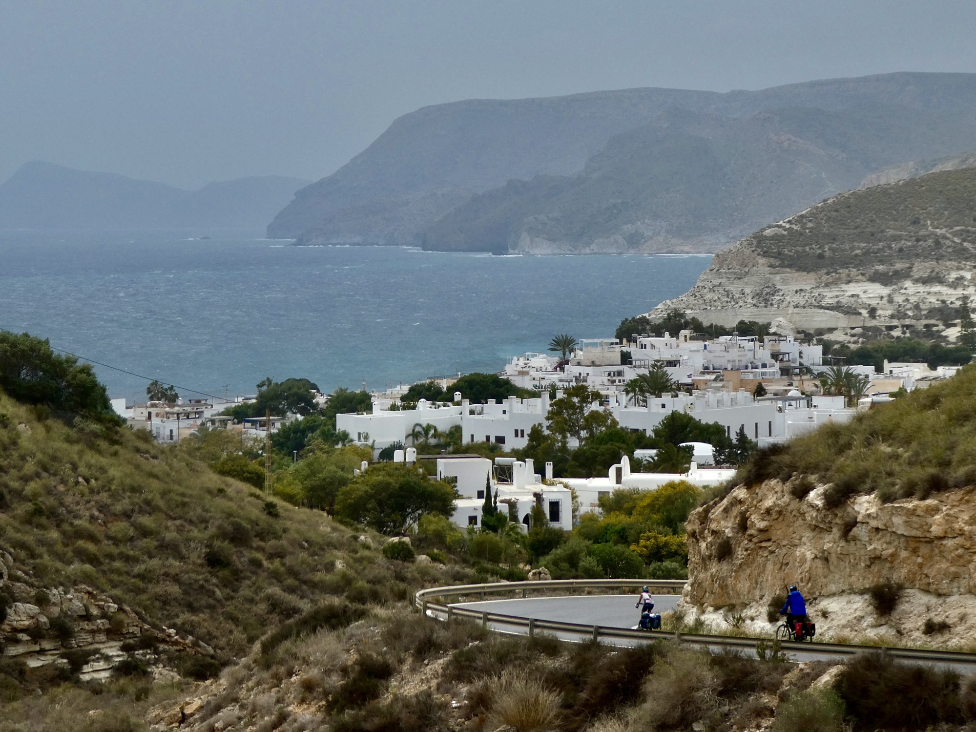 There’s more to be said about the weather down the road, but this will do for setting the stage for today’s ride down the coast to Agua Amarga. Its terrain you’ll likely recognize, as it’s the identical stage The Grampies rode a month ago. And it really is virtually identical, because we stayed in the same hotel here in Mojácar Playa, and their hotel in Agua Amarga is only two blocks from the apartment we’ve booked there.
