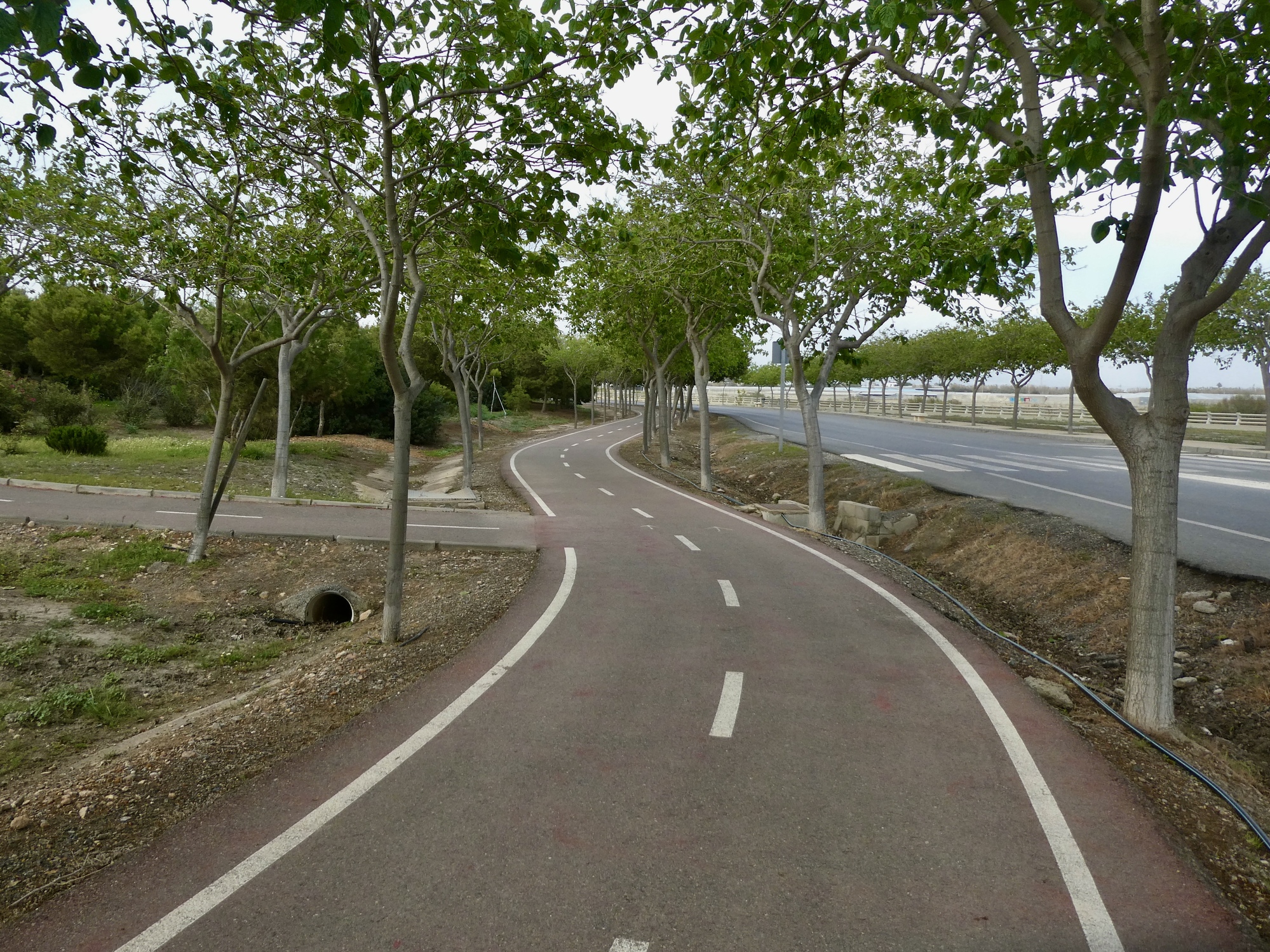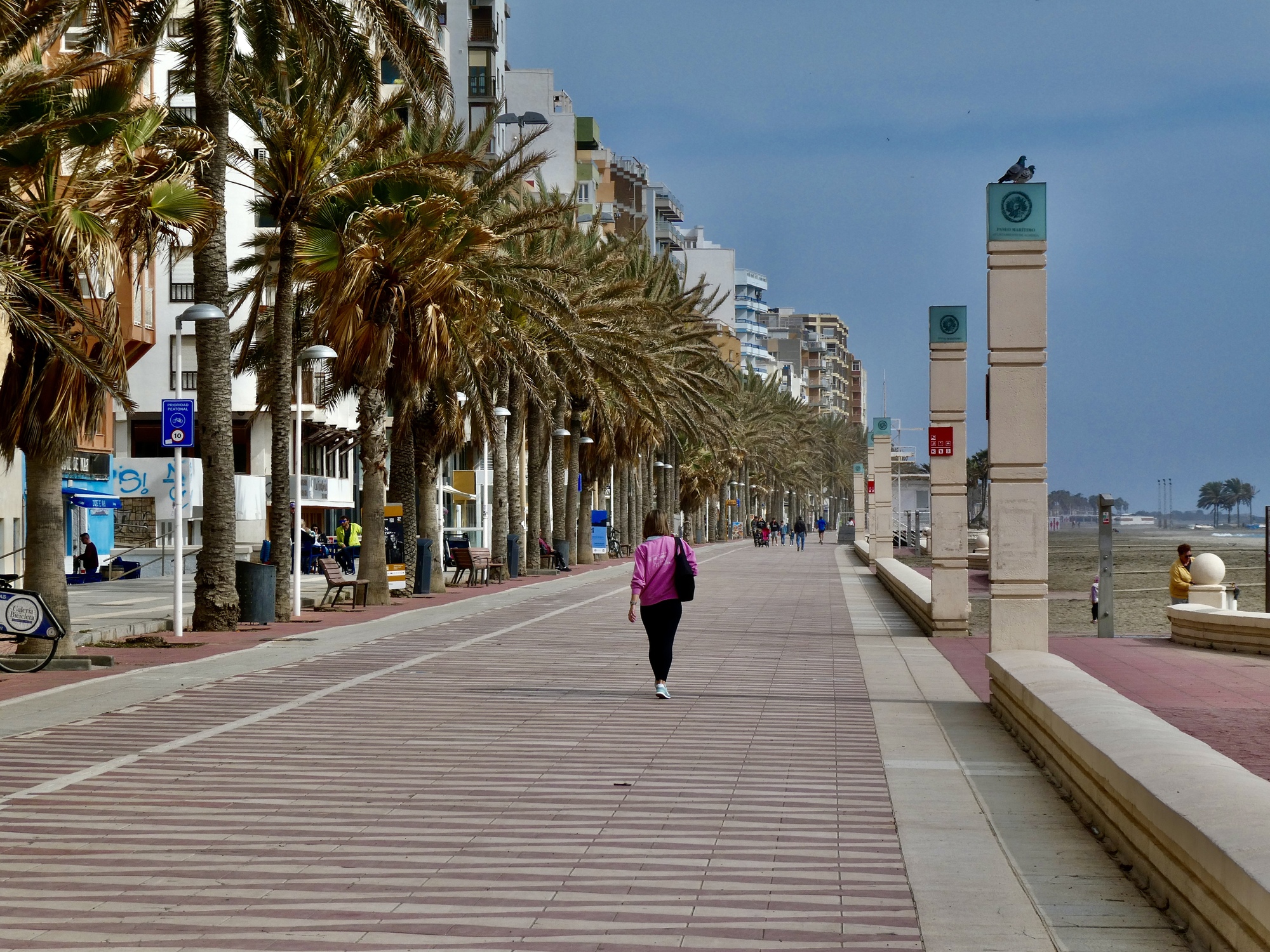 I’ve got a very easy ride in mind: three miles along the waterfront back east to the small delta at the mouth of the also small Andarax River, because it’s the place that looks like the most promising close-in birding spot. I enjoy the ride down the waterfront, which is a much quieter scene today than when we biked in.
