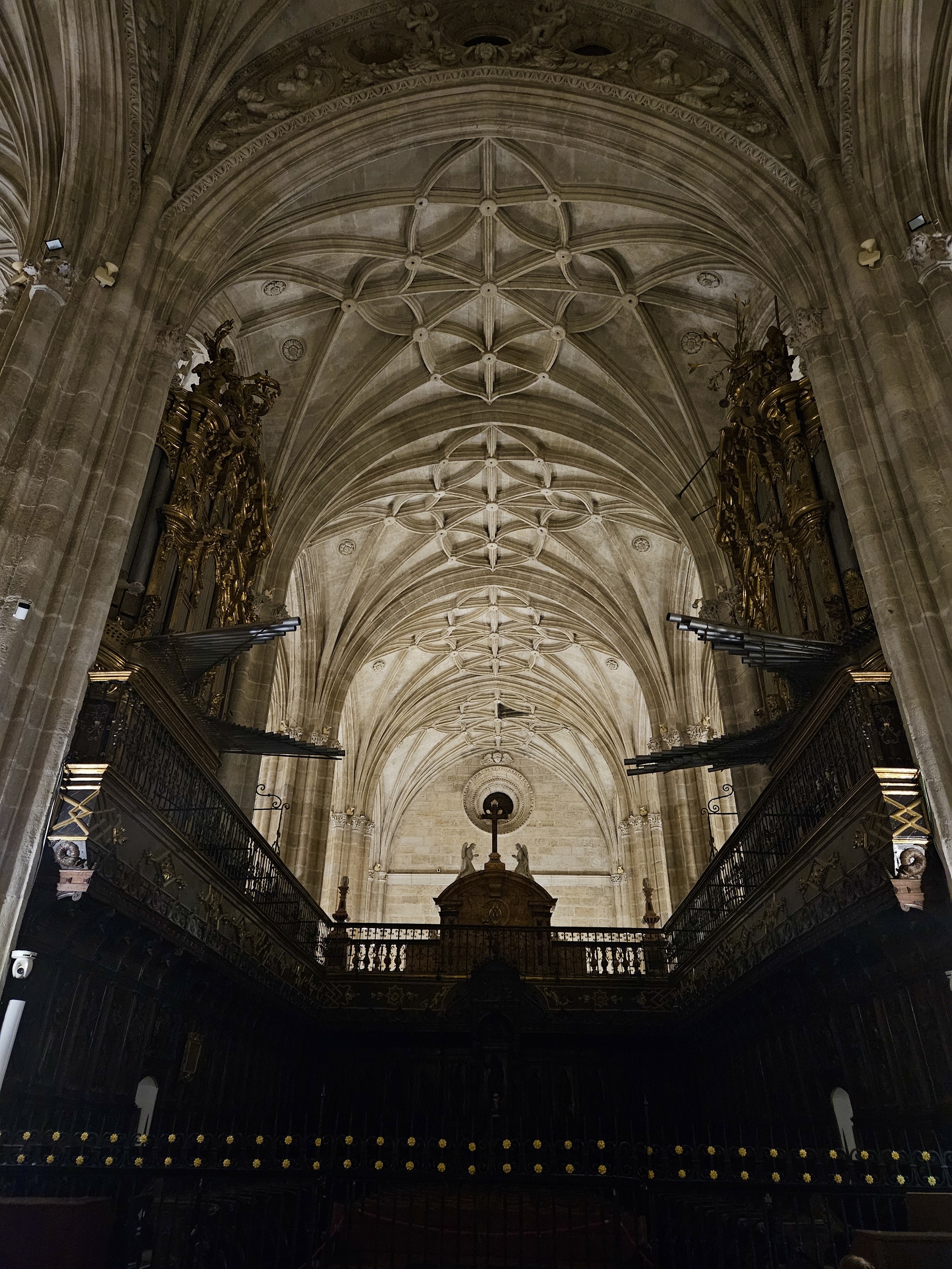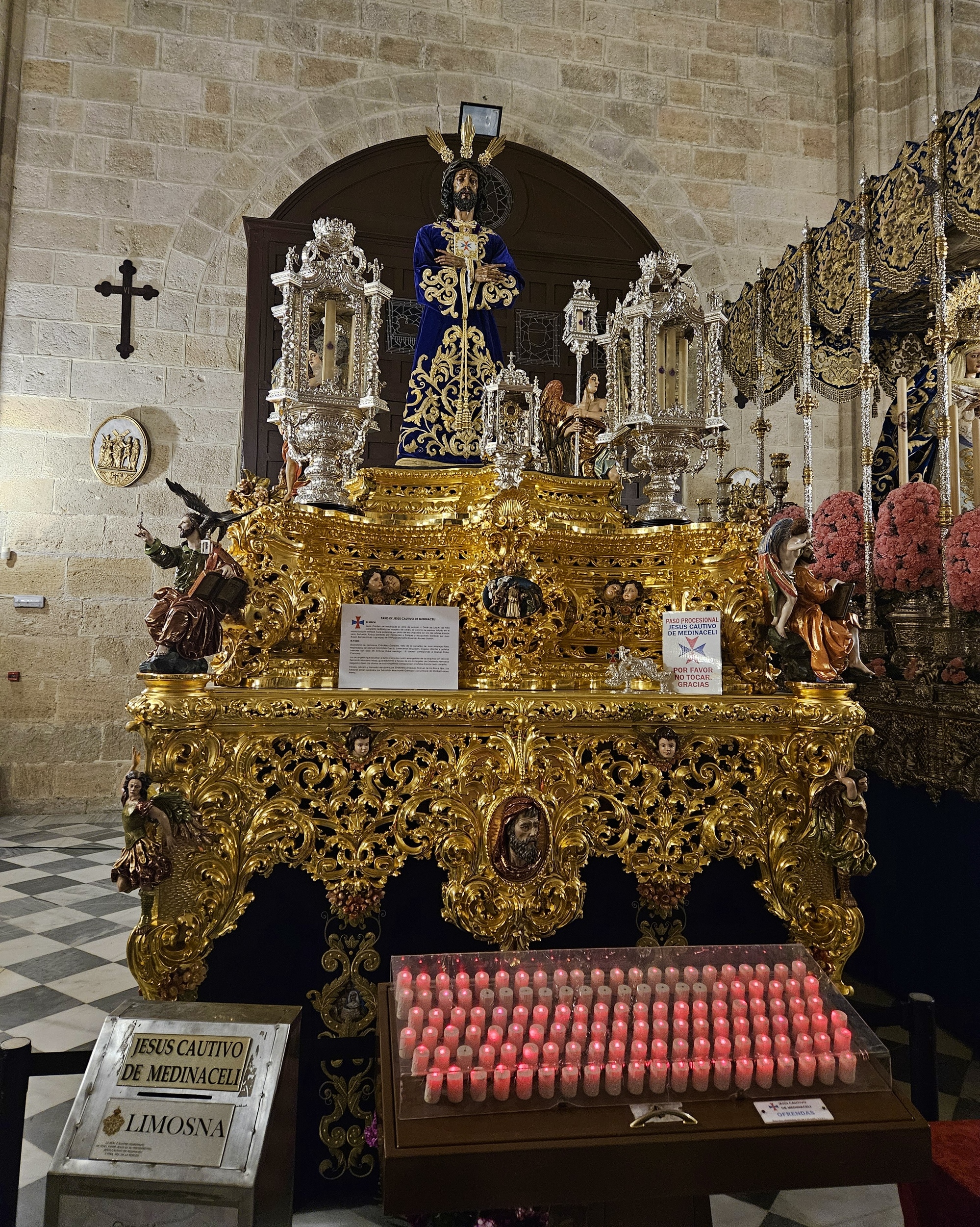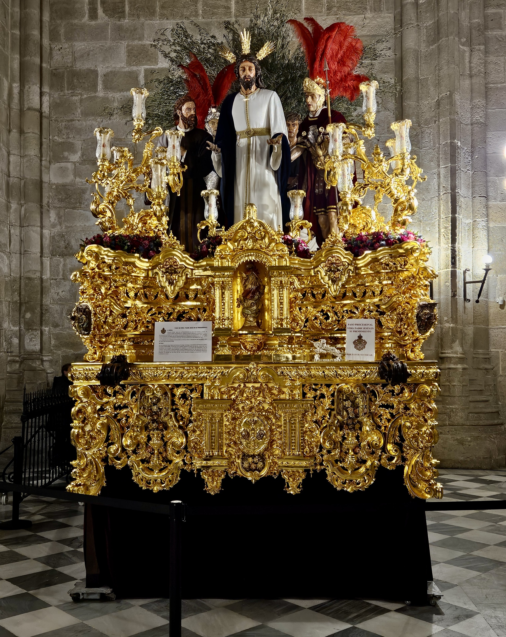 While we wait I’m surprised to see that folks are entering the cathedral, so it’s apparently open for viewing at the moment. So we go in too, and are suitably awed to be able to see up close the set of huge, intricately detailed pasos parked inside.