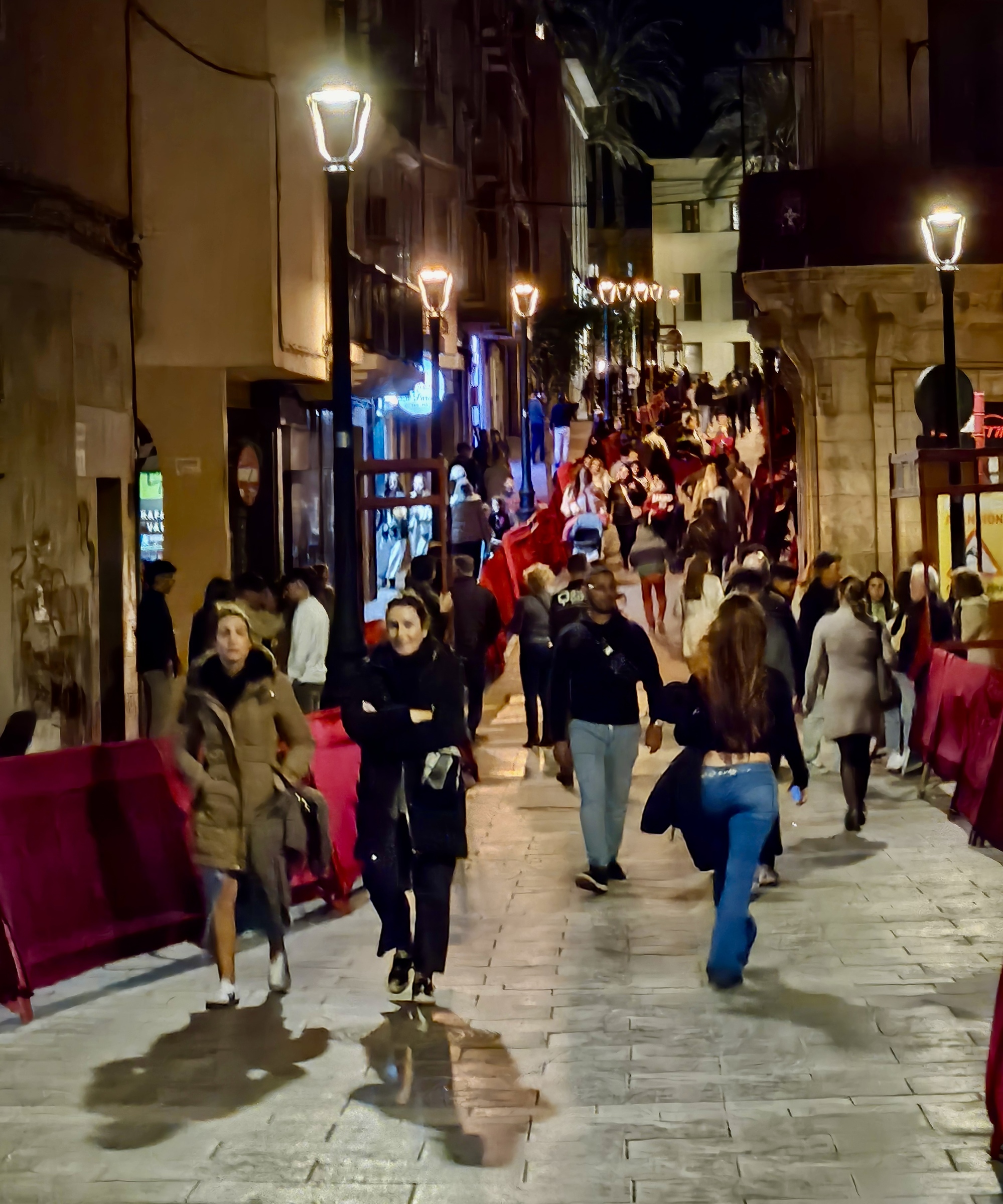 There’s still not much going on when we leave the cathedral. It’s nearly time for the procession to arrive, but it feels silly to stand around in the cold and wind just to claim a good viewing spot so we start walking down the direction the procession is due to arrive from. We get as far as Virgin del Mar Plaza, where we see some folks lining up apparently waiting for the show to begin.