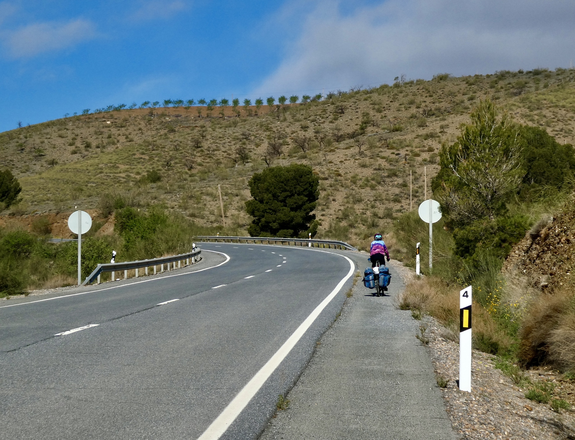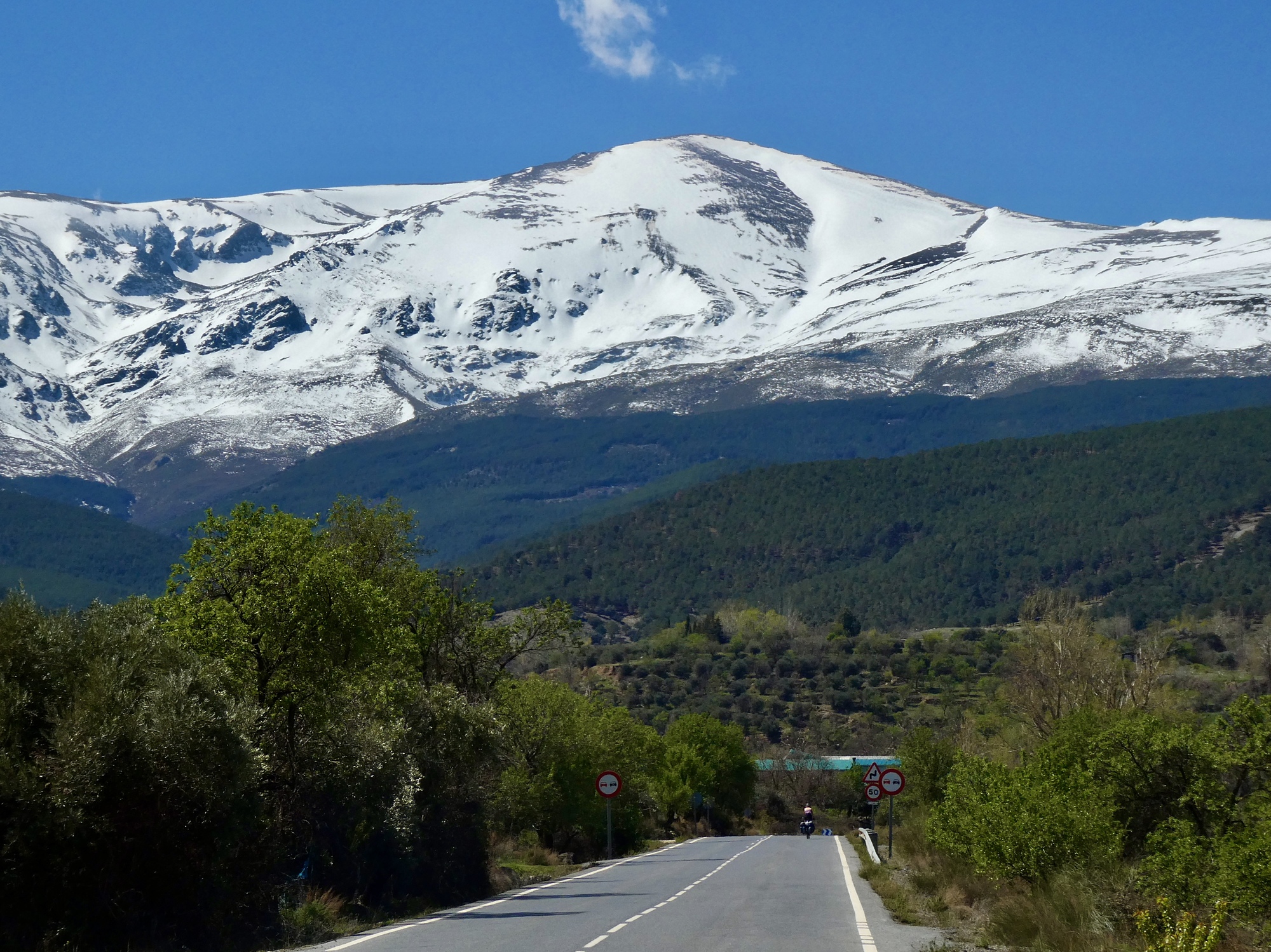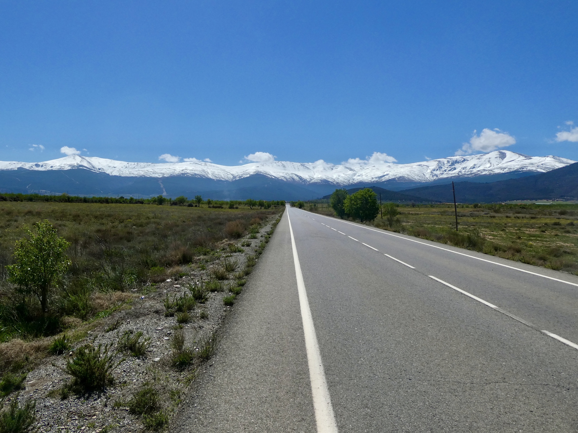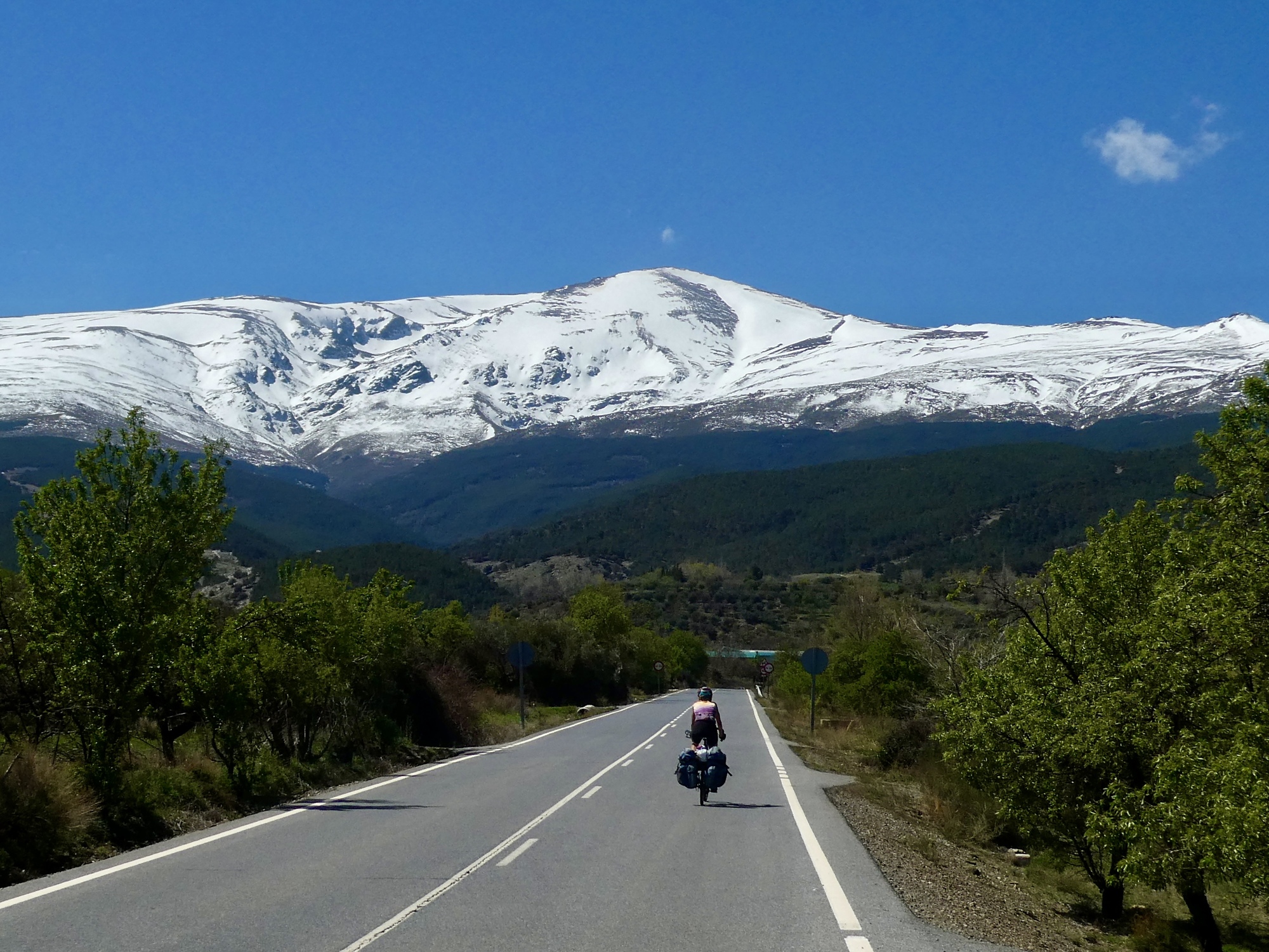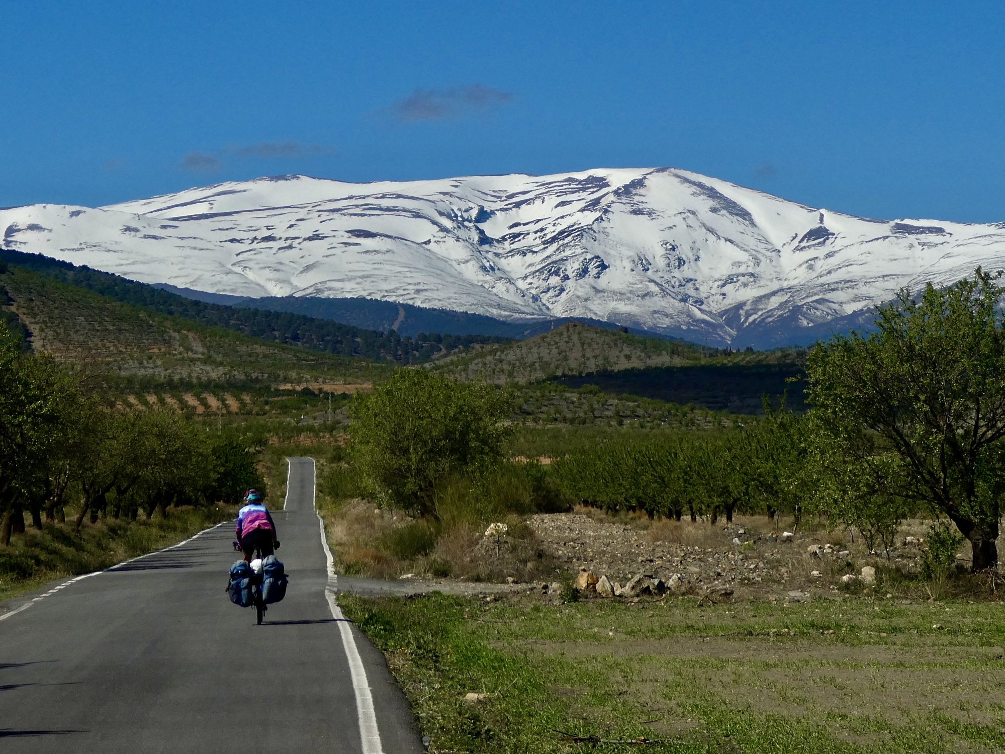 We maintain our high elevation until finally turning north and away from the mountains at Jerez de Marquesado, and for the next ten miles make a nearly beeline shot for Guadix down on the basin floor. Rachael gets ahead of me when I can’t resist stopping partway down to look back at the mountains, a broad white ribbon that spans the horizon.