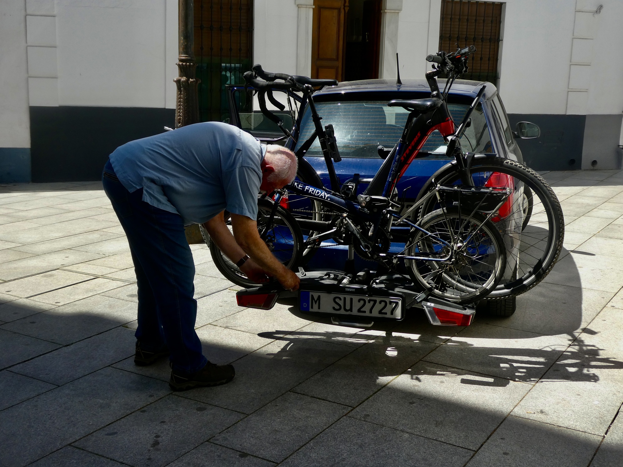 Then, I have to see if I can fit the bike into the back after I put seats down. I really want it to fit, because I don’t want to have to figure out how to mount the bike rack to the car, attach the brake lights, mount and secure the bike on it and then attach the red and white caution board on the back that Iberia requires. I’m pretty good at some things, but this sort of thing isn’t in my skill box. Fortunately it just fits after I take the front wheel off, but it makes me anxious that I’ll arrive at the end with a bent rotor or busted derailleur.