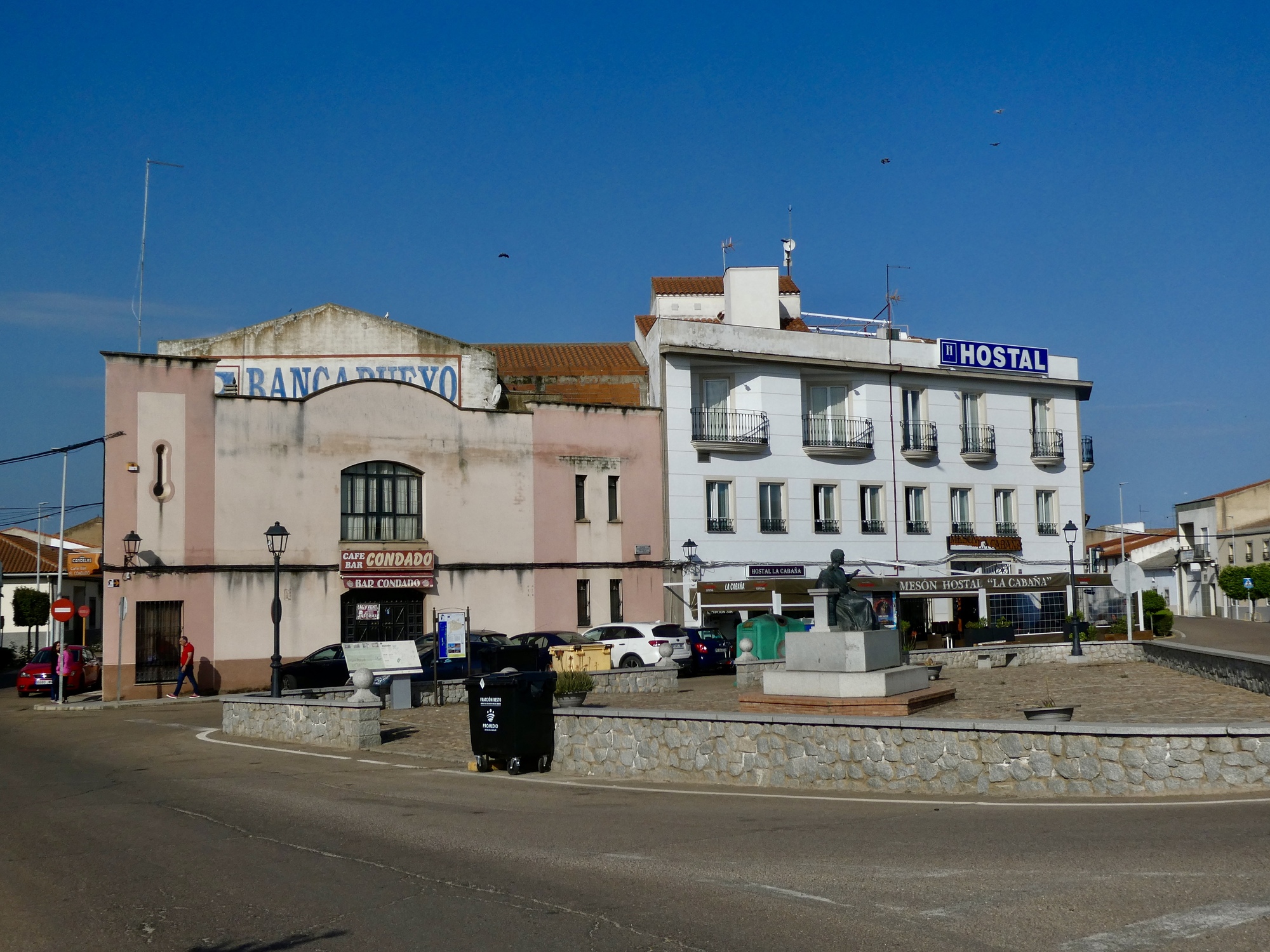 Oh, wait. We can’t move on yet because there’s more to the day. It was a short, easy ride and there are no obvious attractions in Miajadas to hold our attention, so after digesting lunch we leave for another hike and bike. Rachael walks to the neighboring village, Escurial, and is totally enraptured by the small park there, its pond teeming with ducks, geese, and their endearing newborns. She was so excited that she called me up from there recommending that I head that way myself. It was a little difficult piecing together what she was saying because she kept breaking off to talk to a duck that had apparently imprinted on her and was following along behind.