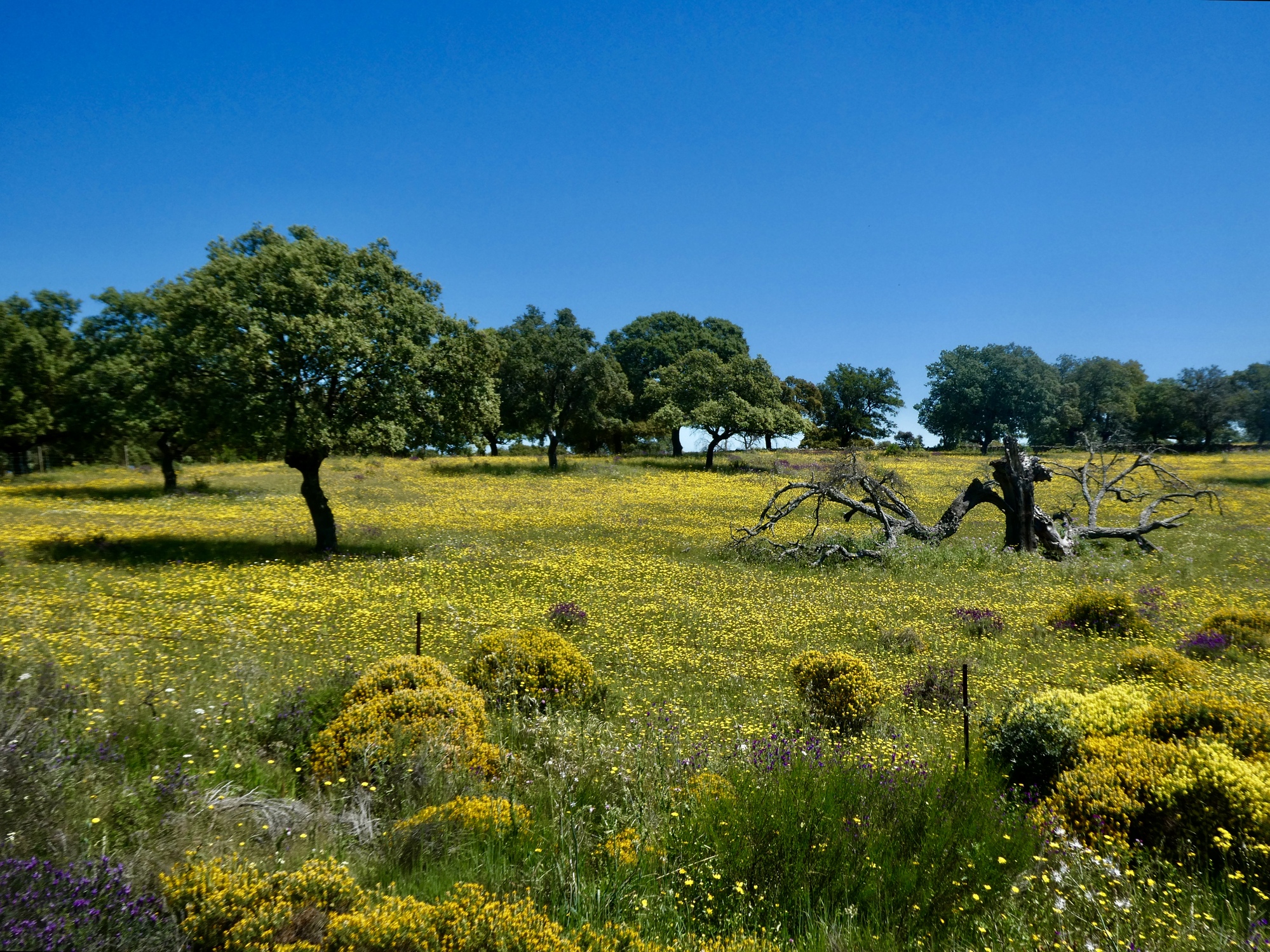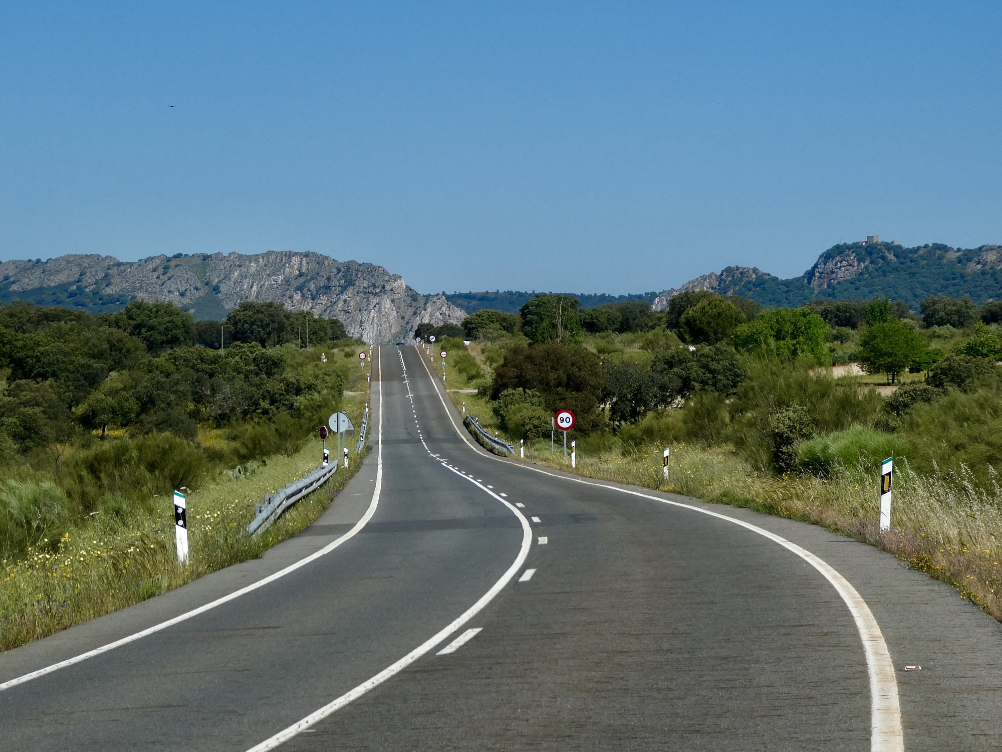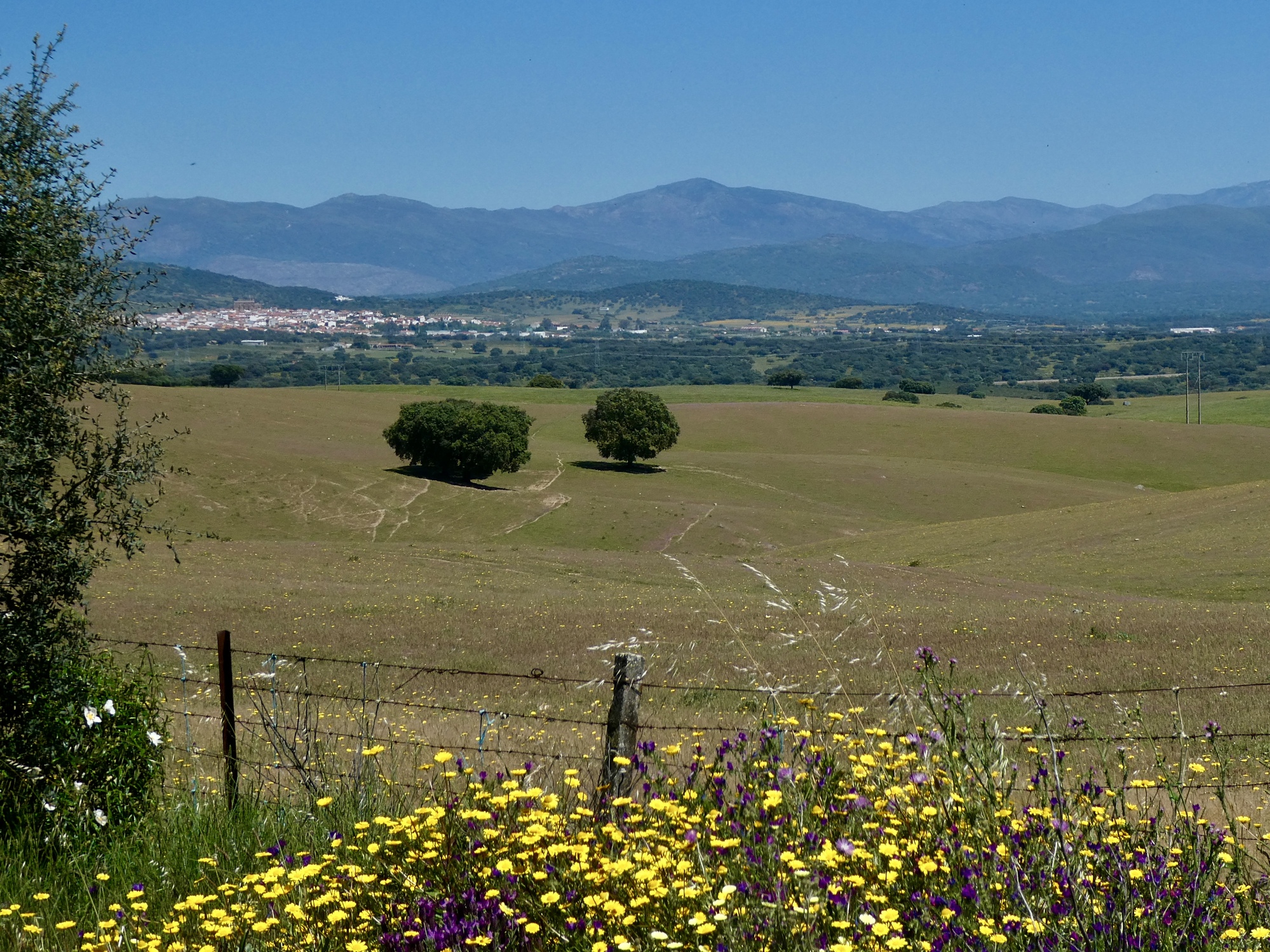Crossing the river, there’s a gradual climb up through oak and pine woods on the other side of the canyon before the road generally levels out about eight hundred feet above the river. It’s a colorful ride on top, through another dehesa landscape with the roadside lined with lavender and rockrose before dropping sharply to Plasencia on the Jerte River, a major tributary of the Tagus that joins it near the dam at Alcantara.