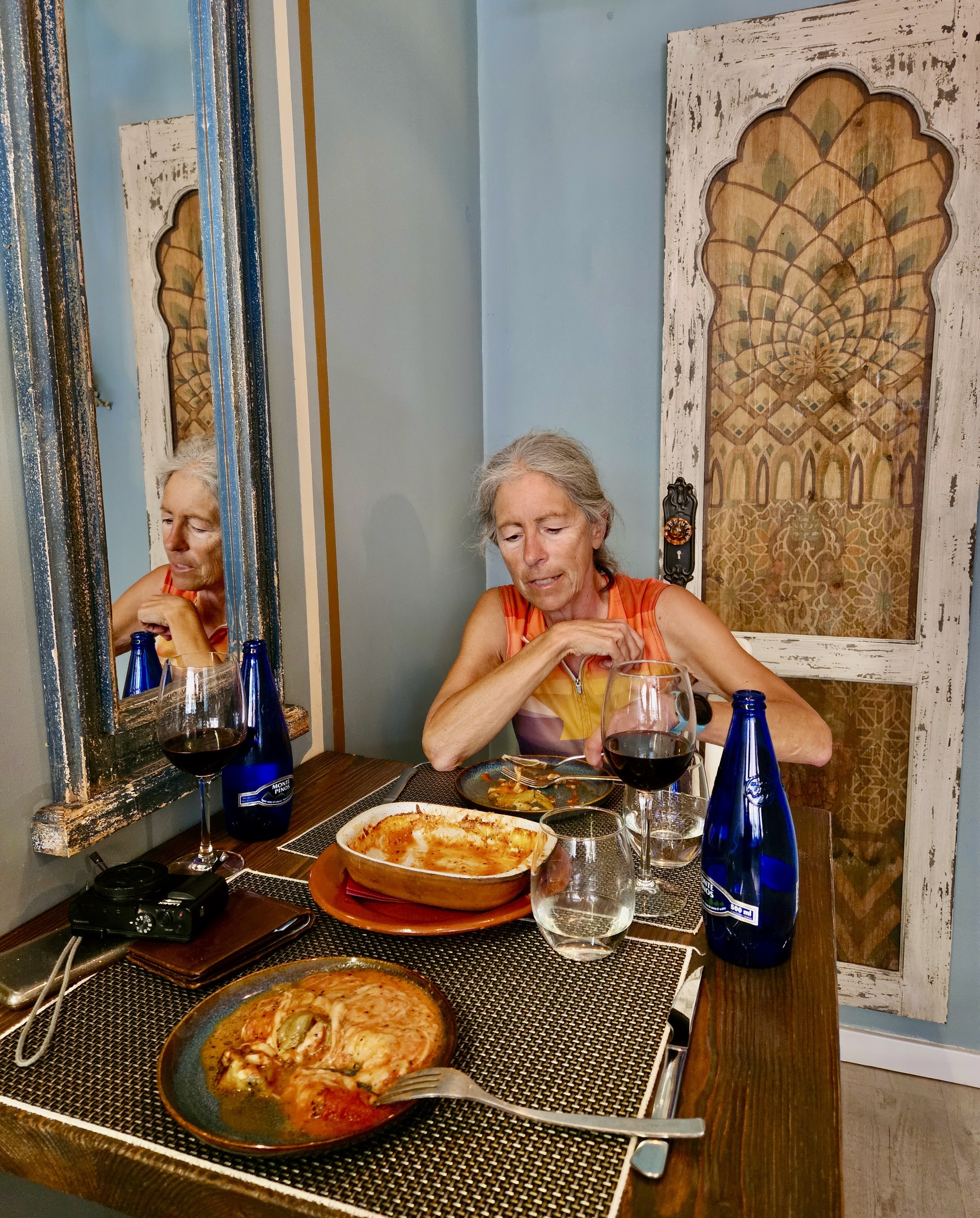 There’s some anxiety when we lean our bikes against the restaurant wall and I go inside to ask if they’ll seat us; and the news at first is discouraging. The man doesn’t speak English, but with my prompting he acknowledges that they’re completo. Sad! But then he has an afterthought, writes out a time, and gets across the idea that we can be seated if we agree to be done by 2.30. No problemo! Yippee!!