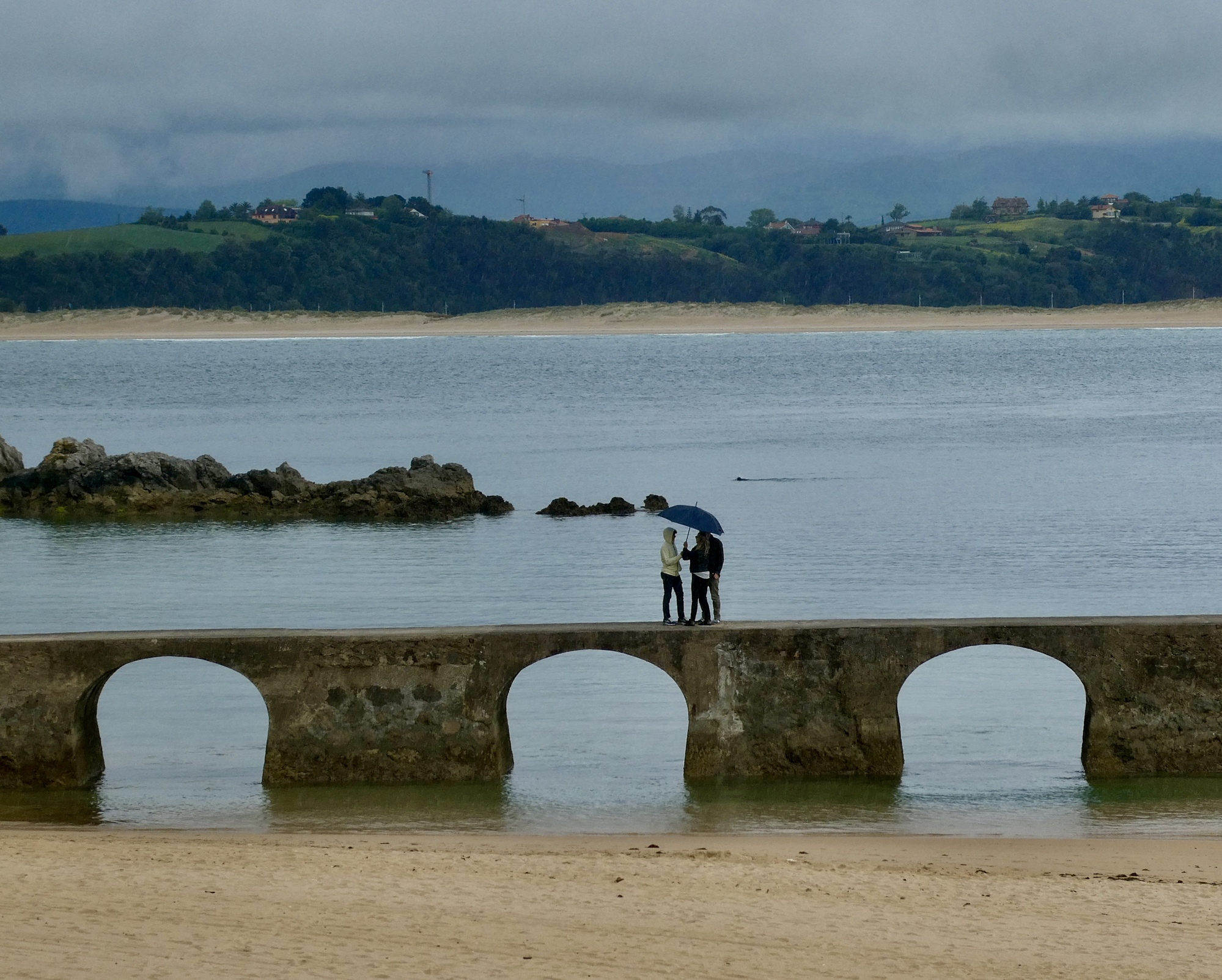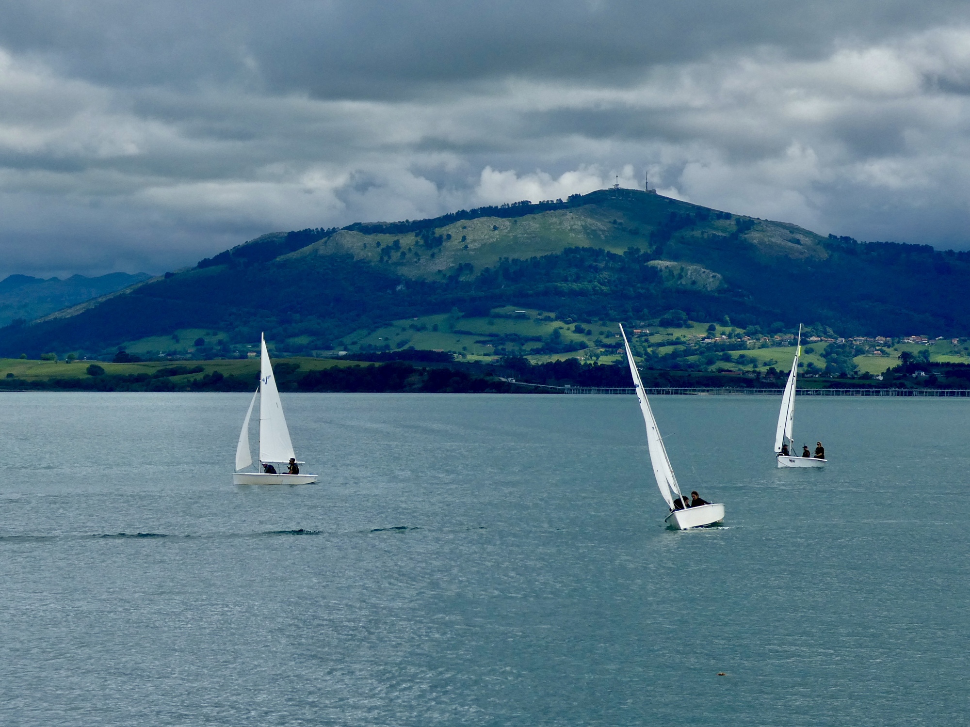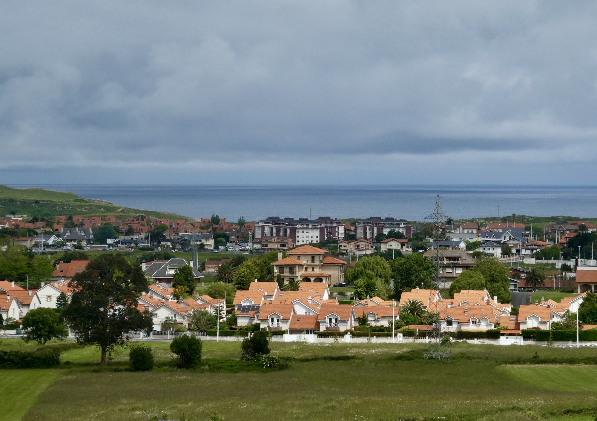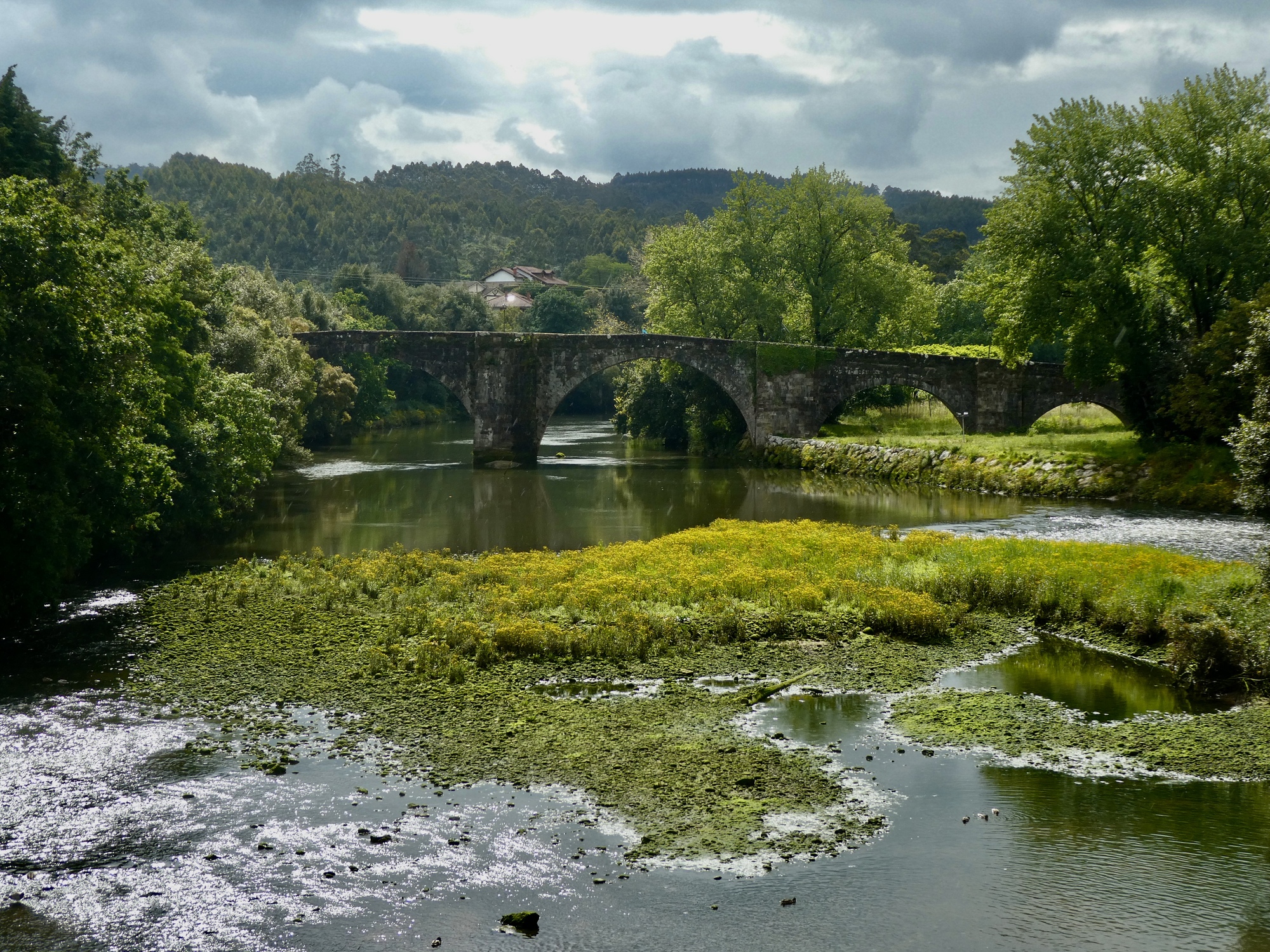 It’s not surprising that under the circumstances we just rode, happy for every mile we remained dry. I warned Rachael in advance that I’d be stopping to see the old bridge over the Pas River at Oruña when we got to it, but other than that I kept the Lumix safely zip locked until near the end when it was clear we’d be arriving dry. There was about a mile when we biked in a light mist, but it soon passed and did no harm.