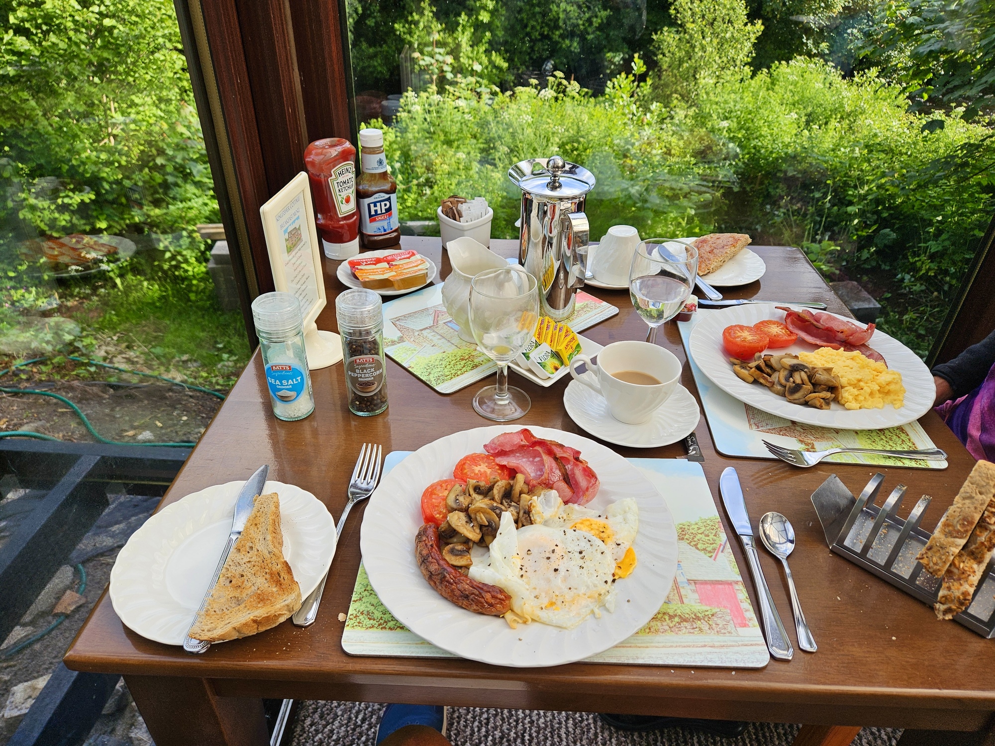 The day starts with a terrific breakfast, if you’re a breakfast person. First off the location is lovely, looking out the back of the house down on the Tavy River raging past just yards below. We’re down a few minutes before eight and are the first to claim a table. A few minutes later Paul shows up, asks what beverages we’d like, and tells us to help ourselves to the array of cereals, yogurt and OJ on a counter in the corner. A few minutes later he returns with a large French press that he sets on the table and then takes our food orders from the menu card before us. Here’s what’s presented about ten minutes later: