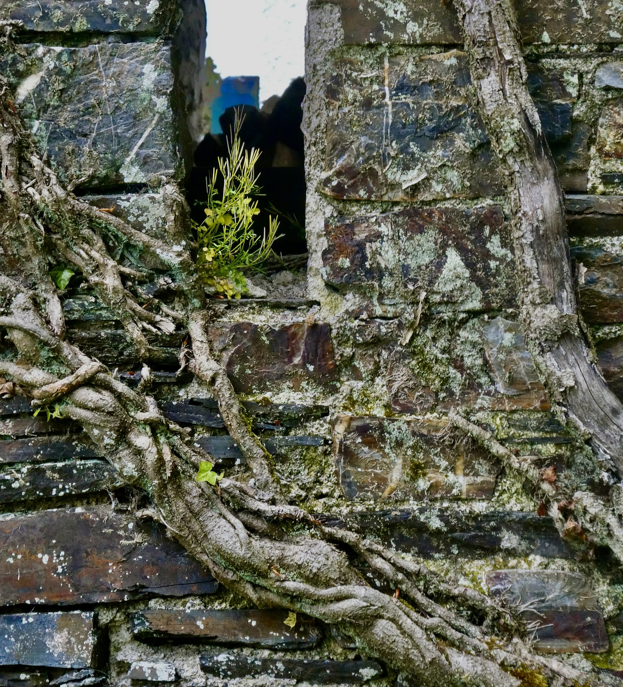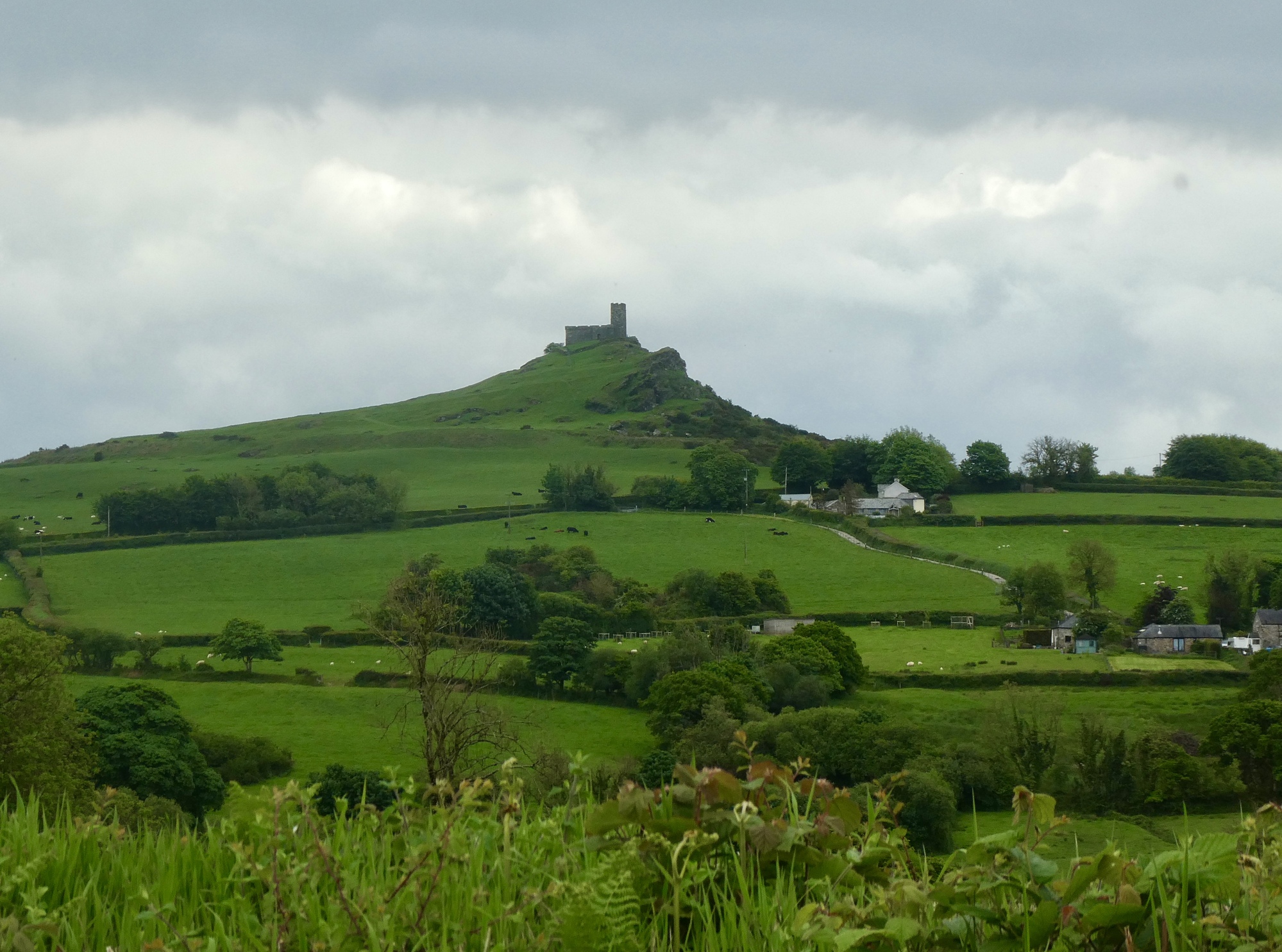 I stop when I come to a break in the hedgerow where there’s a hiking path up to the structure on top: Saint Michael’s, the still functioning parish church for the village of Brentor down below. The church’s website gives its interesting story: