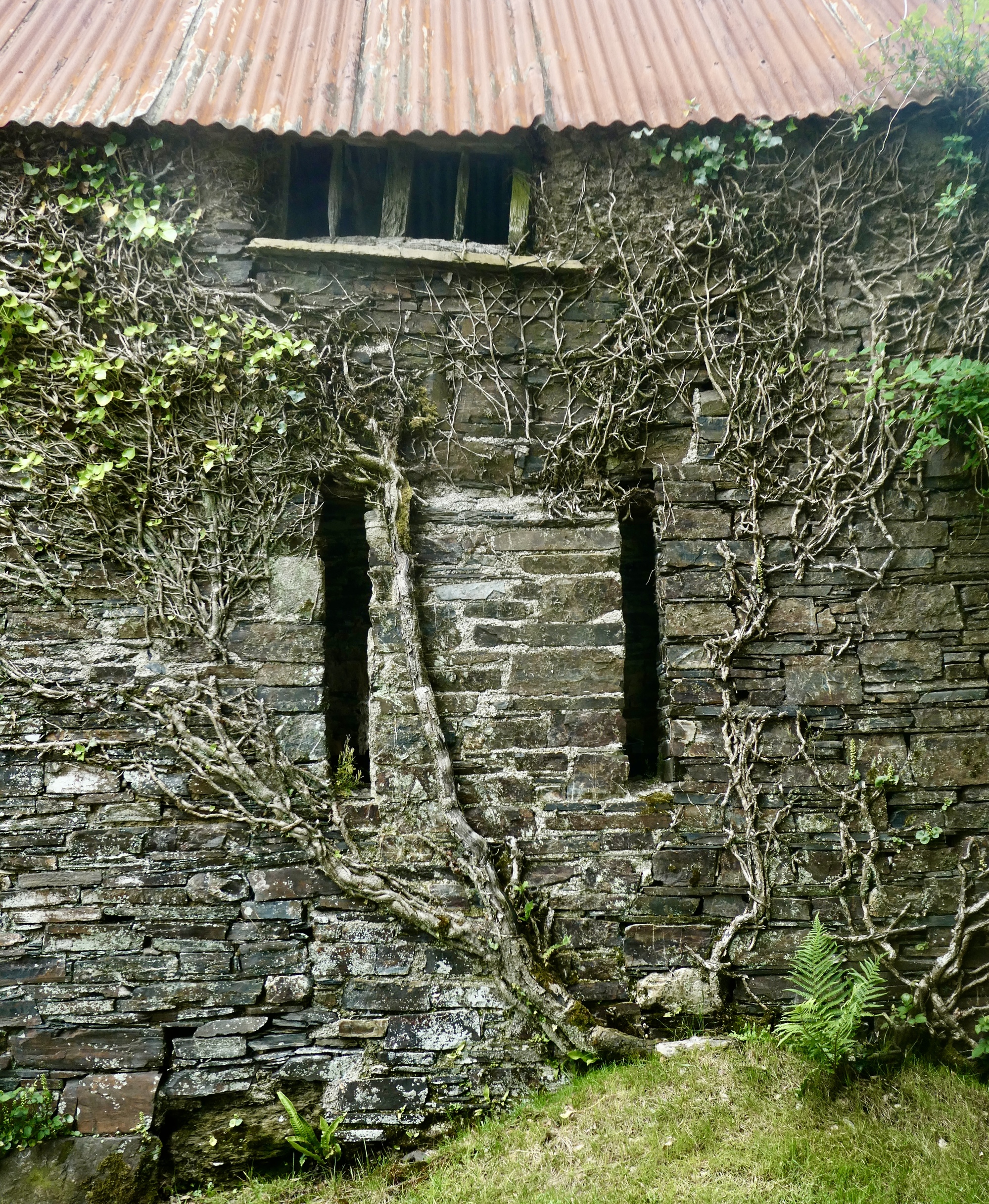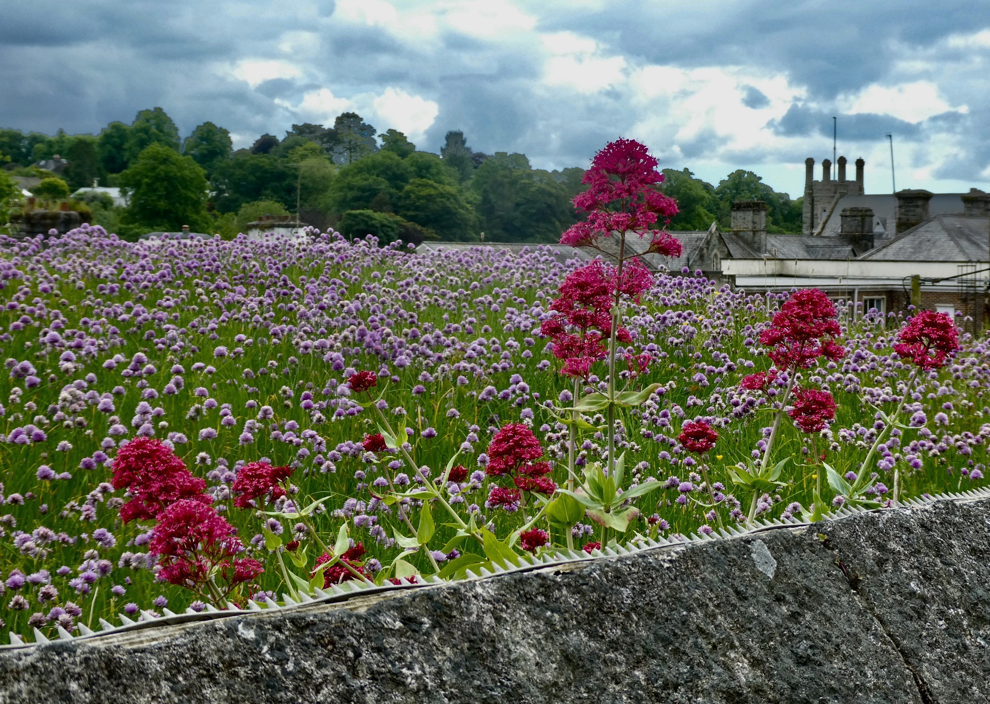 Entering town, I get a look down on the rooftops below. They are growing an impressive clover crop - they could graze a goat up here. The red wallflower is red valerian, another common roadside attraction here.