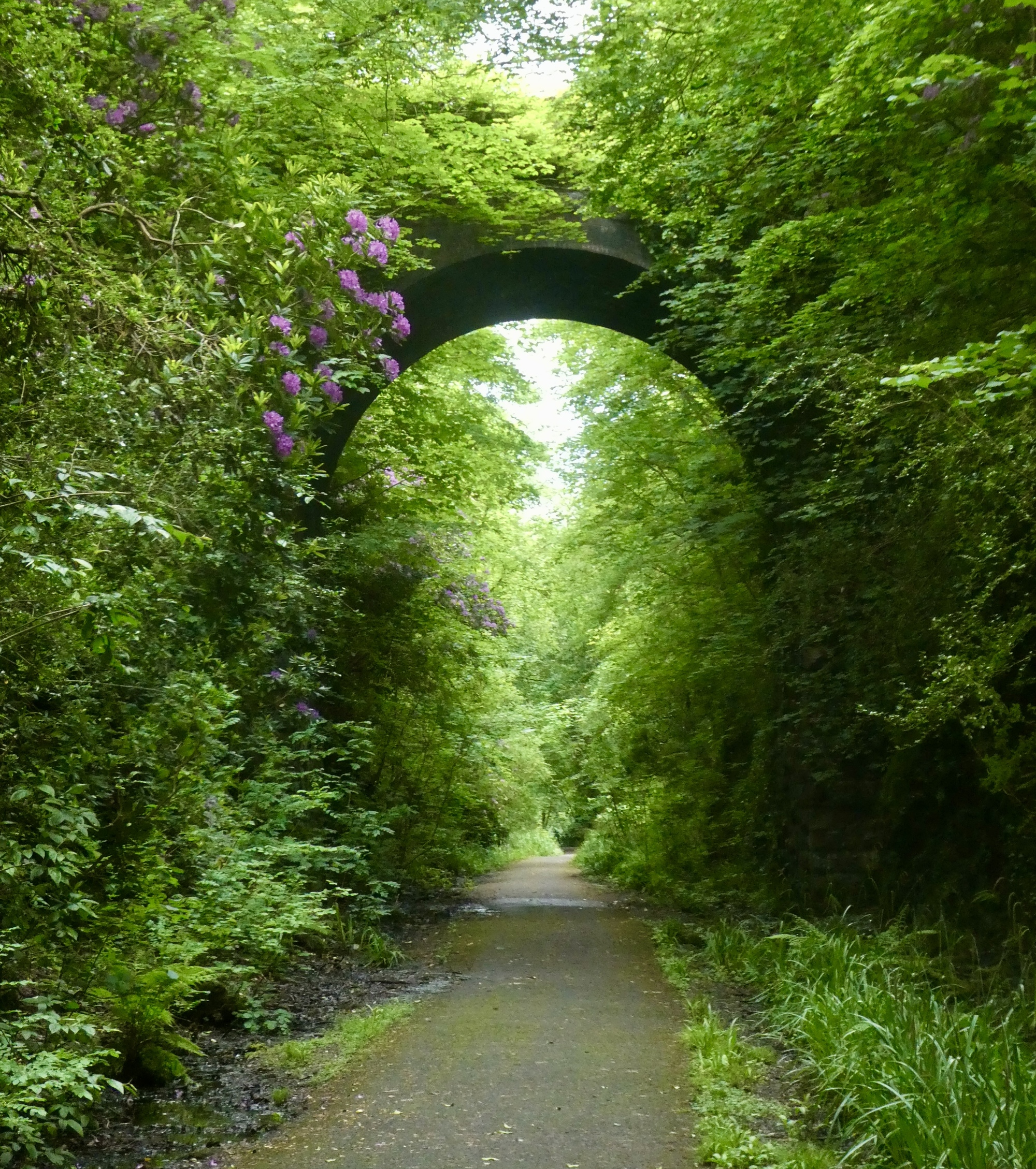 Where the old rail line still exists it provides miles of fine riding, with frequent sight lines like this. It’s still spring, and the vegetation is colorful. Rhododendrons are in bloom here and there all along the way.