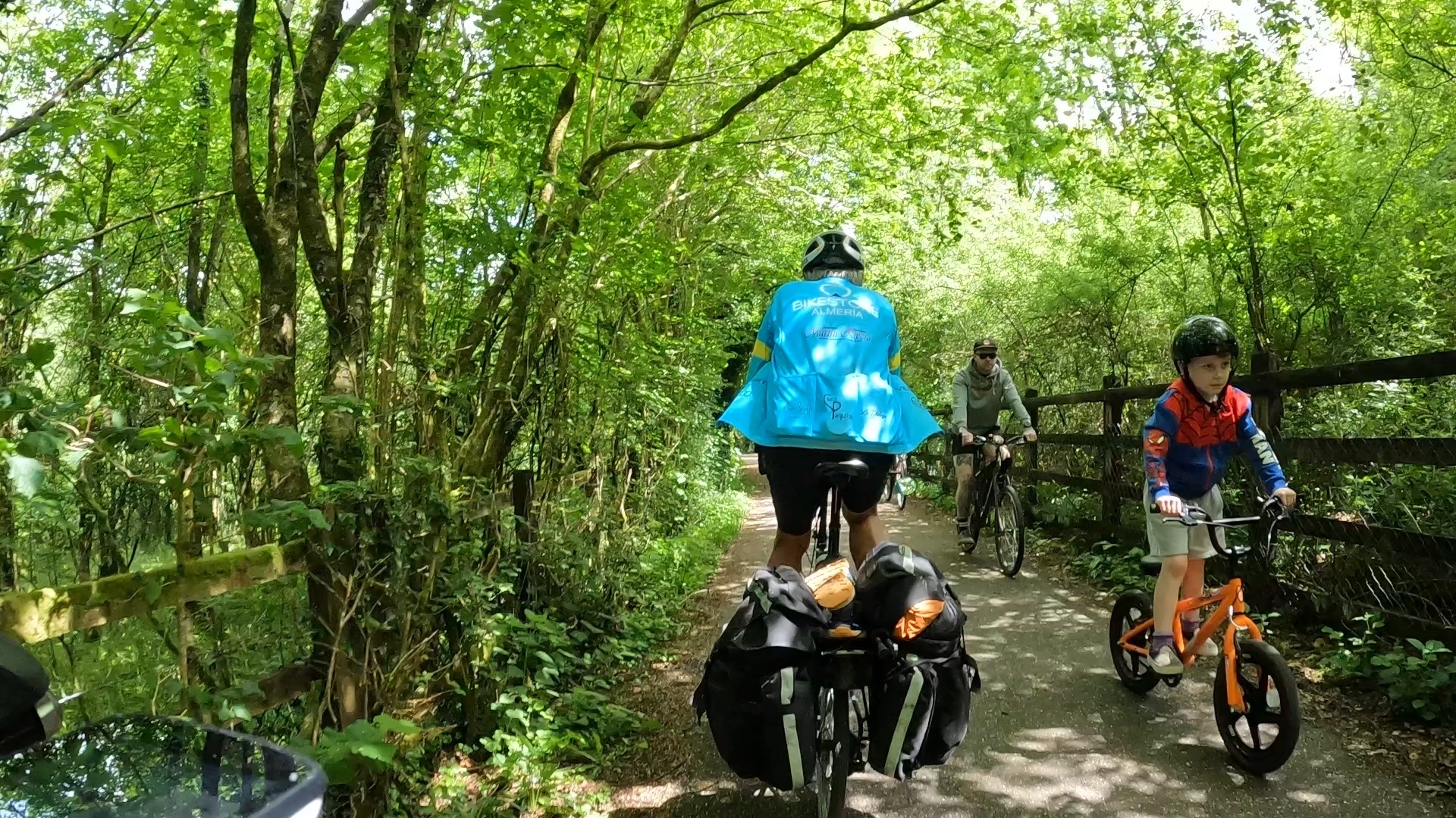 A bit further on I’m startled to be passed by a your boy pedaling like mad, quickly leaving me behind. His dad follows, but we catch up to them when they’re stopped looking over a stone wall. Others are gawking as well, so we stop and join them for our own look.