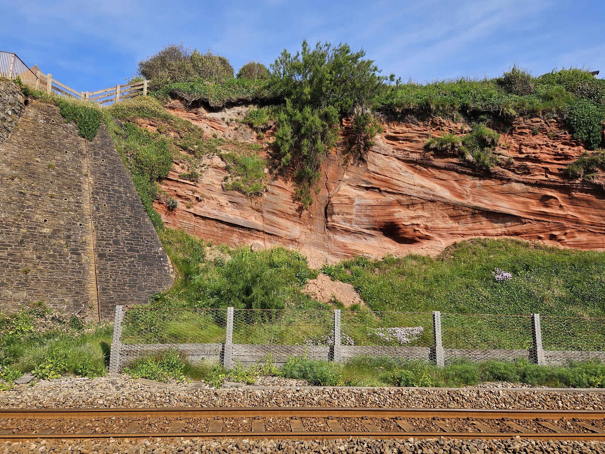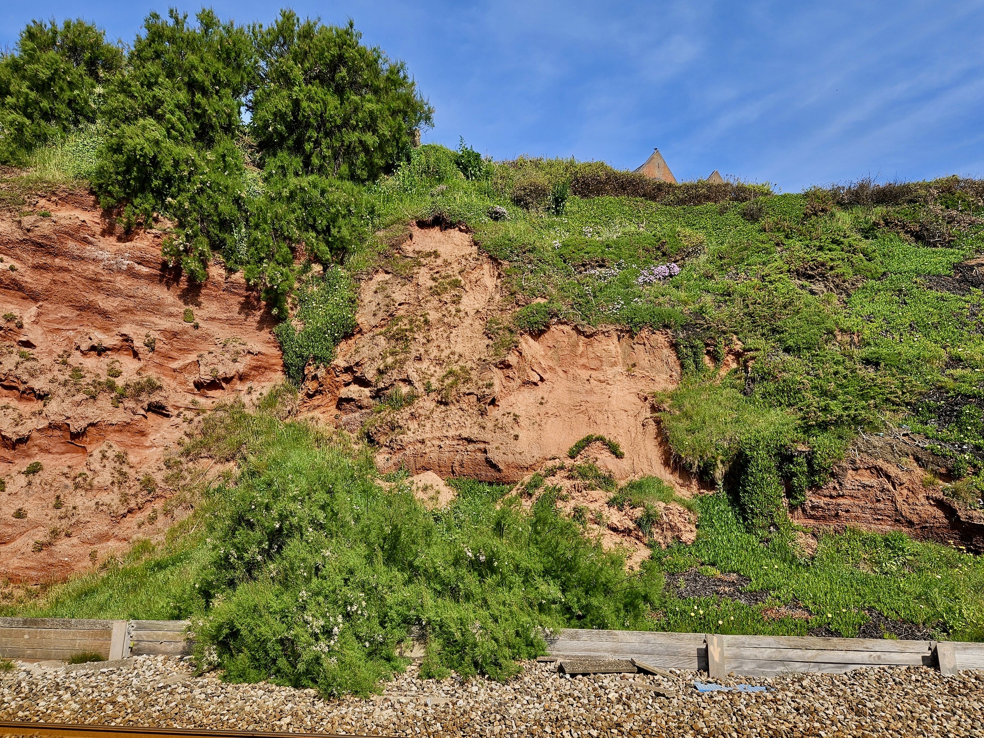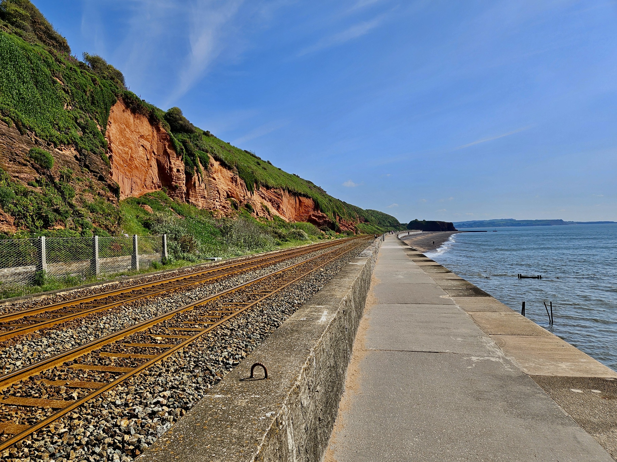 Later, Rachael will rave about how great those first two miles are, walking the Southwest Coastal Path east along the coast from Dawlish toward the mouth of the river. To the right she gets views of the English Channel, and to the left on the other side of the tracks are beautiful red cliffs. She takes a lot of photos here, which I’m especially pleased with because they’re views I won’t see myself when I bike down here because the bike route stays back from the coast on the other side of the cliffs.