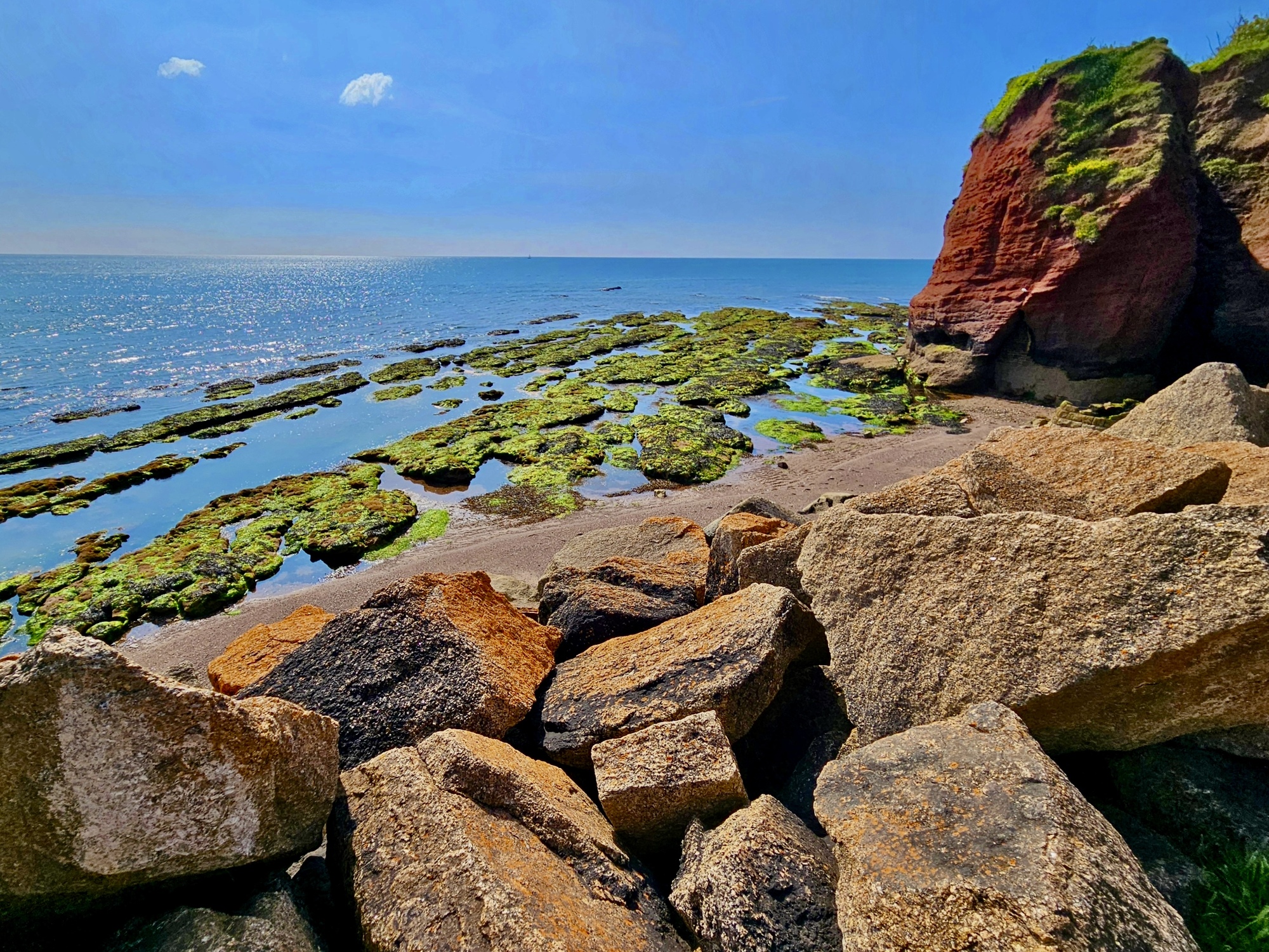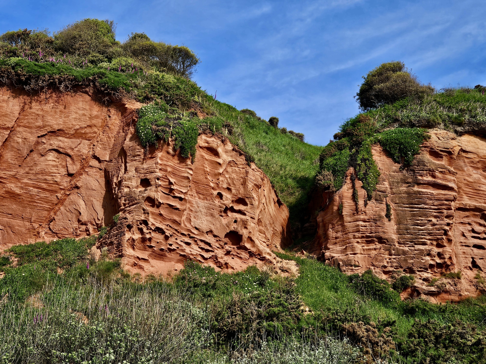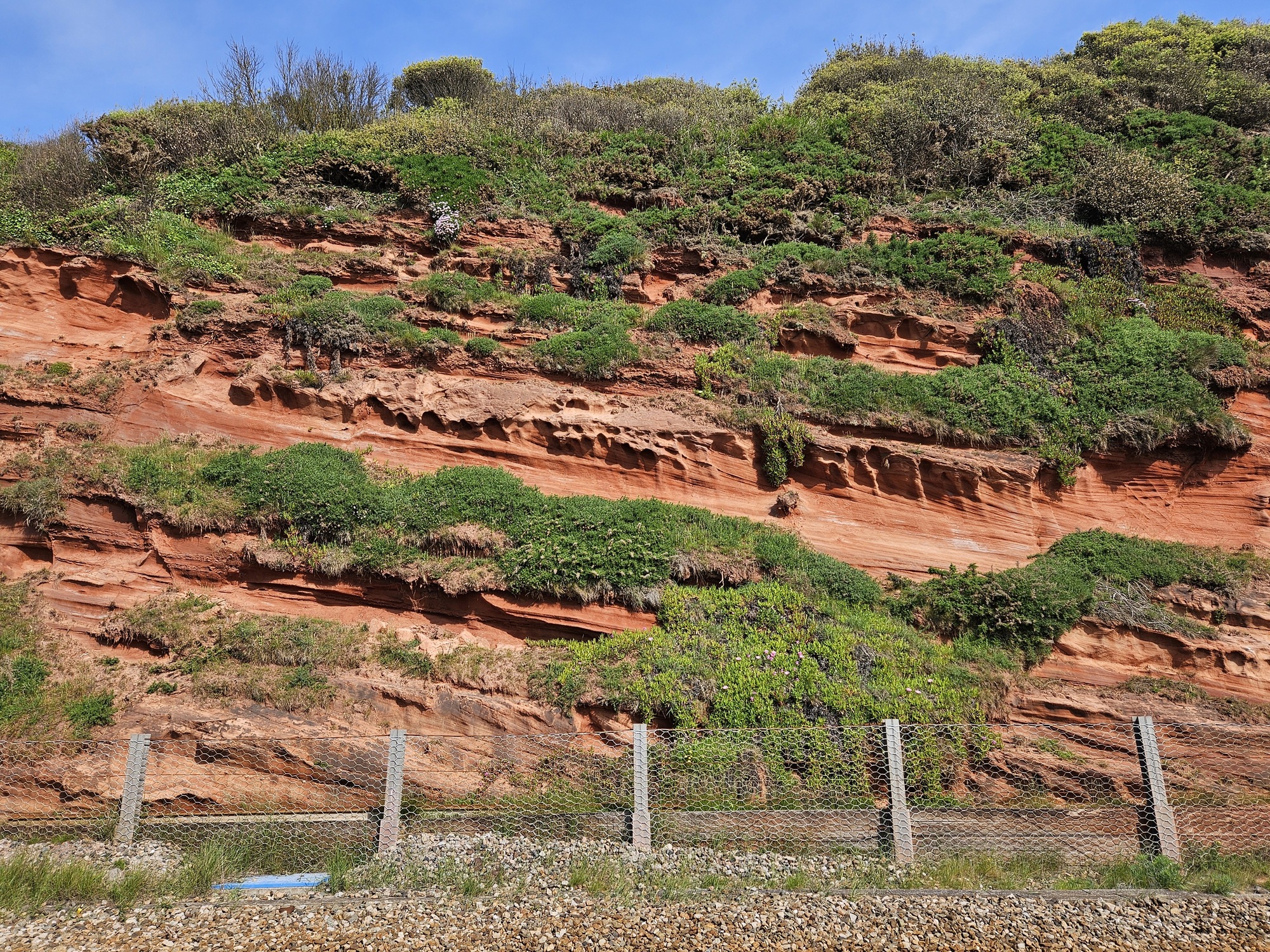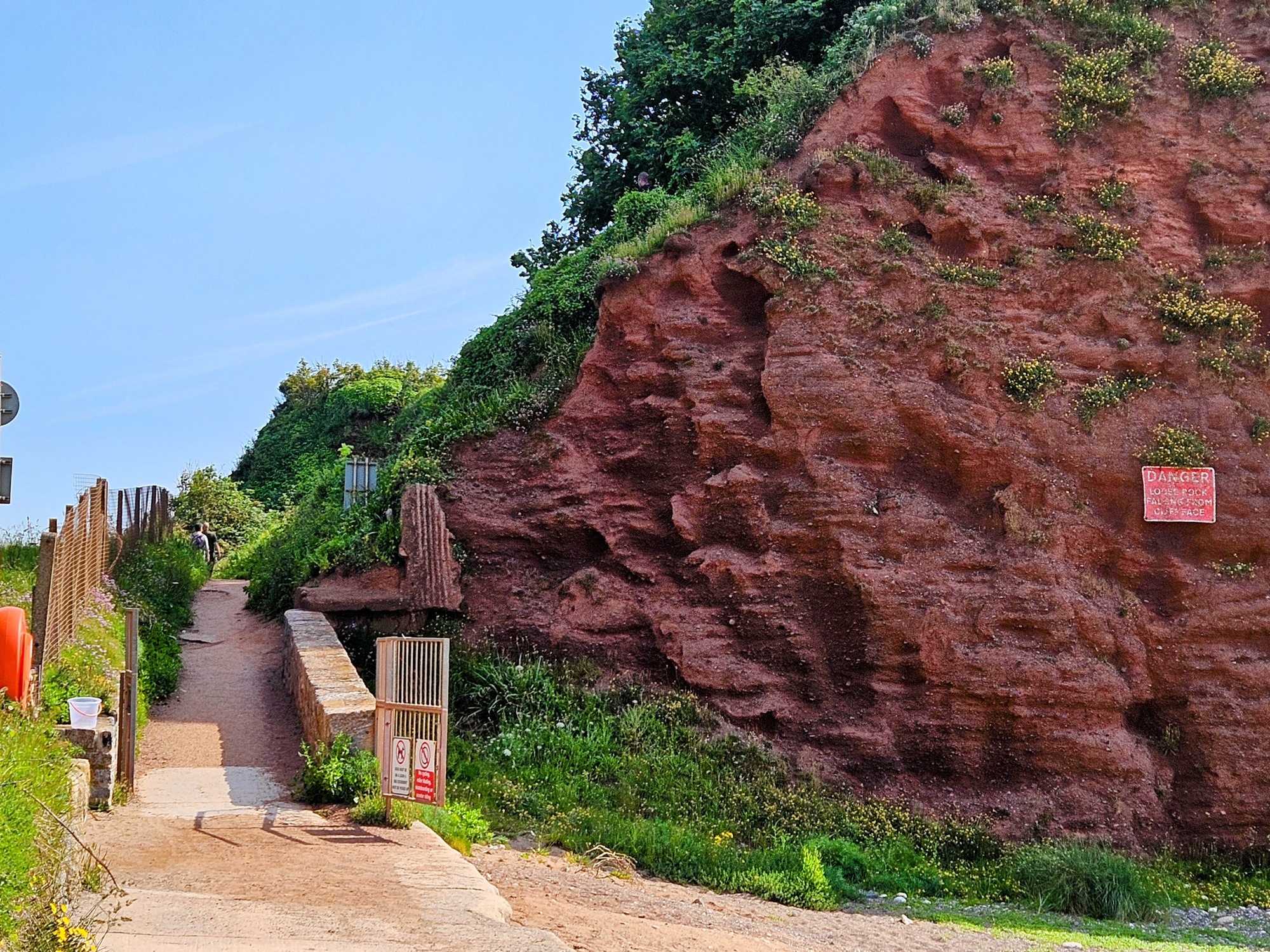 Later, Rachael will rave about how great those first two miles are, walking the Southwest Coastal Path east along the coast from Dawlish toward the mouth of the river. To the right she gets views of the English Channel, and to the left on the other side of the tracks are beautiful red cliffs. She takes a lot of photos here, which I’m especially pleased with because they’re views I won’t see myself when I bike down here because the bike route stays back from the coast on the other side of the cliffs.