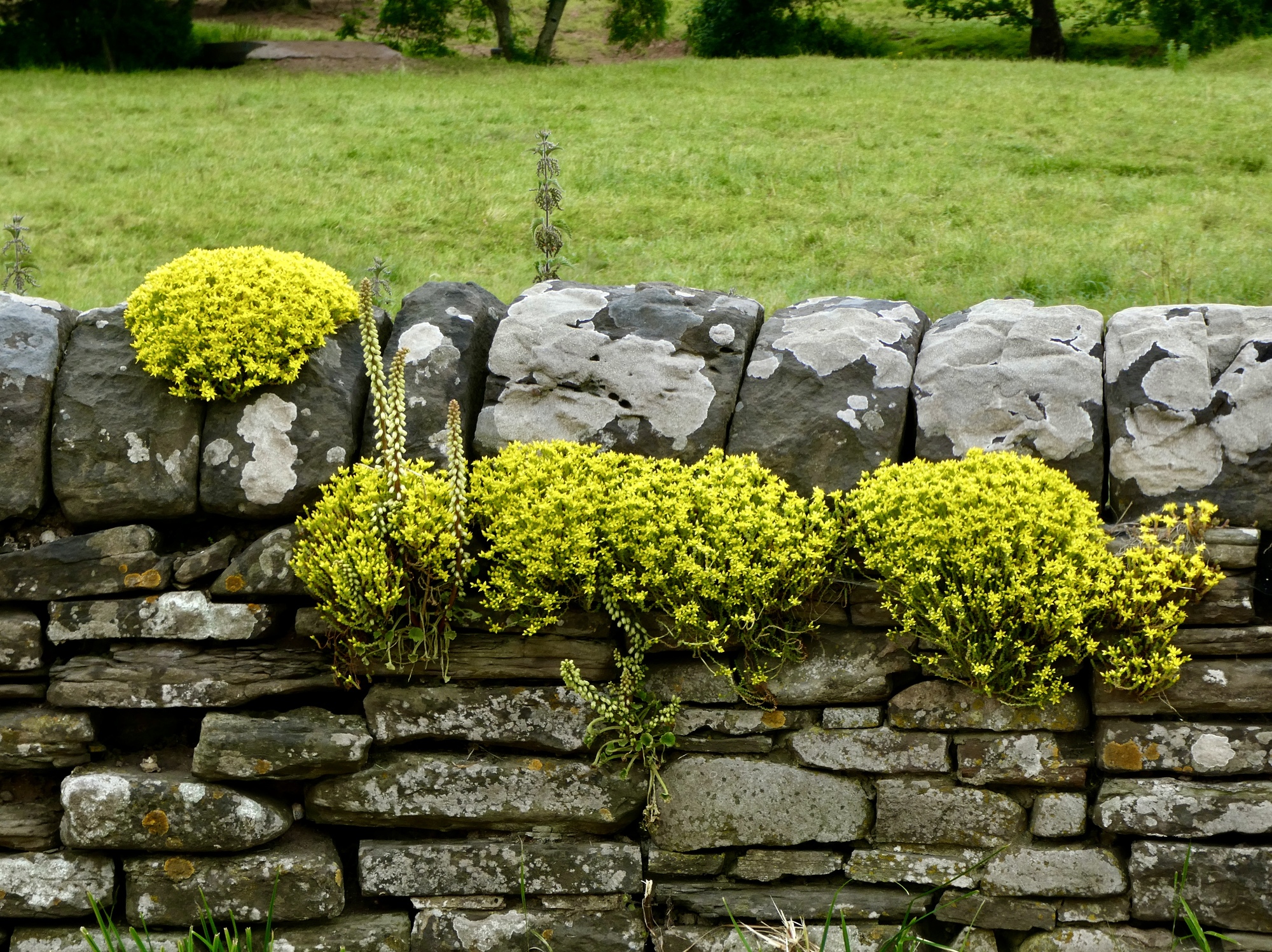The really steep part only lasts for maybe a quarter mile, and then comes a cattle guard, a sign to keep clear of the free range animals, and then everything changes again. We’re up in the moors, you can see forever, and the land is littered with sheep and a few horses.