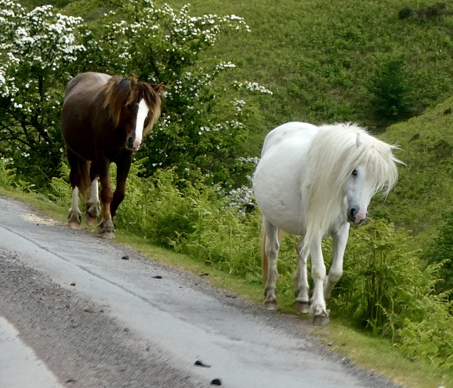 We don’t stay around for long - just enough to pan the stunning views, take a few pics, and layer up for the descent. Just as we’re about to get back on the bikes I look up the road and see a parade of four horses walking toward us. By the time I get the camera aimed their way two of them have disappeared into the bracken, but I’m lucky to have seen what I did before they drop off the road and join their gang of six.