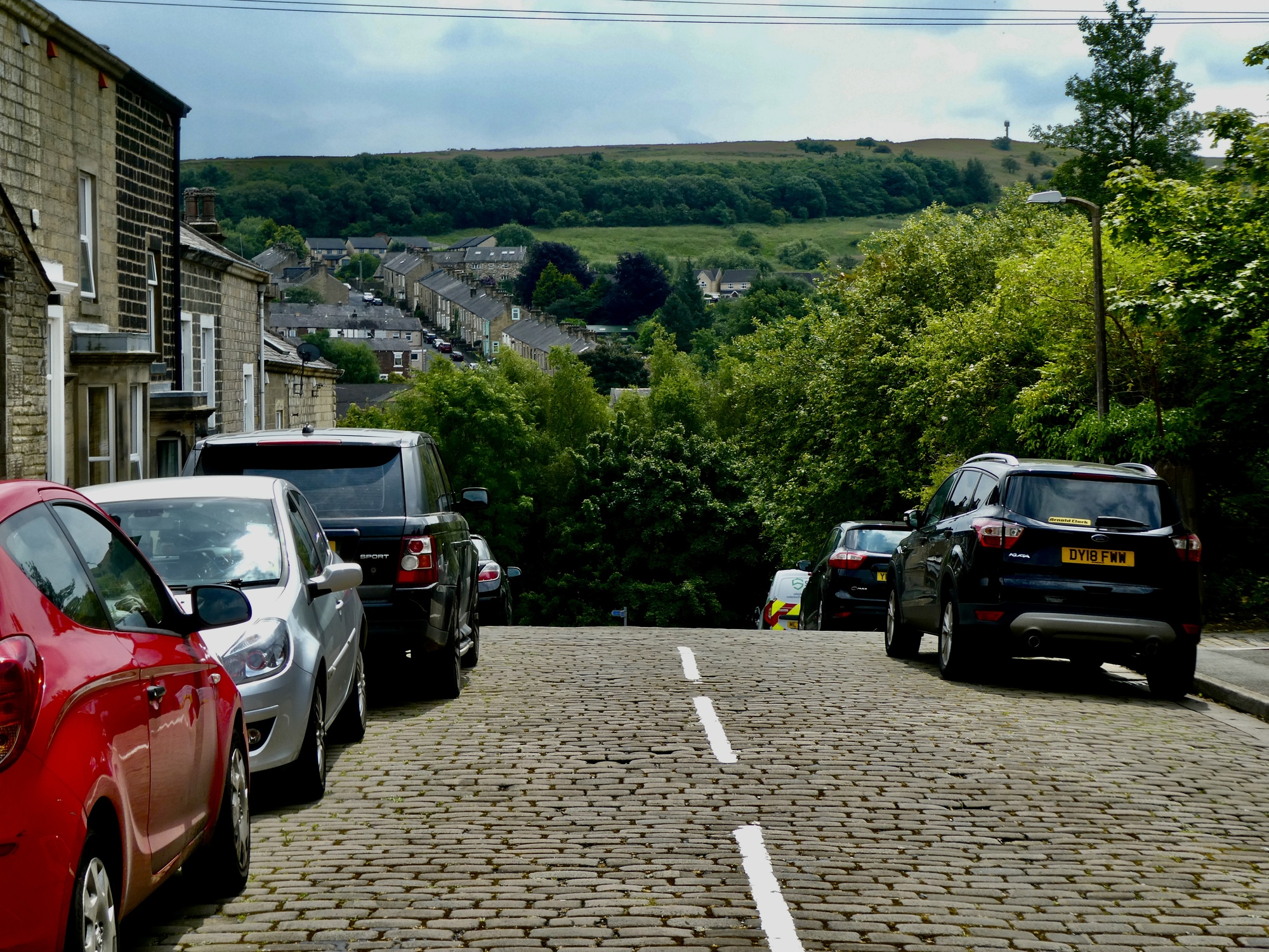 We’re happy that is until we start biking out of Colne. It begins with a super-steed descent down a brick street, one steep and uneven enough that we walk it.