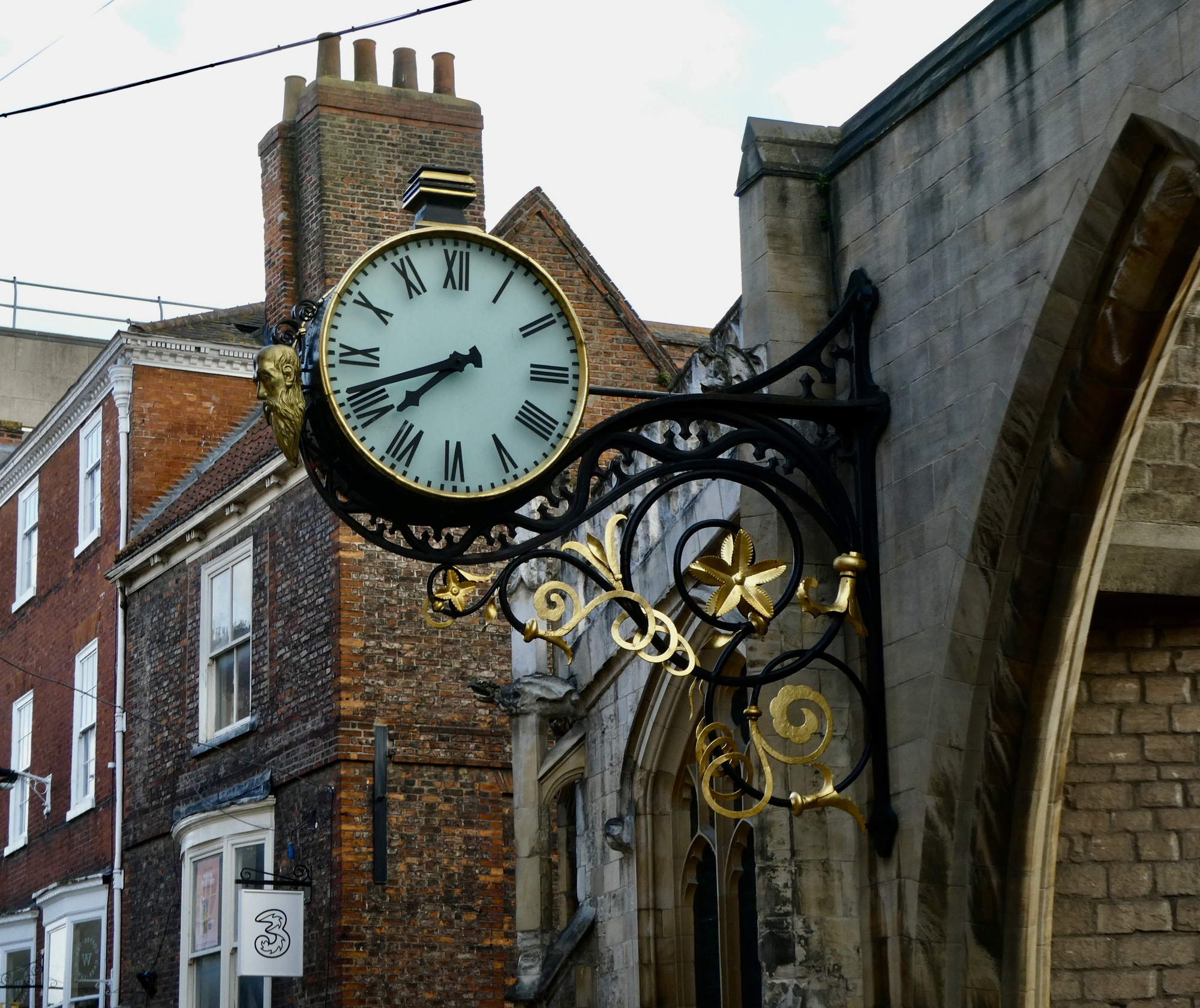 The clock at St Martin-le-Grand Church on Coney Street.It's one of York's most prominent clocks. The church and clock were badly damaged during World War Two in an air raid on April 29th 1942.
