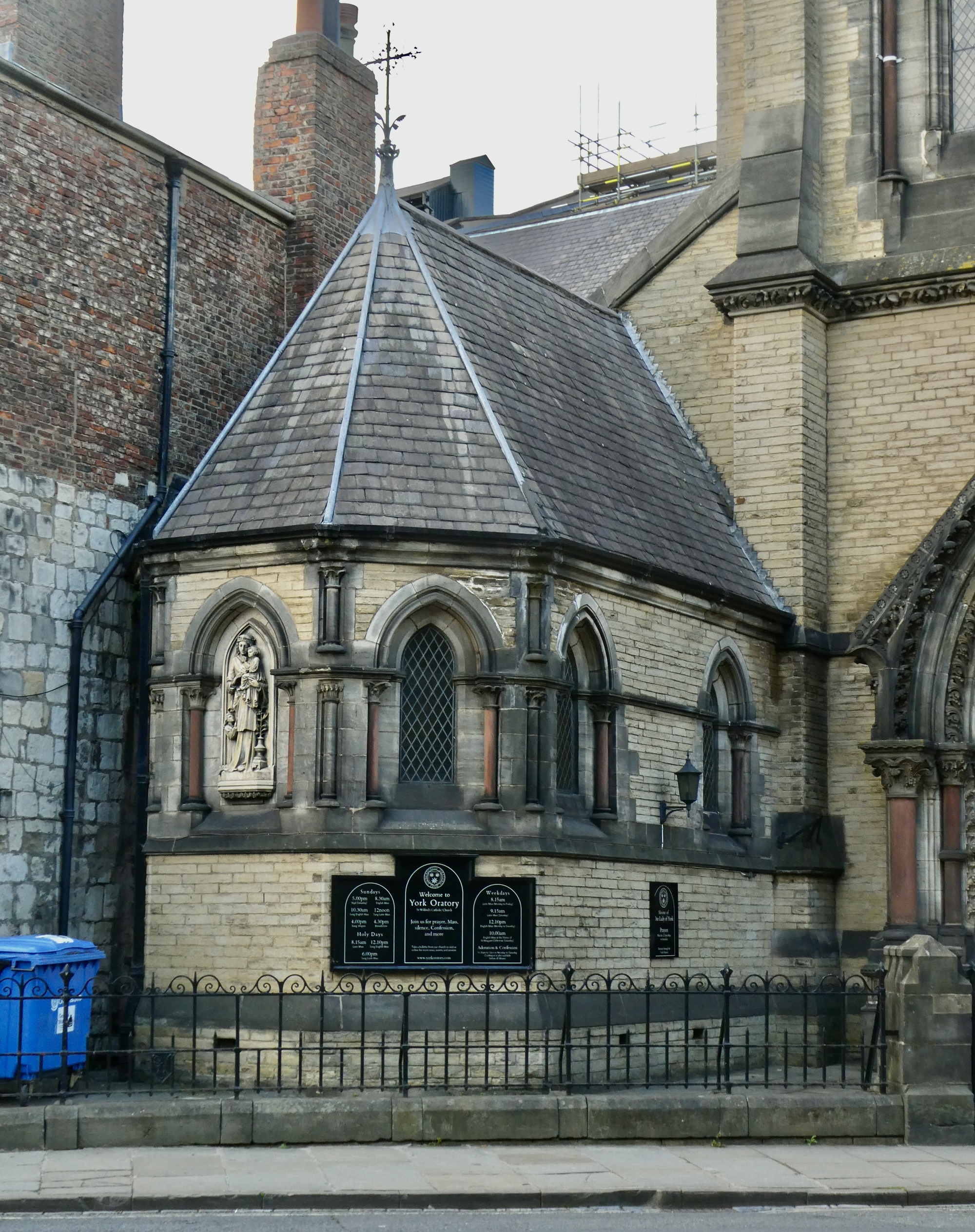The York Oratory. The church is known as the "Mother Church of the city of York". It is in Gothic Revival style. The arch over the main door has the most detailed Victorian carving in the city. The present church was completed in 1864 and is considered to be one of the most perfectly finished Catholic churches in England, rich in sculptures, paintings and stained glass.