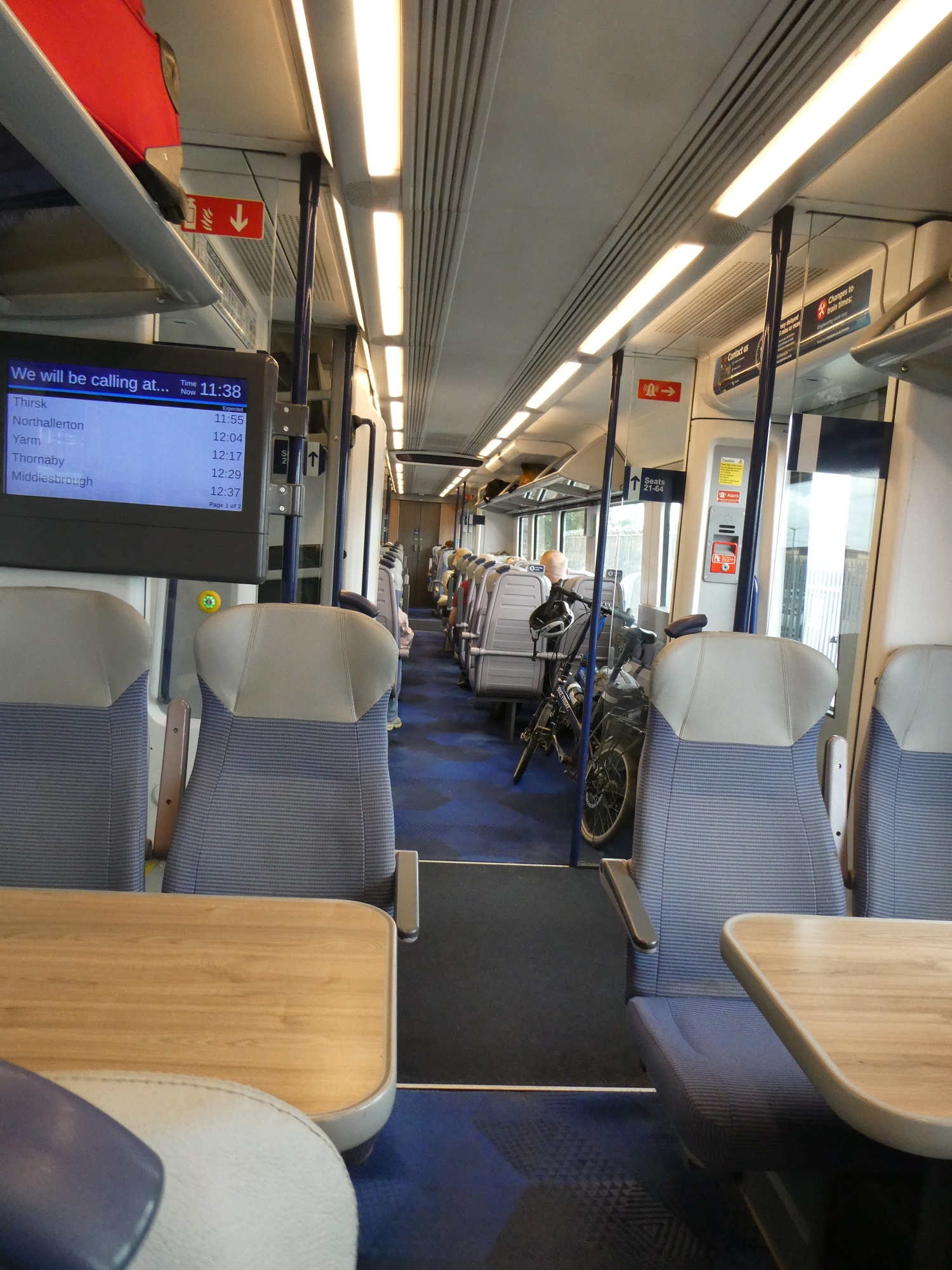 Other than that, Trans-Pennine gets high marks from us. Their trains allow you to book the two bike spaces their trains provide for free of charge. Trains to Saltburn-by-the-Sea run roughly hourly all day long, stopping at Thirsk. And the train, once we’re on it, is sleek, modern and comfortable. First class, even though we’re riding second class.