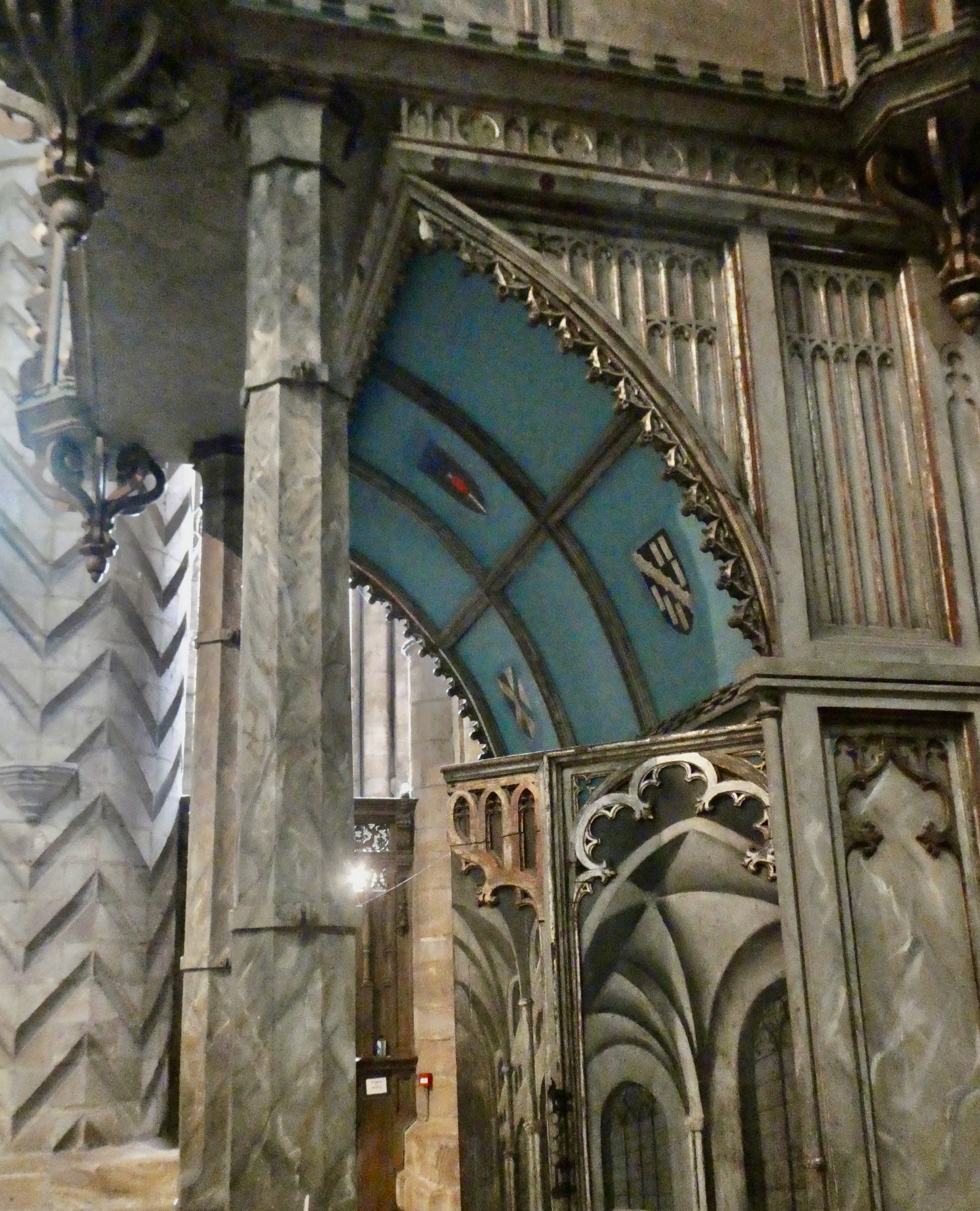 It’s not quite right to say that we’ve gotten blasé about cathedrals by now, but we don’t really seek them out the way we did when we first started coming to Europe thirty years ago. Durham’s cathedral really captured my imagination though, and I spent a considerable time staring at it from outside and then exploring its fascinating interior. It definitely helped my appreciation that I was here so early in the day because it was very quiet. There were only a few others out on the green, and even fewer inside the cathedral when I entered it. I don’t think it had been opened long for long, and none of the guides or volunteers would come on duty for another half hour.