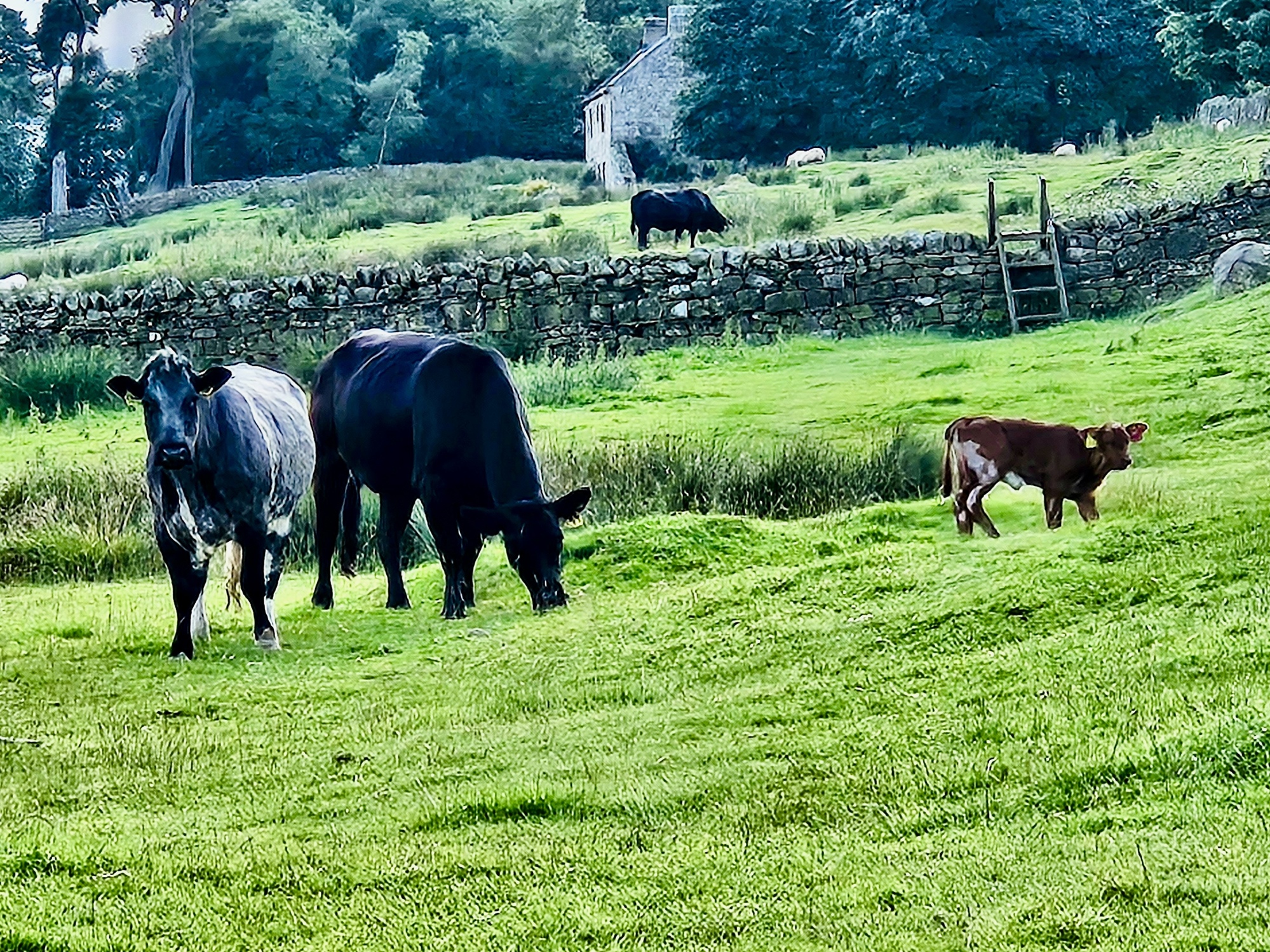 We’re about halfway up one of these climbs when I call us to a stop to consult the routes. We started out on one I mapped that splits from Route 72 near here and turns north toward Once Brewed and then beyond that to cross Hadrian’s wall before turning west and recrossing it to drop to our hotel. I picked this route partly because it would give us looks at the wall during the ride - but as rain is threatened and we’d be continuing to climb if we went that way I propose that we stick with Route 72, which I’ve also loaded to the Garmins as a backup. One other consideration is that we don’t want to miss our 1:00 lunch reservation at the Haltcastle Inn, the only eatery within a couple of miles of our B&B.