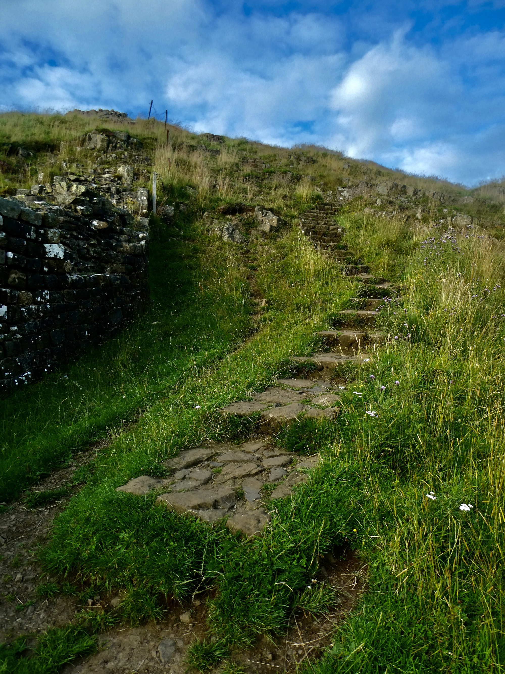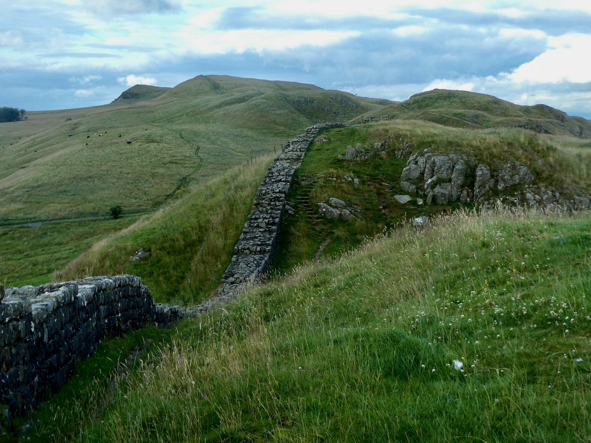 There is a wealth of information about Hadrian’s Wall, begun in 122 AD under the reign of Emperor Hadrian. It runs coast to coast for 83 miles across the narrowest gap in England, just south of what’s now the border with Scotland. Much of the original wall no longer exists except for traces here and there, as much of the original material was used in early modern times as building material for homes and bridges. Were in one of the best locations for seeing what remains though - starting at Cawfields (the gap just north of here in the ridge the wall straddles) the wall is nearly unbroken for at least the next five miles to the east as it crosses some of the most rugged and dramatic terrain of its entire length.