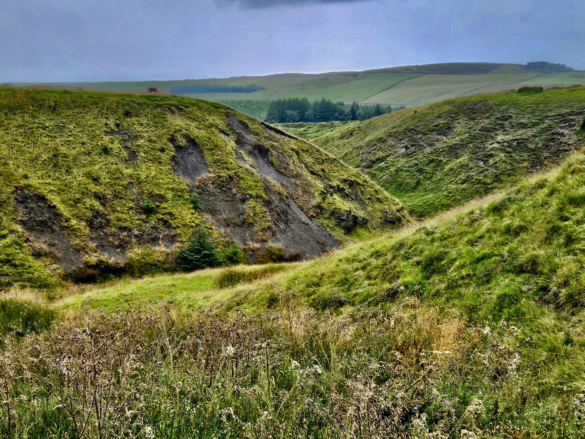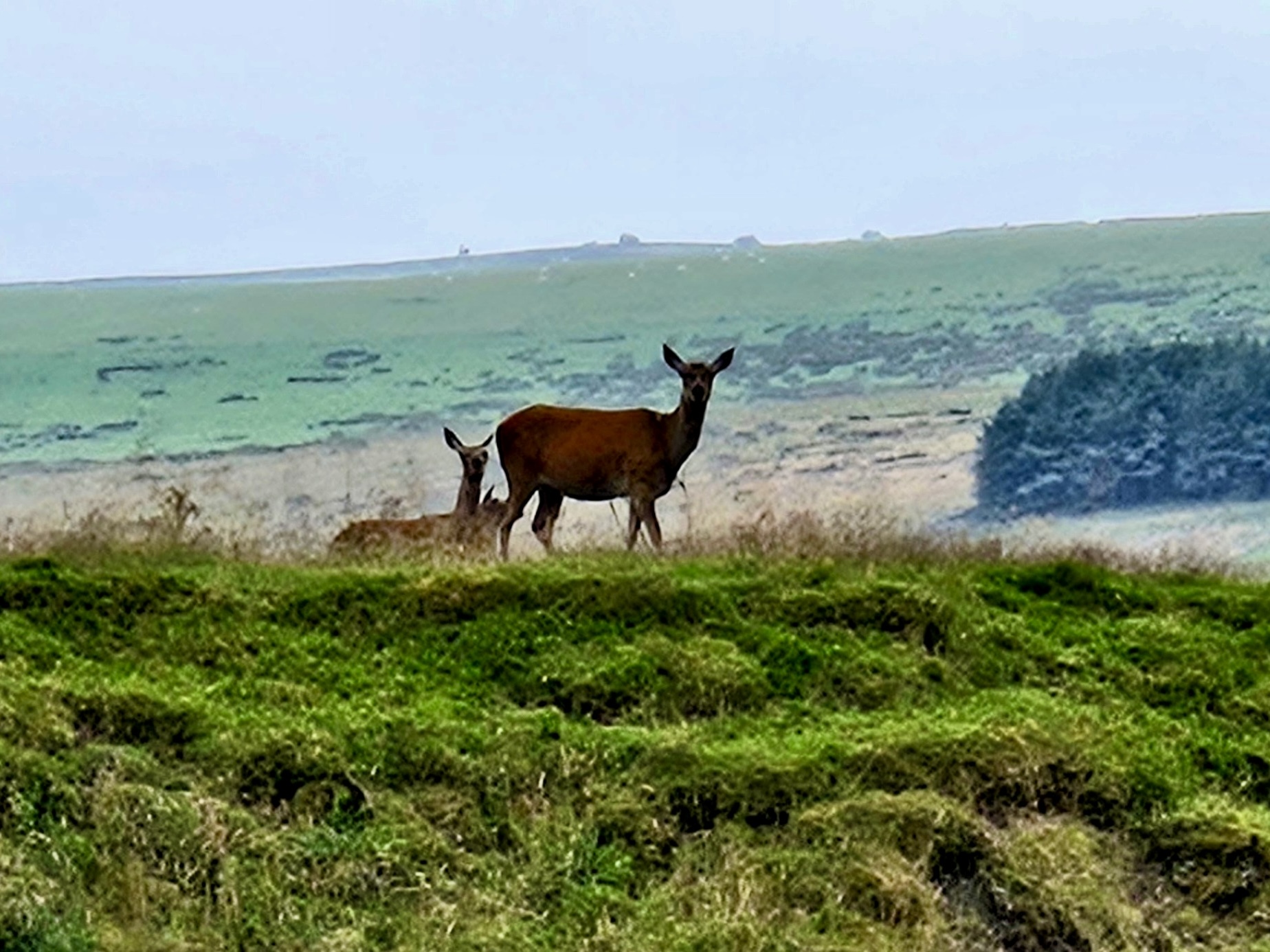 There’s still a lot of day left, so after we check in to our room Rachael goes for a walk southeast up steep High Hill Lane to look for the Scaliber Force Waterfall that’s highlighted as a feature on the map. She misses the waterfall somehow but does even better when she spots a family of red deer staring down from the crown of the nearest ridge.