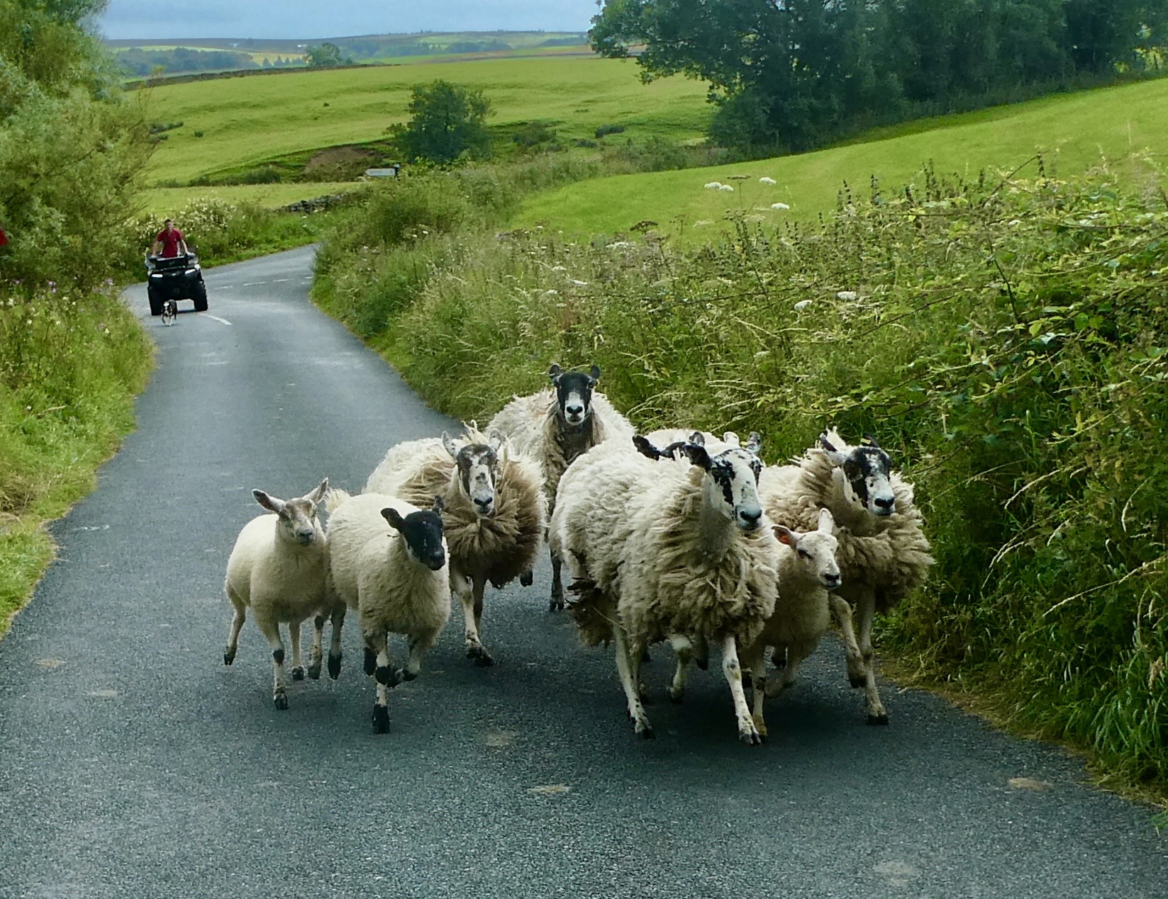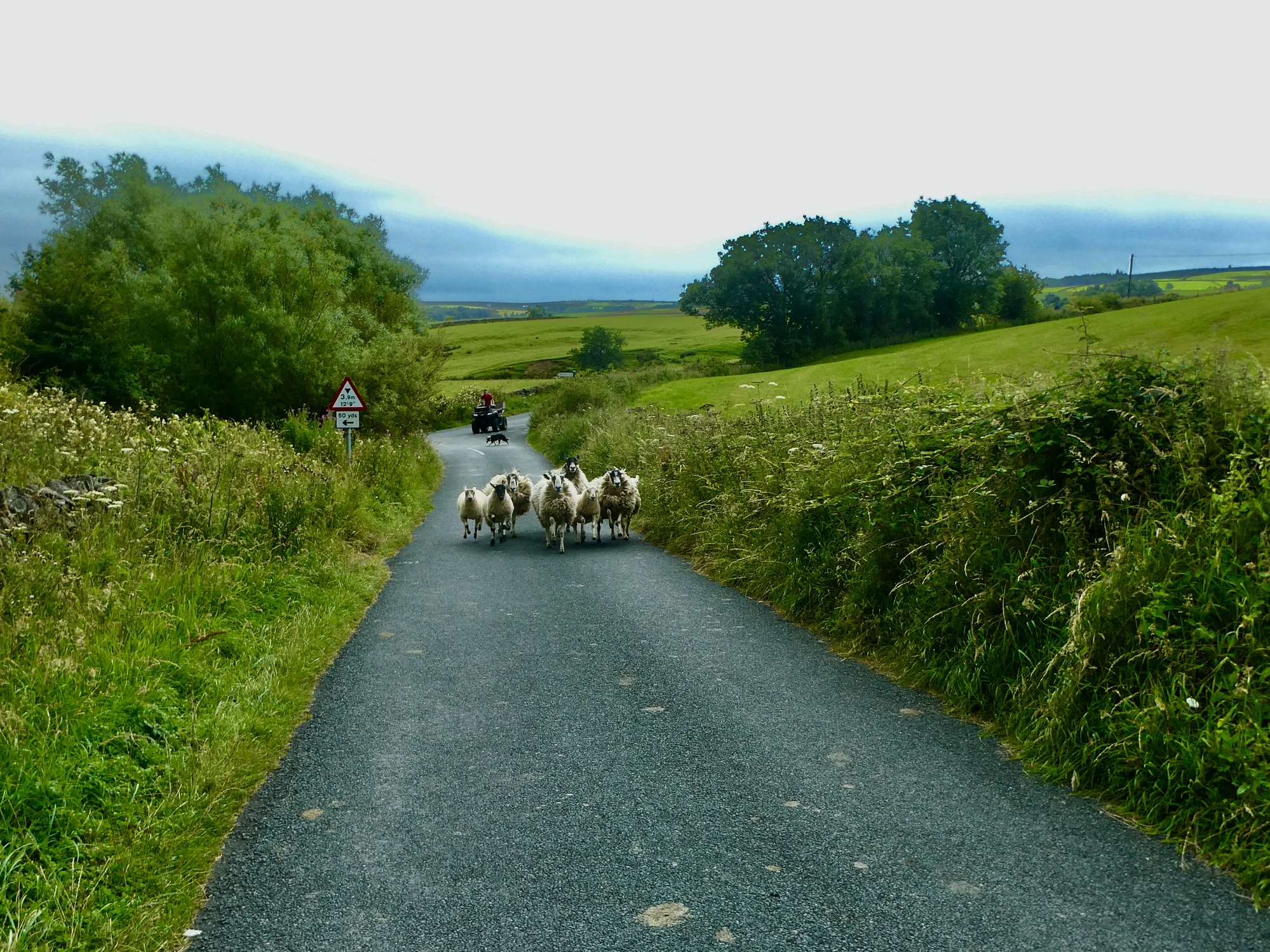 Nearly all the work comes in the first two miles, a steady climb that gains 500 feet crossing the low southern end of Ingleborough. After that it’s downhill and leveling out the rest of the way as we drop into Settle’s valley, Ribbledale. It’s really a pleasant ride - quiet the whole way, overcast but dry; and it has one great highlight to remember the short ride by when a small stampede of sheep rounds the bend in the road a hundred yards ahead of us and races straight at us, a sheltie and a guy in an ATV in hot pursuit.