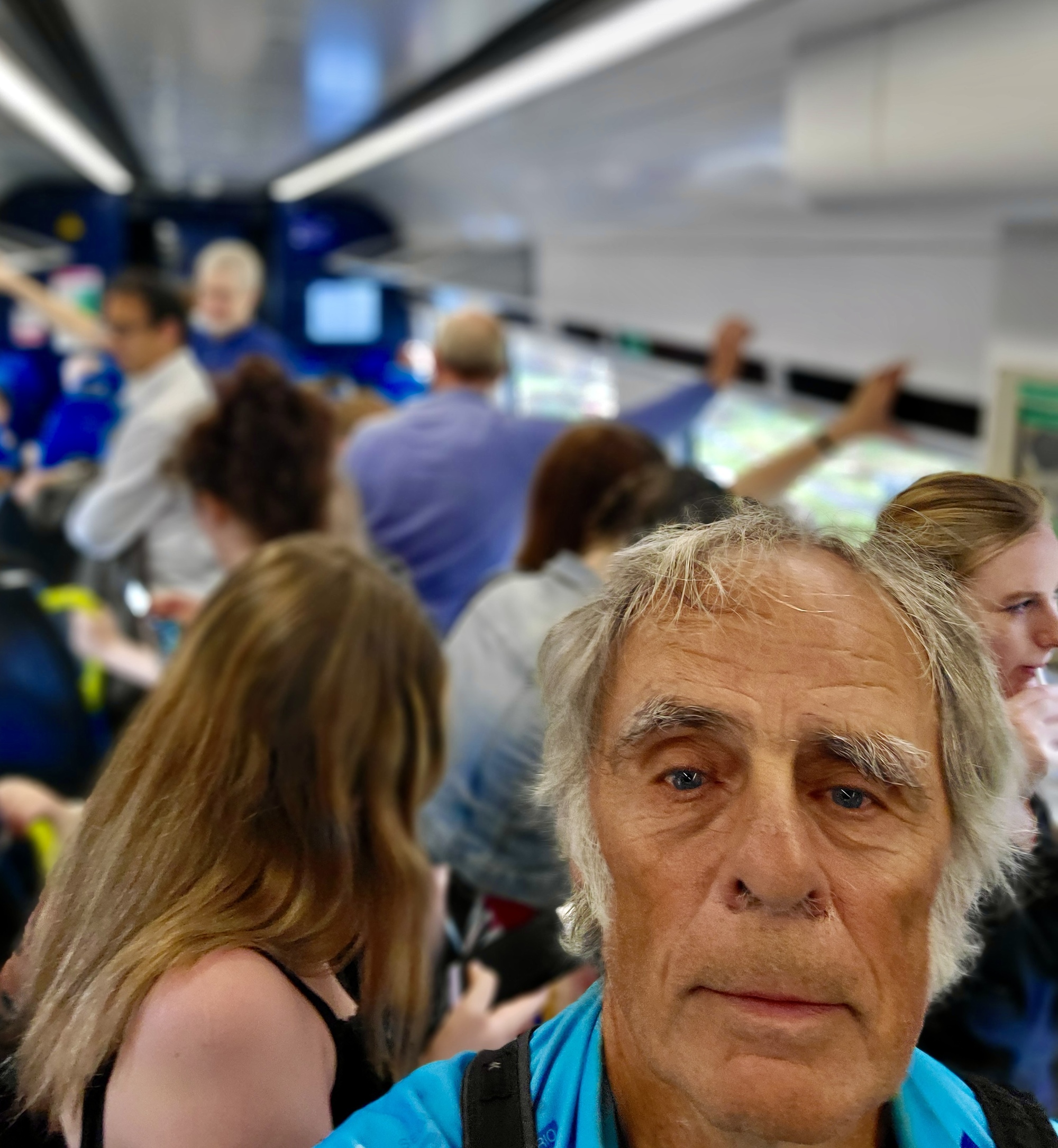 It’s a surprising scene. The entire platform is crammed with 100 to 150 or more people lined up two deep for the whole length of the train. It will become apparent soon that these are all folks like ourselves, trying to get south because the Kings Cross service is down. Still later we’ll learn that there’s been a major mechanical issue, a failure with the overhead line apparently.