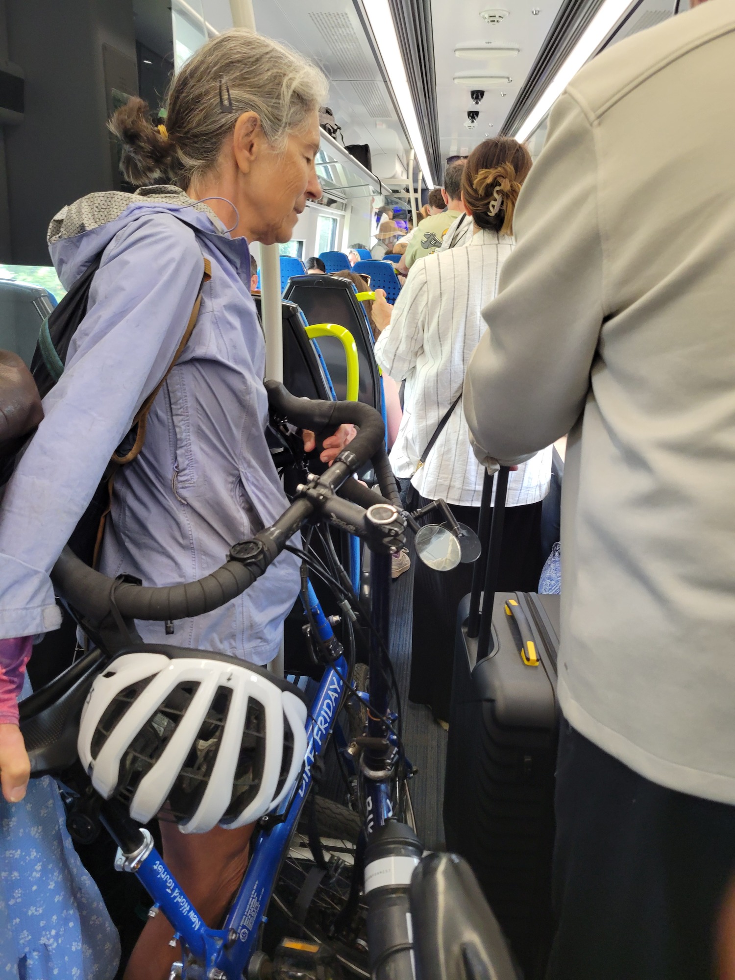 So boarding is a complete madhouse. We let most of the other folks rush in first rather than try to wedge in among them with our bikes; but it’s SRO by the time Rachael boards. There’s a scare when it looks like I won’t be able to board too and I’m just about to holler to Rachael to meet me at the hotel later when I manage to get in somehow - and then so do three others. A completely crazy scene. We spend the first half hour standing, Rachael leaning against a wall with her bike leaning against her, and me standing in the center with my bike in front of me and balanced against hers, surrounded by other folks standing and crowding us on all sides. It’s awkward, uncomfortable, and we feel every swerve and jerk of the train.