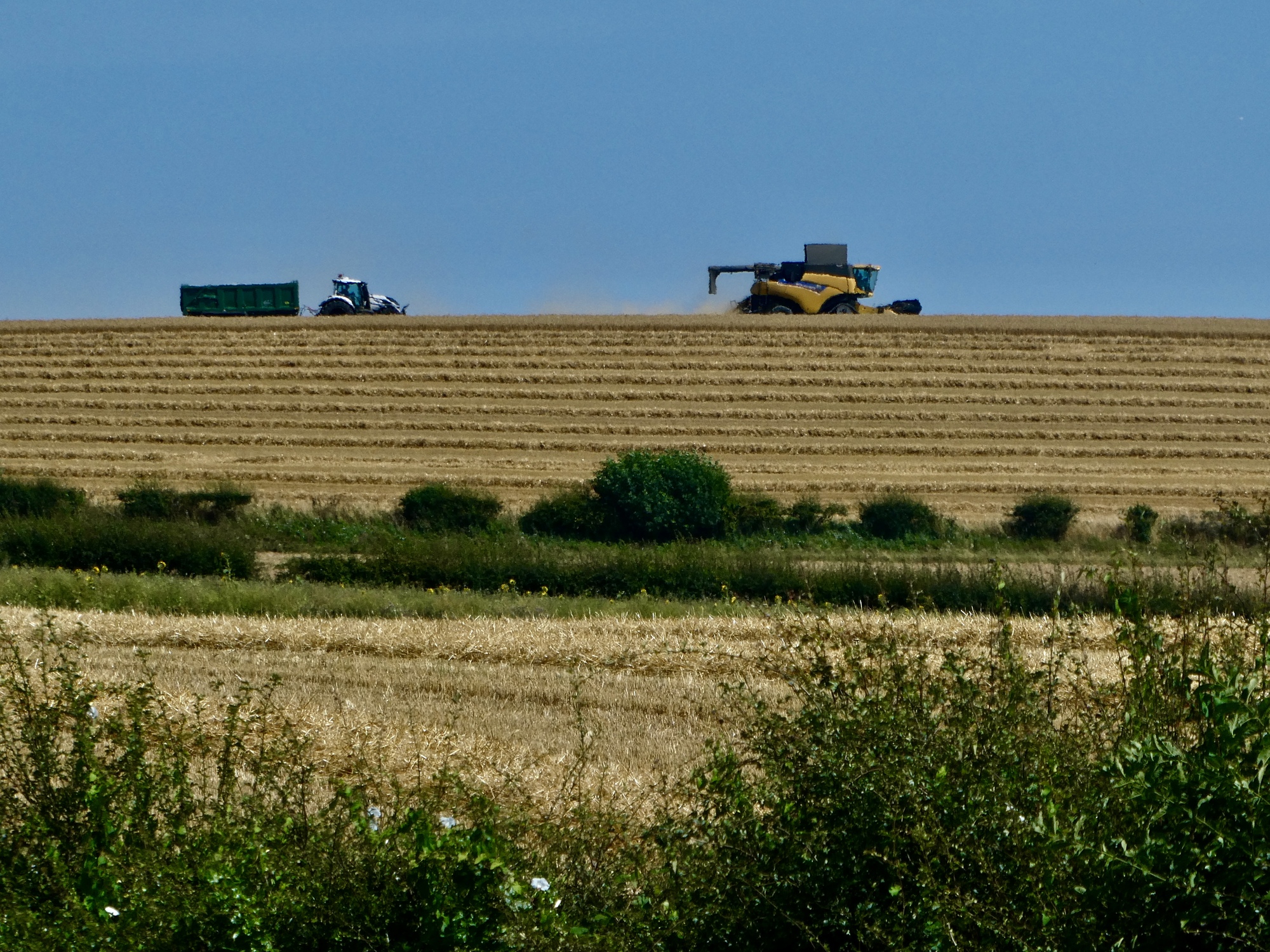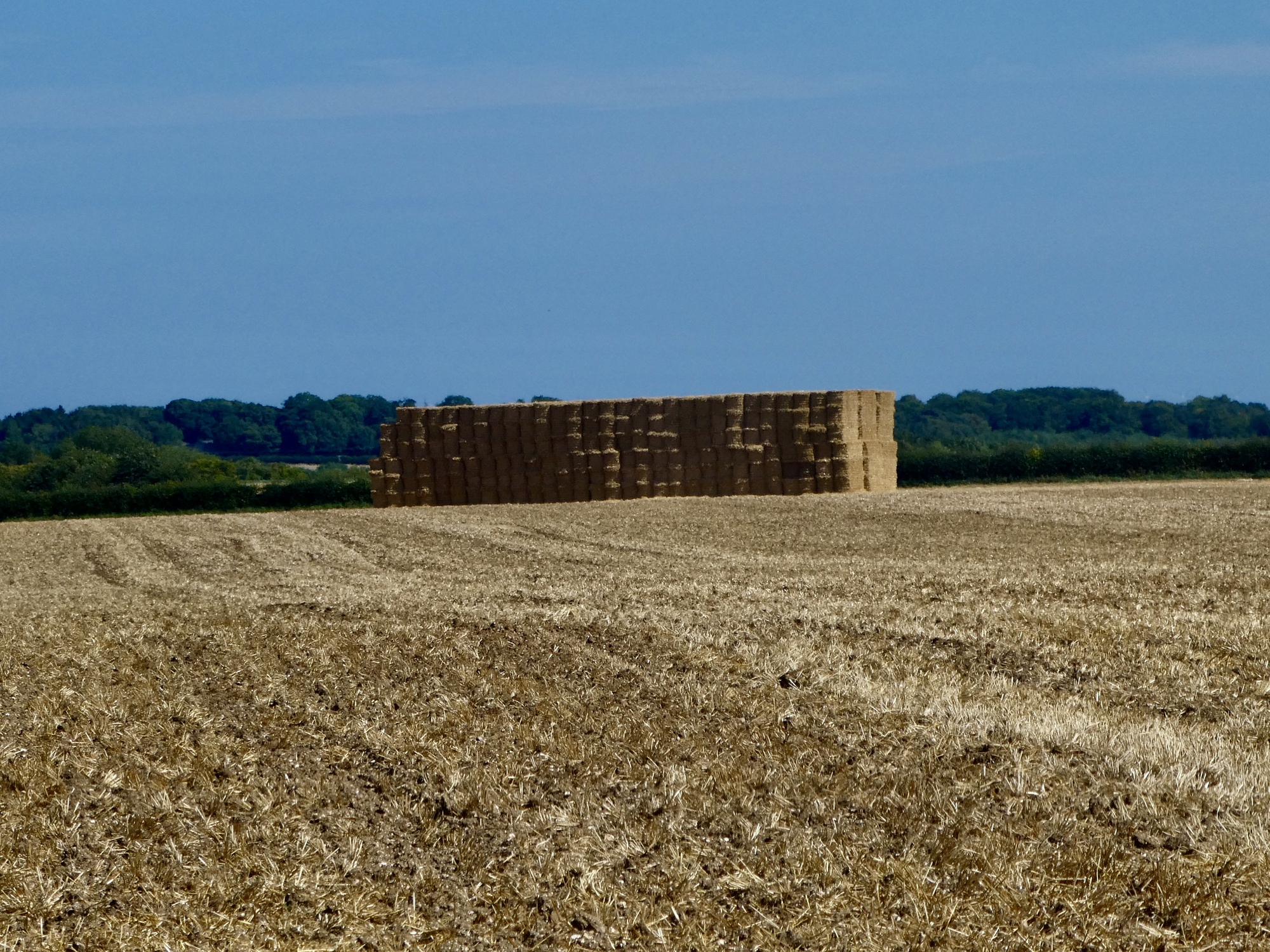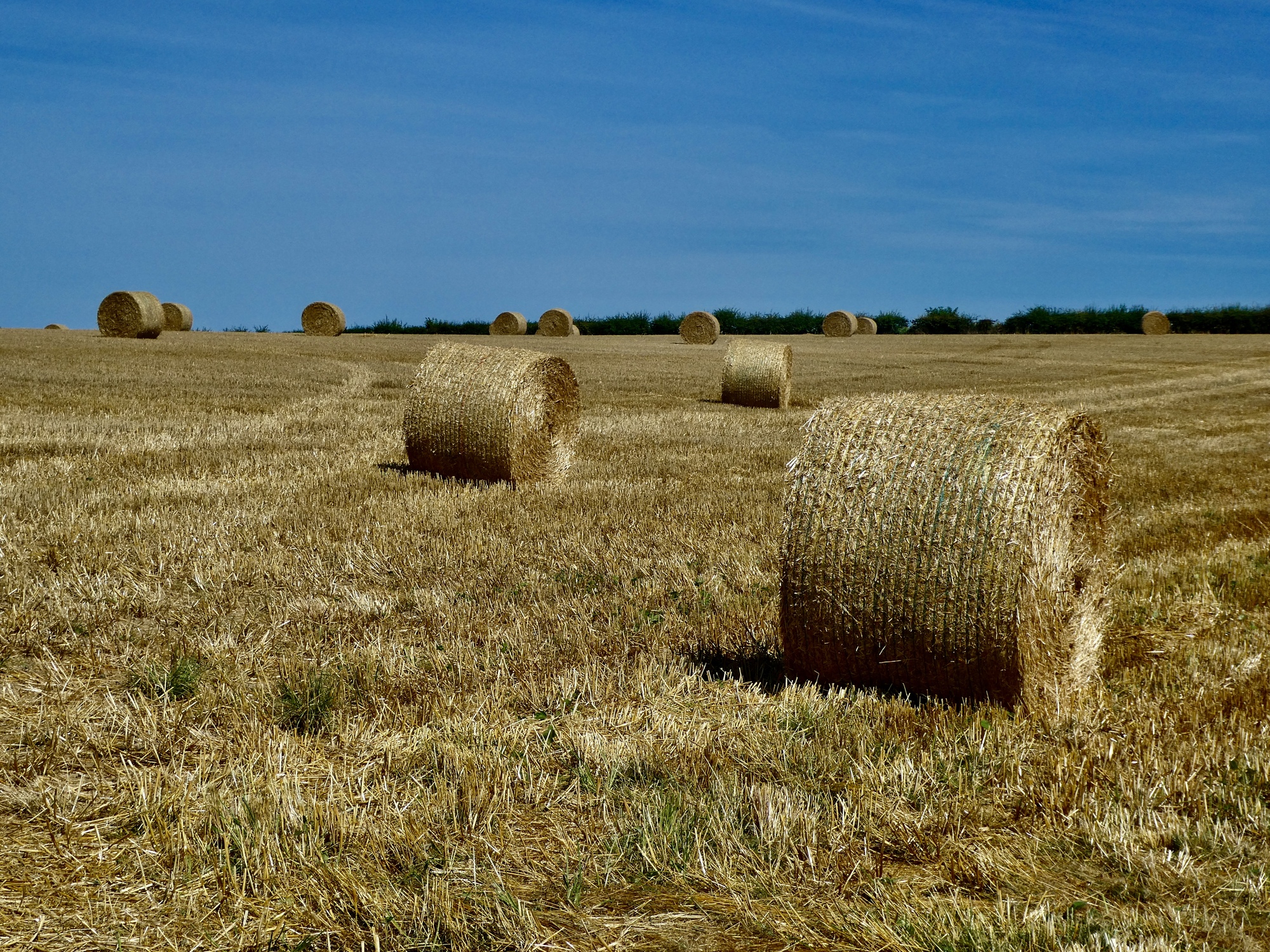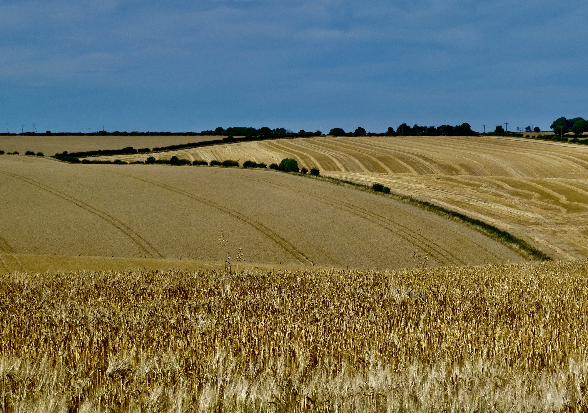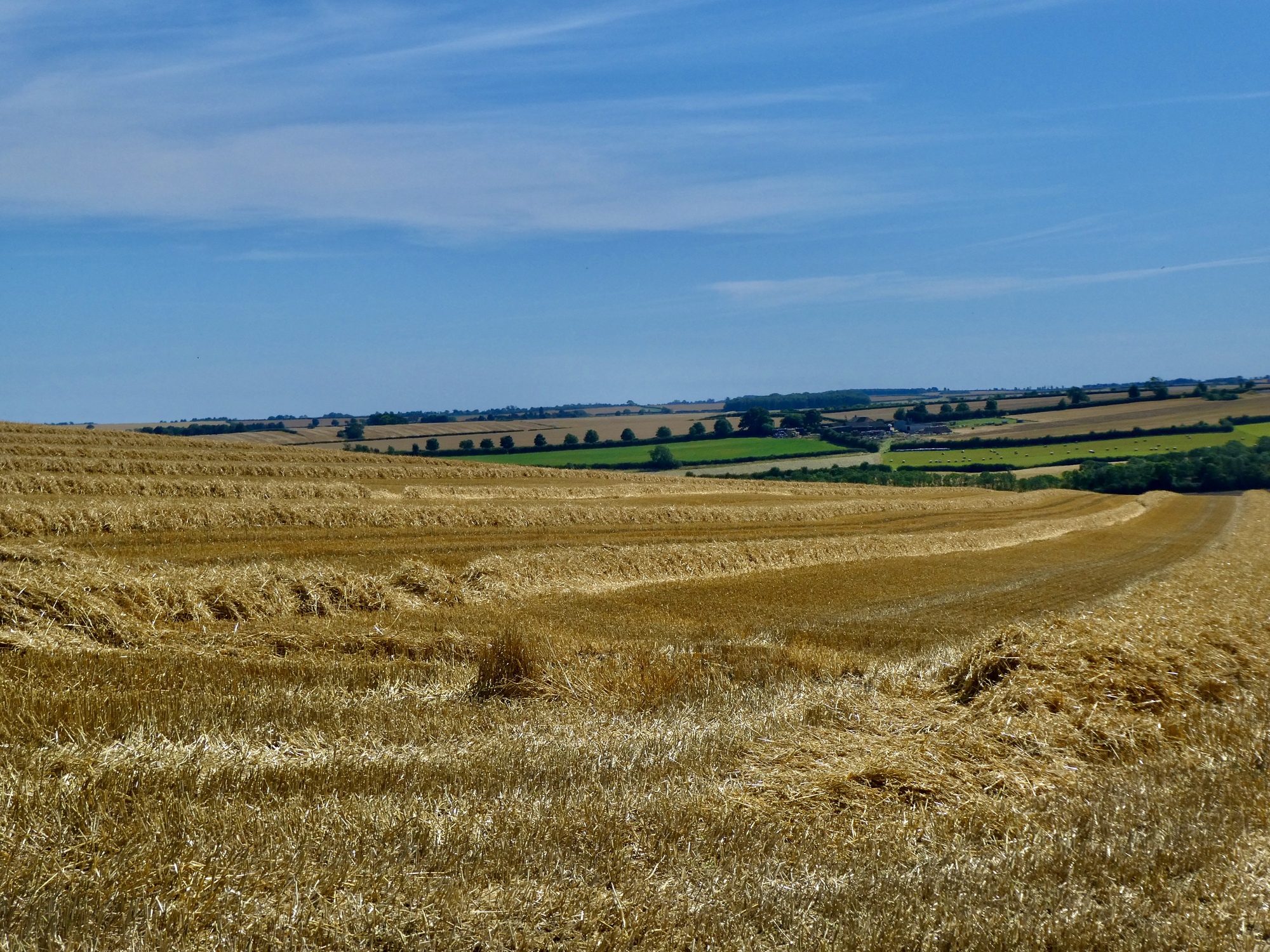 A bit further on I come to a junction and turn north onto Blue Heath Road. The next mile are the best part of the day as I ride past one golden wheat field after another. The harvest is on, so there’s a mix of freshly shorn fields, baled hay, and unmowed fields rippling in today’s strong wind. Its mesmerizing, and a much different feel from when we were here a month earlier in the season when the fields were still green.