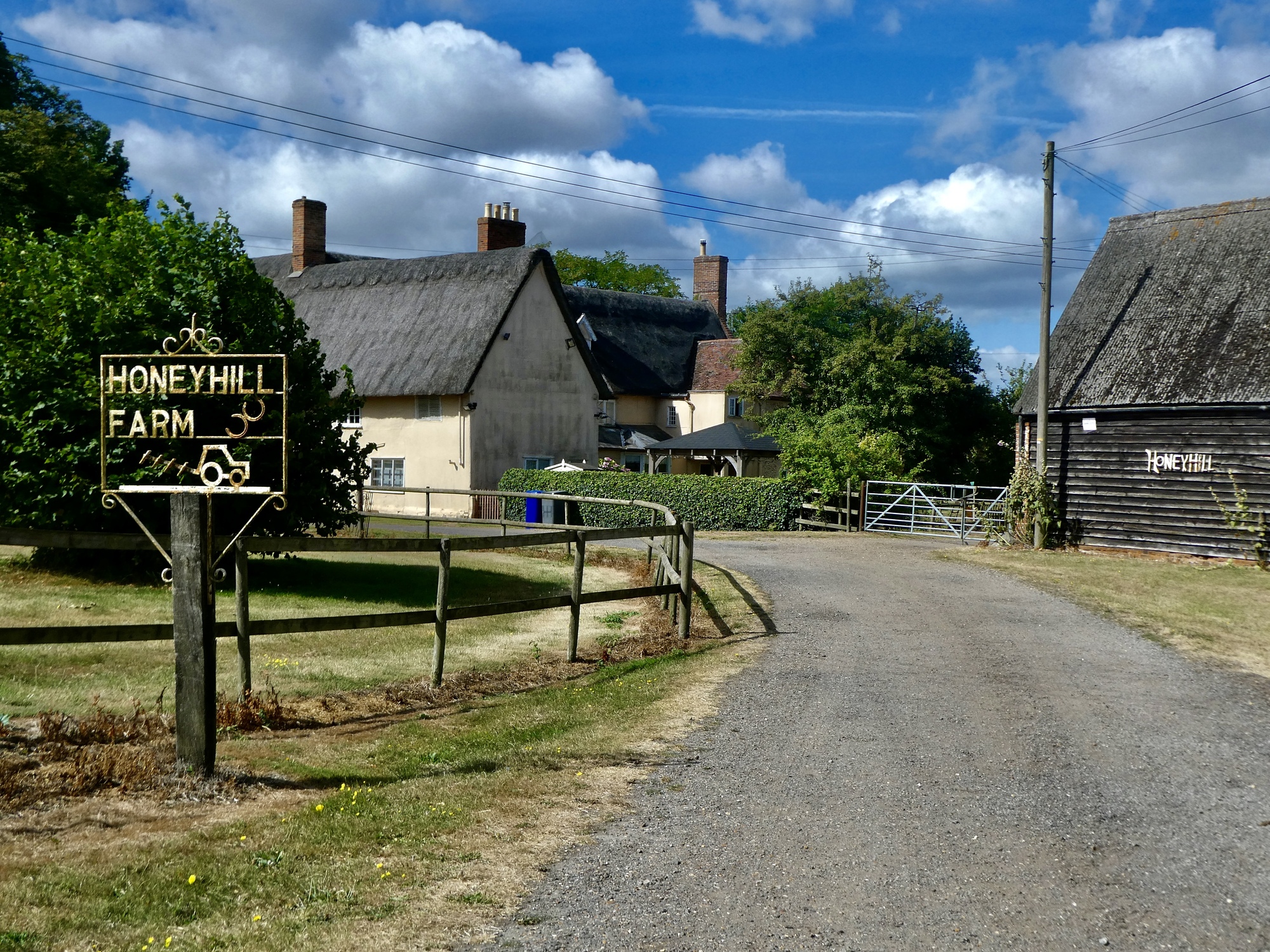 It’s only about three miles to the next dot on my route map, Risby. On the way there though I stop to admire attractive Honeyhill Farm and another fine thatched roof house. I stand at the entrance to the driveway and take a half dozen shots of the scene from different angles, and when I’m done I turn around and there’s a tall, gaunt elderly man standing there in the middle of the street, his eye on me as he puffs away on his vape pen.