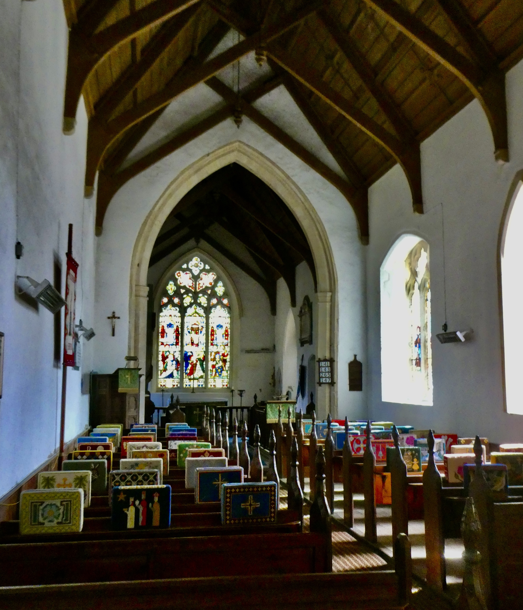 And the interior has its own unique surprise too, with the pews lined with needlework embroidered boxes, each with a label on the backside identifying it as a memorial to someone.
