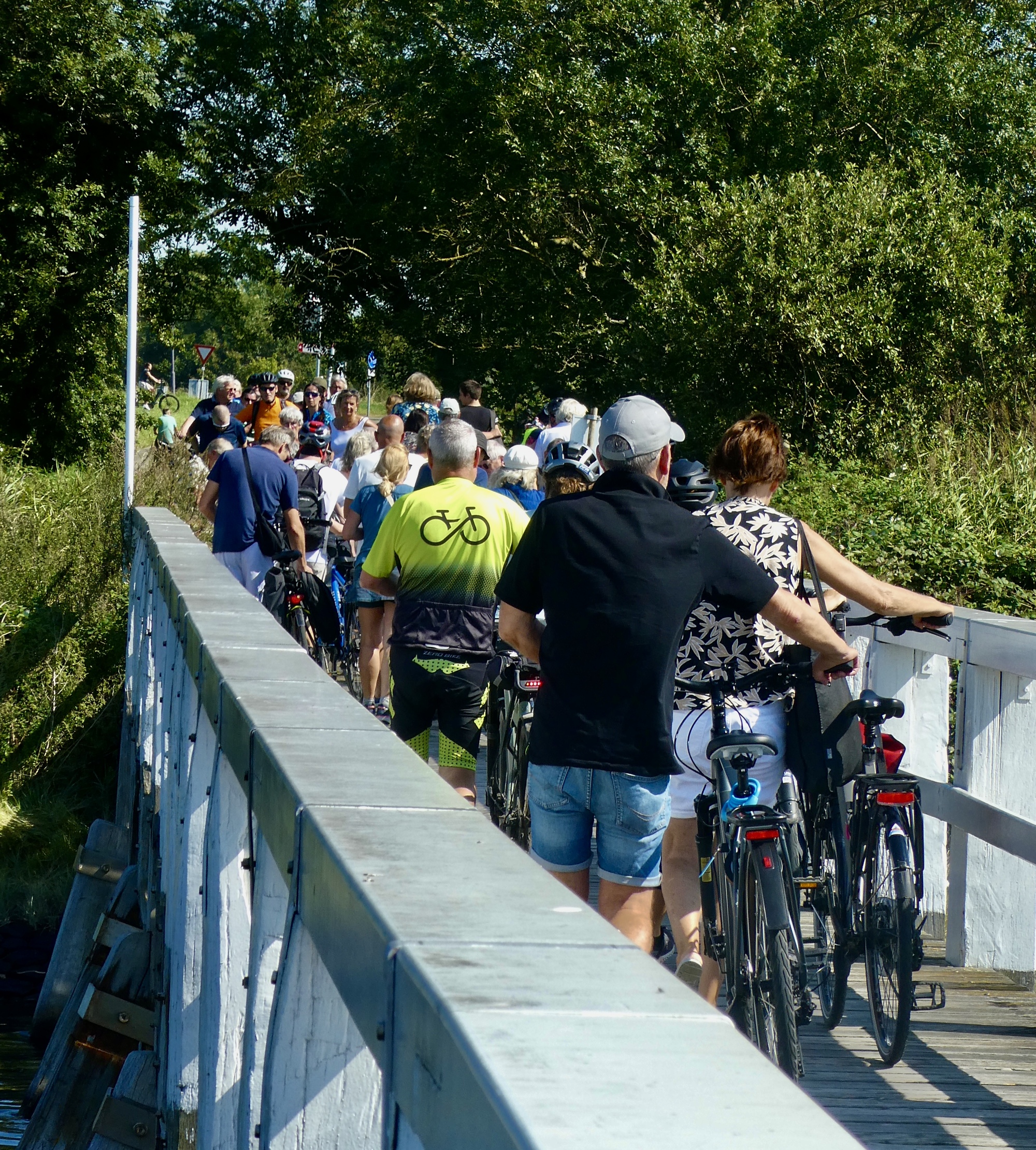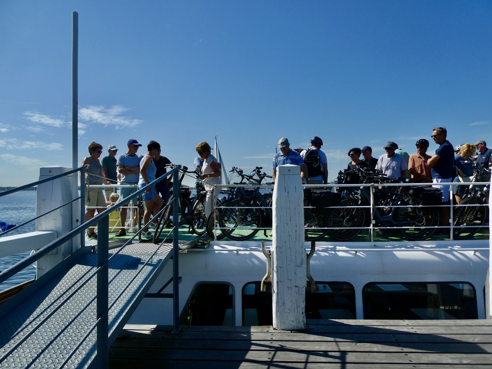 It’s a shock though when the boat is near enough for a good look and we see that the top deck is completely covered with bikes and cyclists. And once the boat lands, it takes forever for them to offload as they carefully walk down a steep gangplank one at a time, the ship captain’s assistant instructing them to keep their brakes on. And by the time we’re ready to board a long line of bikes has arrived behind us, enough to completely fill the ship. It takes close to a half hour for the unboarding and boarding process to complete and we finally set sail for a crossing that only takes about ten minutes.