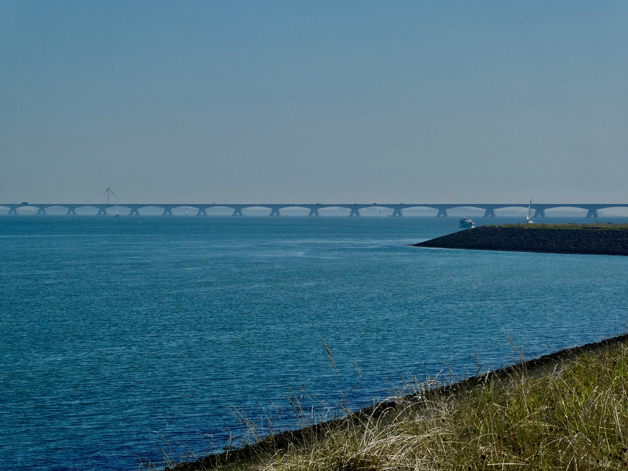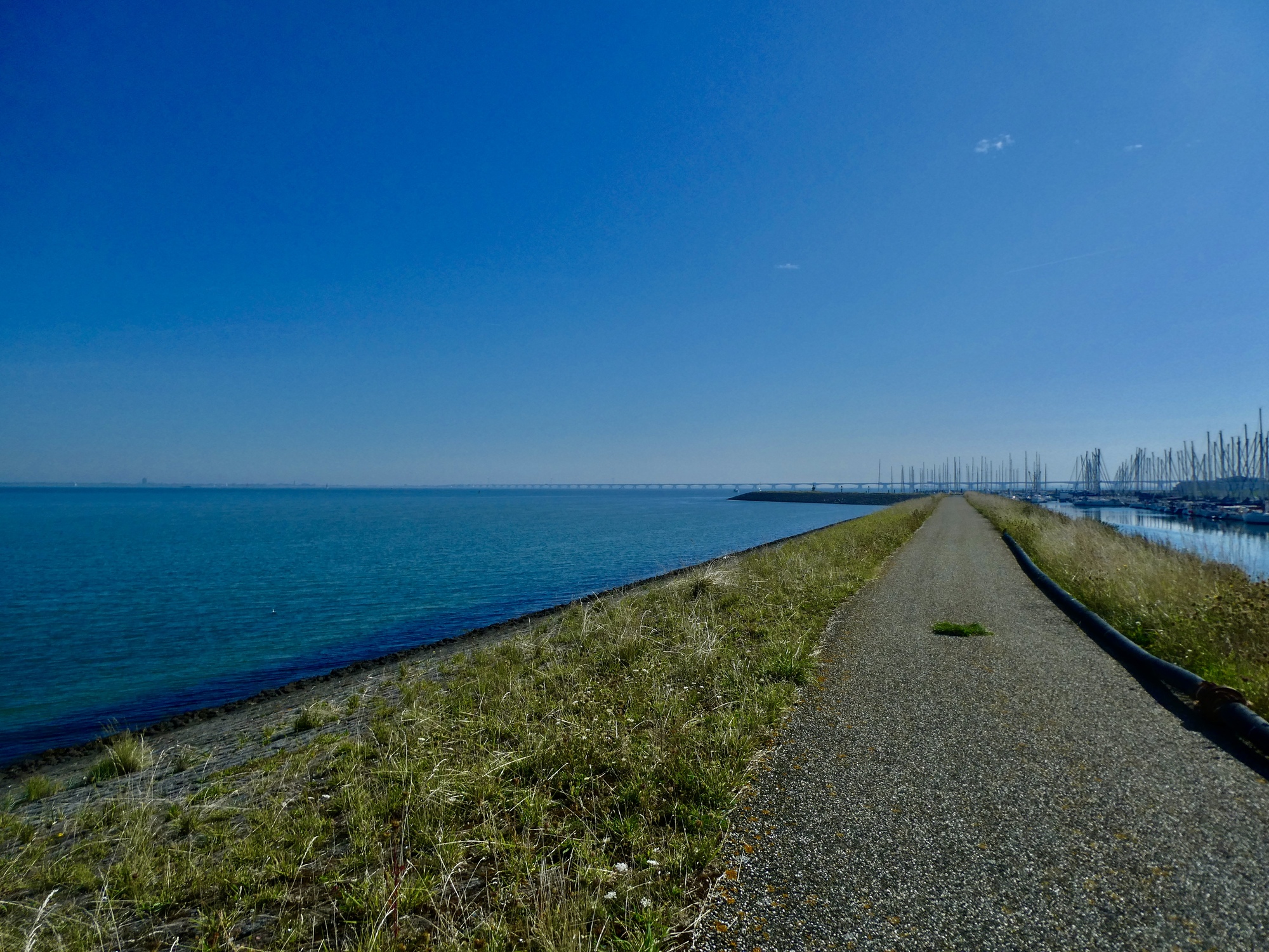 Finally off the bridge we turn west. We miss the turn to the bike path that runs on the seaside of the twenty foot high dike, so we ride the quiet road along the base of the landward side for perhaps a mile until we come to a connector and climb over to the more scenic side where I’m happy to get a good view back at the bridge and Rachael is excited to find a public restroom! We’re only six miles into the ride but of course we break here, not knowing where our next pit stop is coming from.