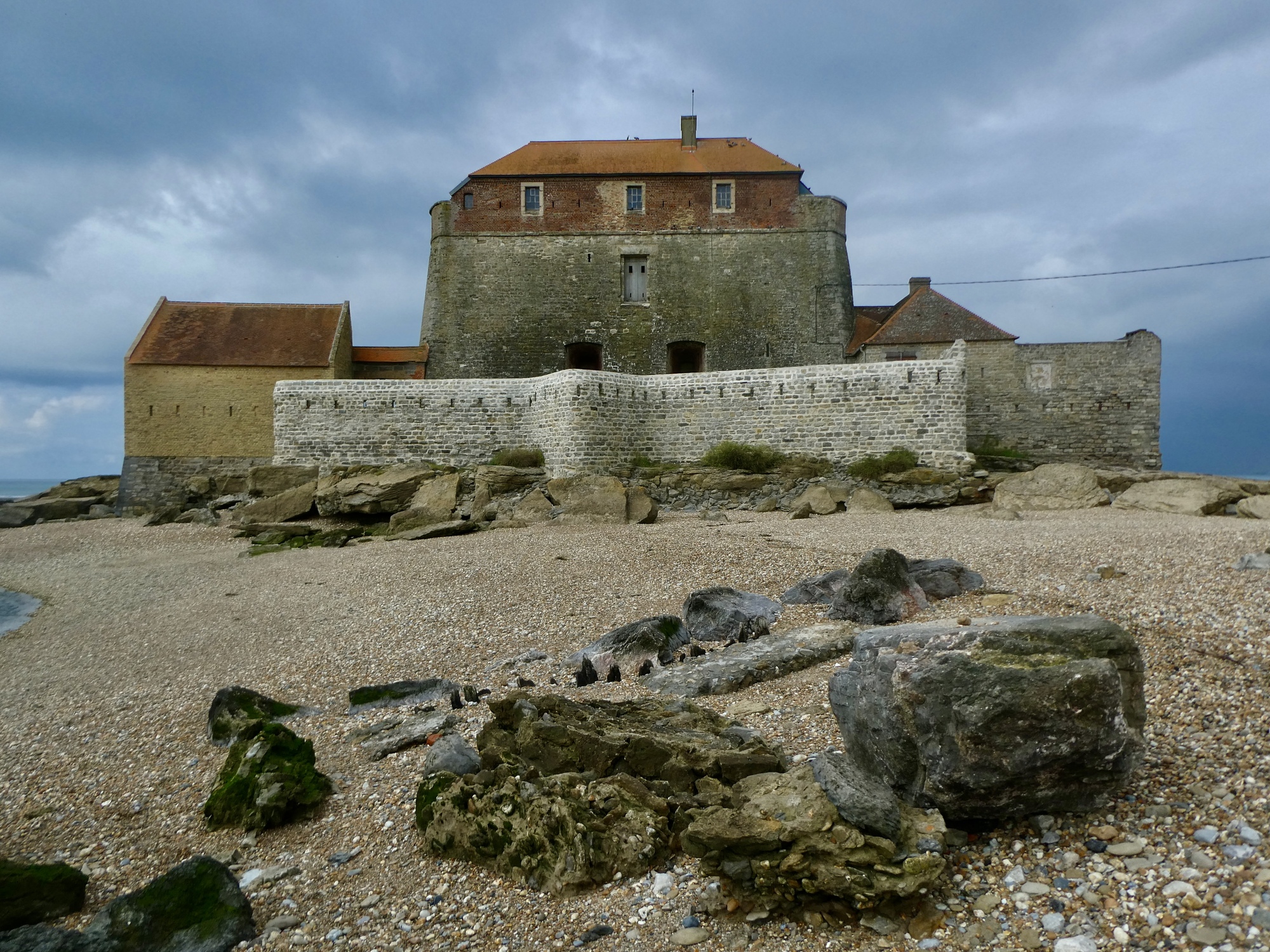 Dropping down the opposite side of the headland past a series of high sand dunes that I could have stopped for a photo of but didn’t, I come to another of France’s 10,000 lesser but still pretty grand sites: Fort Ambleteuse. Built in the late 1600’s and presumably by Vauban, it is beautifully situated at the mouth of the La Slack River. I lean my unlocked bike against a post and walk out on the beach far enough to get a good look at it with the sun at my back, but don’t continue around to view it from the seaward side because I want to be able to see who’s stealing my bike when they ride off with it.