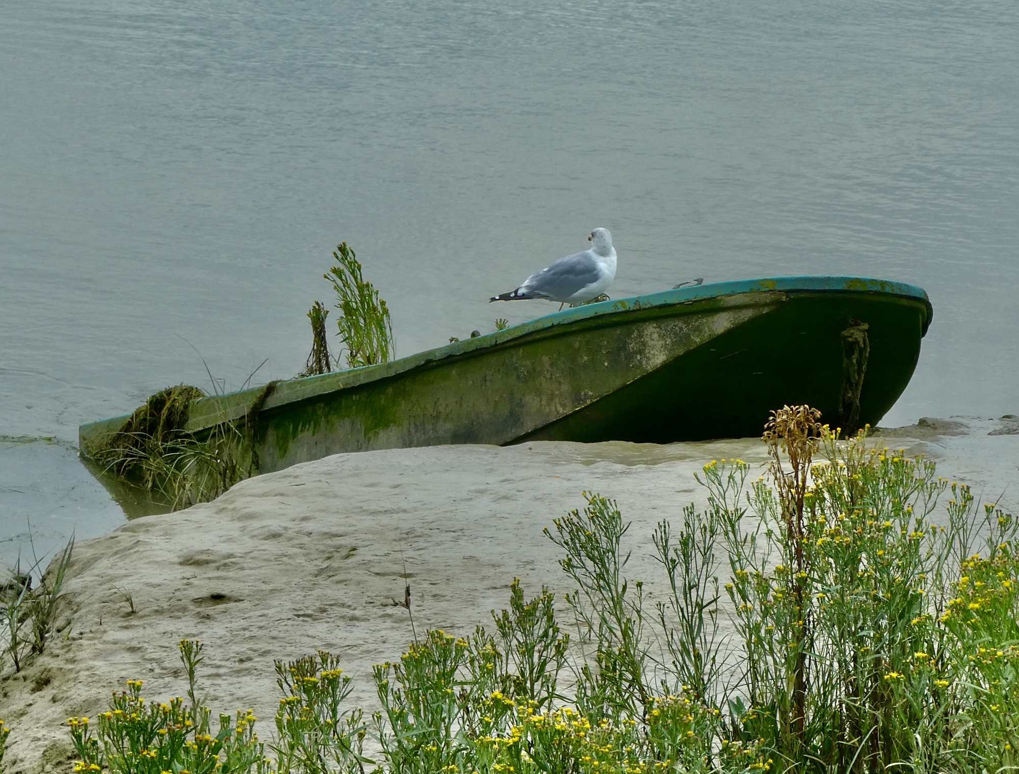 So I cut my losses and bike back toward town, thinking I’ll bike along the water on the trail to Cap Hornu when I get there. That doesn’t happen either though, because when I approach town it unexpectedly starts raining. Rain was in the forecast for this afternoon, but it’s arrived about three hours early. It’s lucky I changed my mind, given this. I would have ended up stuck on the opposite side of the bay and fifteen miles from home when the rains hit otherwise.