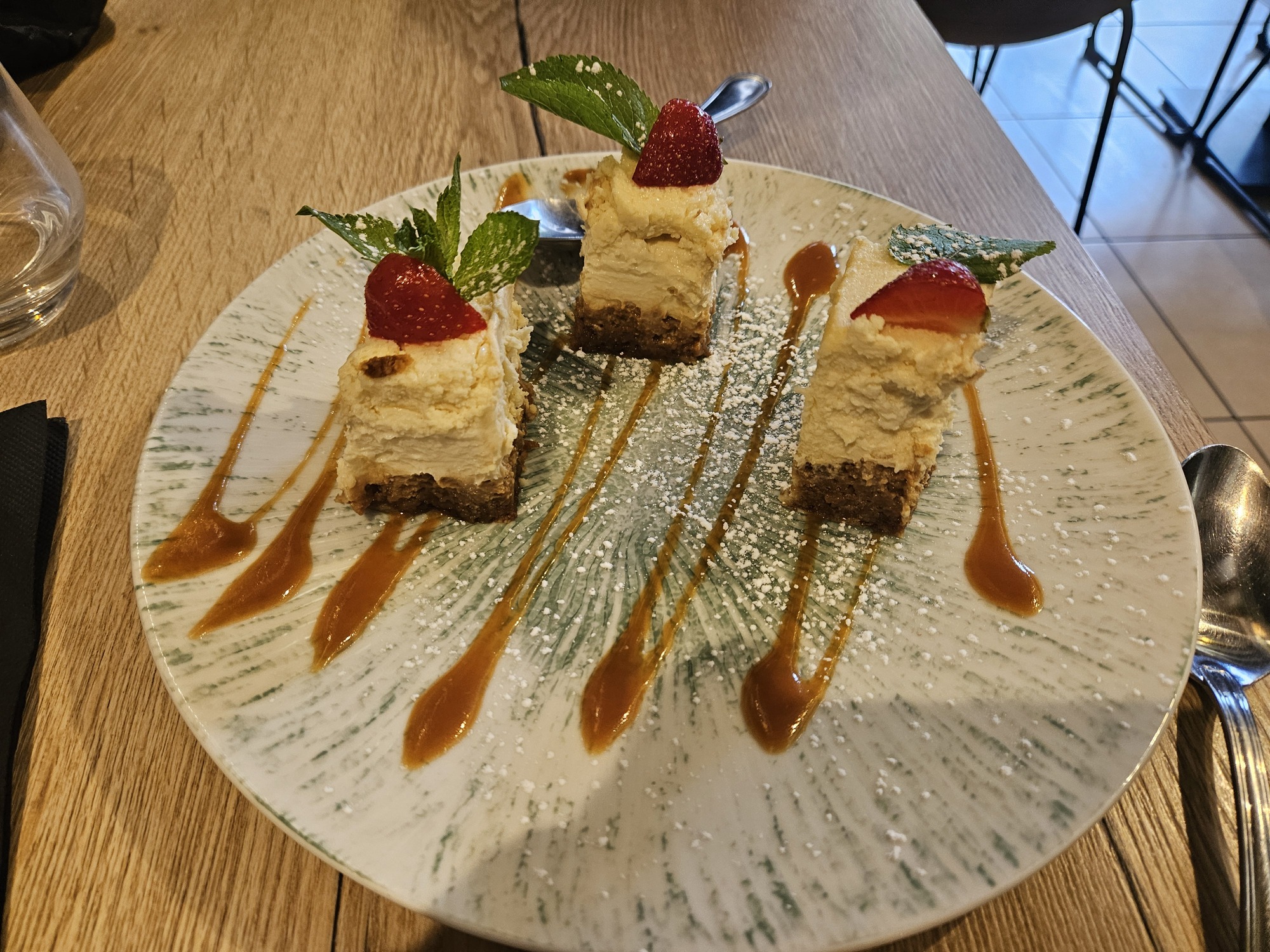Lunch was excellent again. In a rare event we both ordered the same dish, a complete duck breast. Rachael, who of course has a better taster than me, reports that the caramel sauce was excellent. When we placed the order I also ordered cheesecake for myself, but we were both stuffed after our filling main. In a humorous surprise though, my request to forget the dessert was misunderstood. Somehow we managed though.