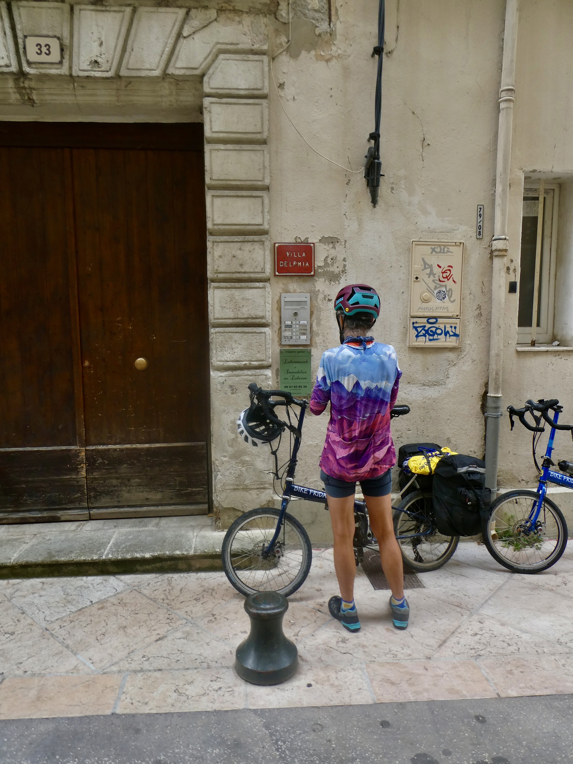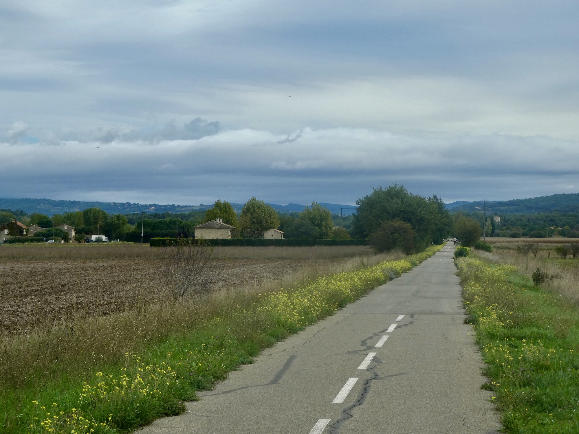 Checkout is at ten, which works well for our plan to bike to Apt in time for lunch. It should take us about two hours, which will get us there at the opening hour for the restaurant Rachael’s picked for us today but not made a reservation for. When it comes time to leave though we note the forbidding overcast sky out our window, check the weather forecast, and are startled to see that now it’s supposed to be lightly raining for the next two hours. Completely unexpected.