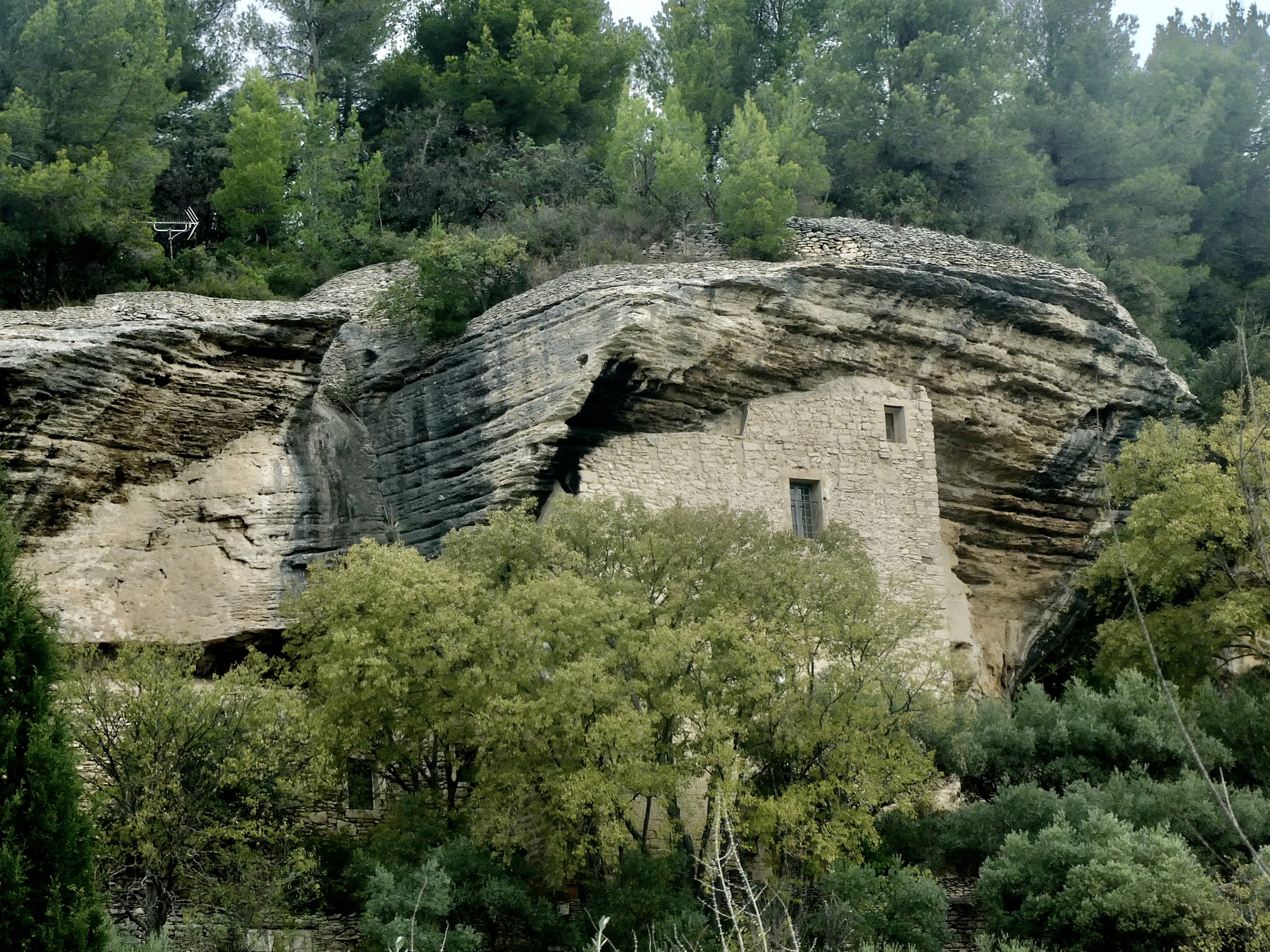 We don’t stop often, with the two important goals of staying ahead of the weather and reaching our restaurant while there’s hopefully still a table waiting for us, so we mostly rely on the GoPro at first. Once it’s clear that we’re going to stay dry though and are doing well for time we allow ourselves stops here and there: we detour to cruise the small neighborhood at La Baumette, the curious settlement with a few troglodyte homes built beneath a limestone overhang: and later, we stop for a good look at Pont Julian, the two thousand year old arches Roman bridge - and this one really is Roman, built under the instructions of Julius Caesar as part of the Via Domitia in 3 BCE.