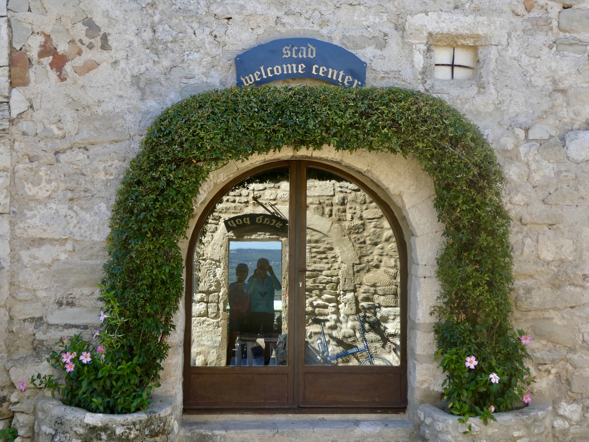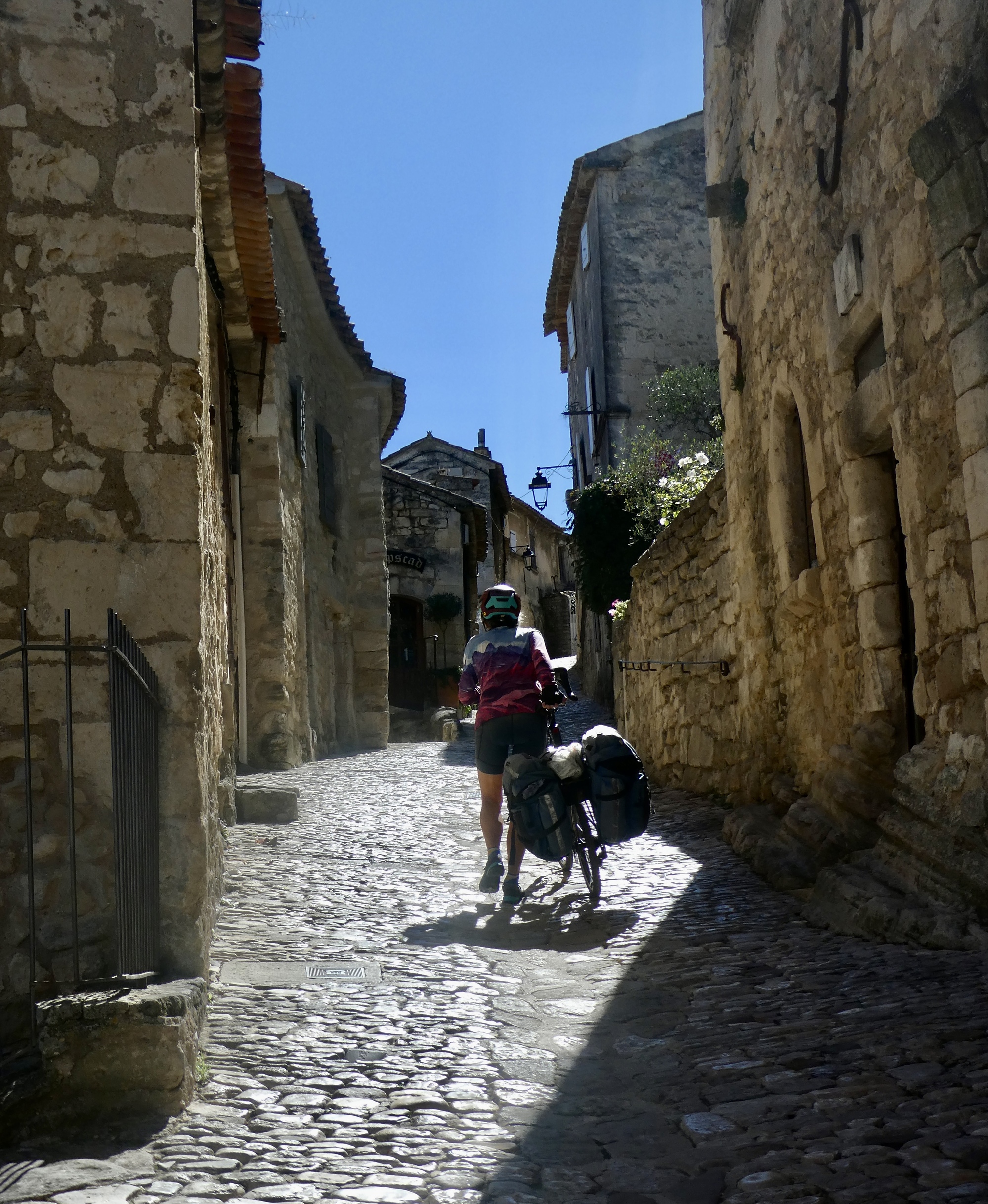 I’m not even to the first arch though when Rachael calls me back: up here, dummy! Because the restaurant doesn’t sit at the top of our climb. We get to coast down to Ménerbes, but first we have to climb up to the top of the village. And it’s steep, and it’s stony, and it hurts Rachael’s feet to push her bike up walking in her bike shoes. Between the climb to the village and this grinder to the top she’ll be achy in more ways than she can count by the end of the day.