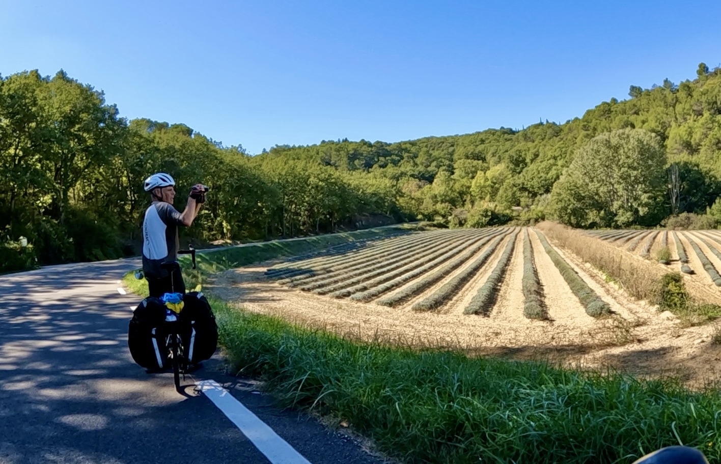 Pont Julien is the spot at which we leave the EV8 and turn south into the hills for the climb to Lacoste. We can’t go yet though, because somehow we failed to load the right route to the Garmins. We have the one that skips Lacoste and goes to Ménerbes directly, but that doesn’t fit with our food plan. There’s some stress, a few Rockydarts®️ get parried, but fortunately Rachael manages to download the correct one and soon we’re on the way again and before long the climb begins.