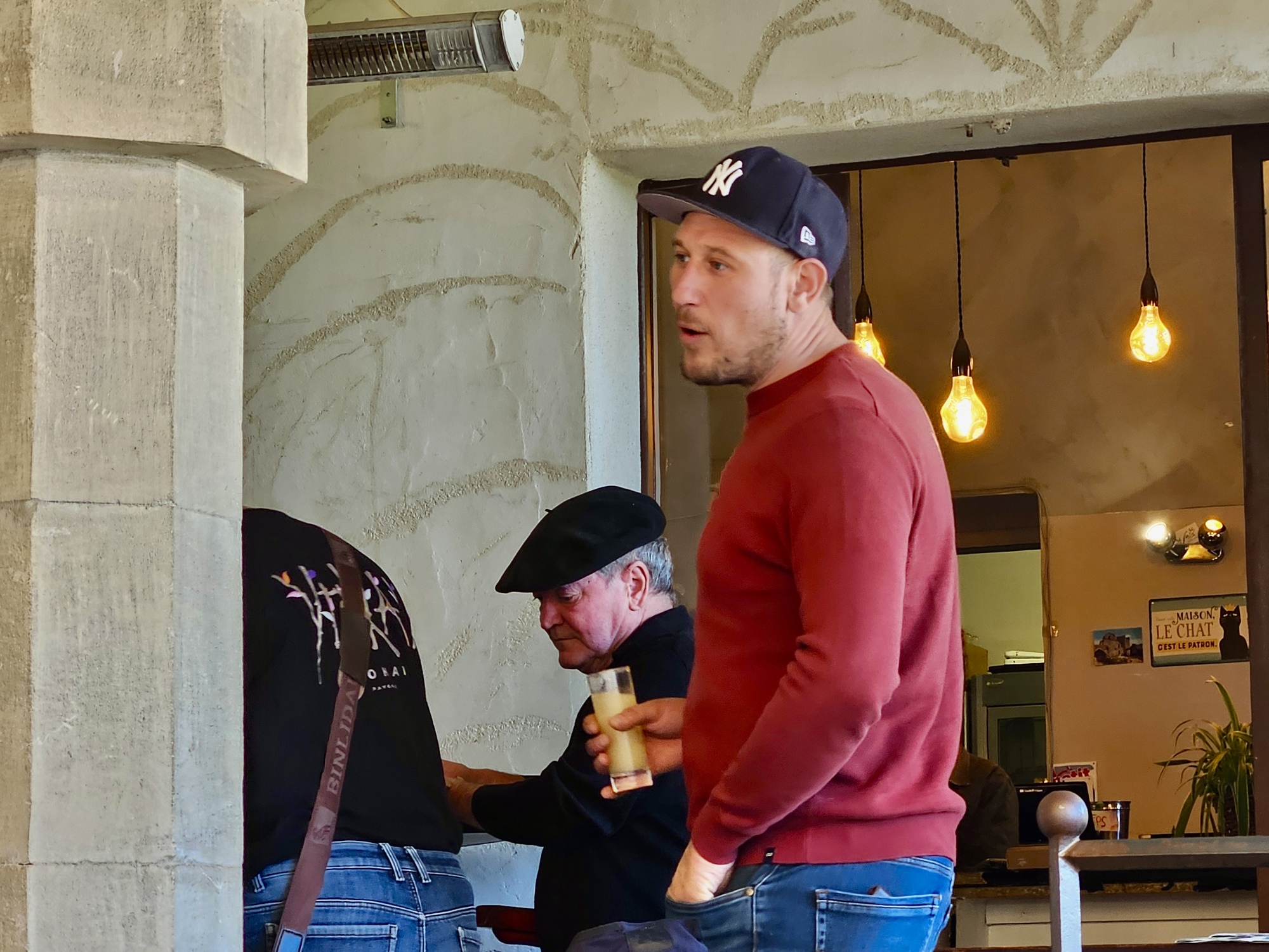 As soon as they enter our waitress comes out to greet them, squatting down to his eye level to chat with the boy - it’s obvious that they know each other well and possibly it’s even his mom, but watching the interactions of the three of them though I think it’s more likely that she’s his dad’s girlfriend. She leaves to go back to work and then the guy goes over to chat with Mr. Beret and his friends, the boy still clinging on and looking up like he’s taking lessons on how to be a proper French villager.
